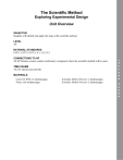 The Scientific Method Exploring Experimental Design Unit Overview OBJECTIVE Students will identify and apply the steps of the scientific method. LEVEL All NATIONAL STANDARDS UCP.1, UCP.2, UCP.3, A.1, A.2, G.2 TIME FRAME Two 45 minute class periods MATERIALS Scientific Method Practice 1 student pages Scientific Method Practice 2 student pages P A G E S Come Fly With Us student pages Penny Lab student pages T E A C H E R CONNECTIONS TO AP All AP Science courses contain a laboratory component where the scientific method will be used. Suggested Teaching Procedure Day 1 1. Present notes on the steps of the scientific method as you see fit. Although this part is teacher directed, ideally the steps should be presented as more of a discussion. Some questions to ask during your discussion include: “What is the variable that the experimenter changes?” “What makes a valid experiment?” “Why is it important to have detailed procedures?” “Why is the control such an important part of the experiment?” 2. After students take notes, pass out the student activity pages for Come Fly With Us. 3. Students should read the directions and perform the prescribed tasks in the procedure, applying there scientific method knowledge. Students should complete and turn in Come Fly with Us before leaving. Day 2 1. After collecting the students’ papers, review the correct answers with the class. 3. After completing the lab, students should turn in a laboratory report before the end of the period. 4. Assign Scientific Method Practice 2 as homework. Students should return the completed assignment the following class period. Day 3 1. After collecting the students’ papers, review the correct answers with the class. P A G E S 2. Pass out the student activity pages for the Penny Lab. Students should read the instructions and perform the lab during class. T E A C H E R 4. Distribute Scientific Method Practice 1, and have students read and answer the questions for homework. Students are to return the completed questions the following class period. TEACHER NOTES Modern scientific inquiry or science (from scientia, Latin for knowledge) is generally attributed to the historical contributions of Galileo Galilei and Roger Bacon. However, some historians believe that their practices were inspired by earlier Islamic tradition. In spite of the rich human tradition of scientific inquiry, today there is no single or universal method of performing science. According to the National Science Teachers Association, science is “characterized by the systematic gathering of information through various forms of direct and indirect observations and the testing of this information by methods including, but not limited to, experimentation.” Although this definition is helpful in explaining the process of science, it does not specify a list of experimental steps that one should logically progress through to perform an experiment. (An experiment can be defined as an organized series of steps used to test a probable solution to a problem, commonly called a hypothesis.) Despite the absence of a standard scientific method, there is a generally agreed upon model that describes how science operates. Steps of the Scientific Method 3. Form a probable solution, or hypothesis, to your problem: Make an educated guess as to what will solve the problem. Ideally this should be written in an if-then format. EXAMPLE: If a female aged 12-14 takes one aspirin per day for 60 days, then her blood pressure will decrease. 4. Test your hypothesis: Do an experiment. EXAMPLE: Test 100 females, ages 12-14, to see if taking one aspirin a day for 60 days lowers blood pressure in those females. Independent Variable (I.V.): The variable you change, on purpose, in the experiment. To help students remember it, suggest the phrase “I change it” emphasizing the Independent variable. EXAMPLE: In this described experiment, taking an aspirin or not would be the independent variable. This is what the experimenter changes between his groups in the experiment. P A G E S 2. Research the problem: The researcher will typically gather information on the problem. They may read accounts and journals on the subject, or be involved in communications with other scientists. EXAMPLE: Some people relate stories to doctors that they feel relief from high blood pressure after taking one aspirin per day. The idea is not scientific if it is untested or if one person reports this (called anecdotal evidence). T E A C H E R 1. State the problem: What is the problem? This is typically stated in a question format. EXAMPLE: Will taking one aspirin per day for 60 days decrease blood pressure in females ages 12-14? Dependent Variable (D.V.): The response to the I.V. EXAMPLE: The blood pressure of the individuals in the experiment, which may change from the administration of aspirin. Control: The group, or experimental subject, which does not receive the I.V. EXAMPLE: The group of females that does not get the dose of aspirin. Constants: Conditions that remain the same in the experiment. EXAMPLE: In this scenario some probable constants would include: only females were used, only females around the same age, the same dosage of aspirin was given to all the individuals in the experimental group for the same defined time interval—60 days, the same brand of aspirin was given, the same type of diet was ideally given to the members of both groups as well as the same activity level prescribed. 7. Repeating the work: Arguably, the most important part of scientific inquiry! When an experiment can be repeated and the same results obtained by different experimenters, that experiment is validated. Included in this unit is a hands-on lab entitled Come Fly with Us. This activity makes a great first day activity to get kids warmed up to the scientific method. They will examine what happens to the spin direction of a paper helicopter when they fold the blades in different directions. Students construct 
