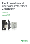 Electromechanical and solid-state relays Zelio Relay Catalogue April 2012 All technical information about products listed in this catalogue are now available on: www.schneider-electric.com Browse the “product data sheet” to check out : characteristics, dimensions, curves, ... and also the links to the user guides and the CAD files. 1 From the home page, type the model number* into the “Search” box. * type the model number without any blank, replace “ ” by “ ” p * 2 Under ”All” tab, click the model number that interests you. 3 The product data sheet displays. Example : Zelio Time data sheet Discover this product Characteritics Functions Connection Dimensions Download & Documents Other products Help me to choose Accessories Plug Sockets p p p p p p p p Example : Zelio Time data sheet 78 80 22,5 89,5 82 Example : Zelio Time data sheet U U C C G G R R t1 t2 t'1 t'2 t1 t2 t'1 t'2 You can get this information in one single pdf file. Reduce the size of your enclosures and, at the same time, increase machine reliability The new Zelio Relay items Electromechanical relays RSL Only 6 mm wide, thus saving considerable space in your enclosures 6 mm wide Solid-state relays SSR Unlimited service life provided by electronic technology Unlimited service life Contents Presentation Choose compactness with Zelio Relay RSL ....................................................................... 4-5 Choose long life and silent operation with Zelio Relay SSR ................................................. 6-7 Electromechanical and solid-state relays panorama ........................................................... 8-9 Catalogue pages Zelio Relay RSL ........................................................................................................................ 10-13 Zelio Relay RSB, RXM, RUM, RPM ................................................................................. 14-31 Zelio Relay ABR, ABS ............................................................................................................ 32-39 Zelio Relay SSR ...................................................................................................................... 40-43 Make the most of your energy 3 Choose compactness with Zelio Relay RSL Only 6 mm wide, thus reducing the size of your enclosures > A solution for any application A complete offer • An offer with maximum flexibility, comprising: - complete products: a single reference for a relay mounted on a socket, - products for customer assembly: select the relay and associated socket according to your application. • Wide choice of sockets available covering a range of voltages from 12 to 230 V. An offer that meets the most demanding standards • Conformity with the European RoHS (Restriction of Hazardous Substances) directive. • Conformity to international standards IEC/EN 61810-1, UL508, CSA C22.2 N°14, GOST. 100% RoHS Schneider Electric commits itself to reducing the environmental impact of its products 4 > Reliability in any situation Protection integrated in the socket The assurance of reliable protection of the relay irrespective of the supply voltage used. LED indicator Power on and relay status LED indicator. «Standard» and «low level» version relays For high breaking capacity or low level current application requirements. Up to 6A breaking capacity > Simplicity of installation and cabling Simple maintaining of relay in socket and its release/removal Using locking/unlocking lever. Simplification of cabling Commoning link available as accessory. Simple mounting on DIN rail Choice of 2 connection techniques Suitable for the majority of your applications. Screw connector Spring terminal 5 Choose long life and silent operation with Zelio Relay SSR > Heat exchange guaranteed The new solid-state relays SSR with SCR (Semiconductor Controlled Rectifier) outputs offer you two alternatives: SSRD range Directly mounted with heat sink to provide heat exchange, they are easily mounted by clipping directly onto DIN rail and can also be panel mounted. SSRP range Panel mounted, either on their own or combined with a heat sink for applications requiring considerable heat exchange. SS RA AS S 08 12E MB H1 LE D IN ME XIC O SSRP relay mounted on heat sink with thermal interface 6 4 > Distinctive indication A green LED on the front face of the products provides instant indication of the relay input status. > High performance High breaking capacities • From 10 to 125 A for relays SSRP • From 10 to 45 A for relays SSRD Wide supply voltage range Unlimited service life due to electronic relay technology • From 3 to 32 VDC and 90 to 280 VAC Outputs suited to applications • From 24 to 280 VAC and 48 to 530/660 VAC Extreme compactness • Only 22.5 mm and up to 45.5 mm wide Unlimited service life • No preventive maintenance, relays SSR have a unlimited service life Silence of electronic technology • Complete silence when switching Insensitive to vibration • Even in the event of excessive vibration, the relay will not change state > Conformity to international standards 100% RoHS Complete silence when switching providing suitability for building and hospital applications High switching frequency particularly on packaging and textile machines Up to 6A breaking capacity Schneider Electric commits itself to reducing the environmental impact of its products 7 Panorama Zelio Relay Electromechanical relays Number CO contacts Current 1 CO 1 or 2 CO 1 or 2 CO 2, 3 or 4 CO 6A 8-12-16 A 5-12 A 6-10-12 A Mounting References Pages Plugs into socket On DIN rail RSL RSB ABR RXM 10 to 13 16 to 17 34 to 37 18 to 21 Electromechanical relay advantages • Wide choice of number of contacts (up to 4) • Easy installation and maintenance: Plug-in relay for socket mounting (universal format) Contact status mechanical indicator and “Relay On” LED indicator Lockable “Test” button for testing relay operation • Electrically separated inputs and outputs