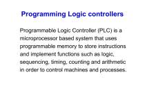 Programming Logic controllers Programmable Logic Controller (PLC) is a microprocessor based system that uses programmable memory to store instructions and implement functions such as logic, sequencing, timing, counting and arithmetic in order to control machines and processes. PLC Features • PLC features can be concluded in the following: • They are rugged, withstand industrial environment, such as heat, humidity, mechanical shocks and vibrations • The interfacing for inputs and outputs is inside the controller • They are easily programmed • PLC is capable of both logic and PID control. Typical PLC Forms of PLCs • First developed in 1968, they are now widely used: • Two types: • 1- Single – box type: for small programmable controllers, is supplied as an integral compact package, complete with power supply, processor, memory and input/output units. Typically they may have 6, 8, 12, or 24 inputs and 4, 8, or 16, outputs and a memory store some 300-1000 instructions. Eg. MELSEC FX3U • 2- Rack mounted type: for all sizing of programming controllers. It consists of separate modules for power supply, processor, input/output, etc. They are mounted on rails with a metal cabinet. E.g. SIMATIC S7-300/400 Input/output processing • PLC is continuously running through its program and updating it as a result of the input signals, each such loop is called a cycle. • Two methods of processing: • 1- Continuous updating 2- Mass updating • continuous updating: • The cpu scanning the input channels as they occur in the program instructions. Each input is examined individually (delay time 3 ms). The output is latched so that they retain their status until the next update Input/output processing Mass input/ output copying: it works in the following process: 1. Scan all the inputs and copy into RAM 2. Fetch and decode and execute all program instruction in sequence, copying output instruction to RAM 3- Once the program is executed, the CPU performs diagnostics and communication tasks 4- update all outputs Repeat the sequence. Input/Output address • The inputs and outputs are identified by their addresses, the notation used depending on the PLC manufacturer. This is the address of the input or output in the memory of the PLC. Its just a number preceded by a letter to indicate whether it is an input or an output • With large PLCs having several racks of input and output and a number of modules in each rack, the rack and modules are numbered and so an input or output is identified by its rack number followed by the number of the module in that rack and the number to show its terminal in the module.: The Allen-Bradley PLC-5 has I: 012/03 to indicate an input in rack 01 at module 2 and terminal 03 PLC In Control Circuits Architecture External Computer Communication Module Microprocessor Input Module PLC Output Module Actuator Sensor Process Architecture of a PLC It consist essentially of: Central processing unit: control all processes with frequency 1-8 M Hz Memory: Buffers as temporary storage, ROM for system data & RAM for user program Input/output interface: System buses Input/output unit • The input/output unit provides the interface between the system and the outside world. • The input/ output interface provides isolation and signal conditioning functions so that sensors and actuators can often be directly connected to them without the need for other circuitry. • Out devices: motors, starting coils, solenoid valve, etc • Input devices: temperature sensors, flow sensors, encoders, etc… Input/output unit Electrical isolation from the external world is usually provided by means of opt isolators. Figure shows the basic form of input channel Figure 21.2 Input channel Input/output unit • The digital signal that is compatible with the microprocessor of the PLC is 5 volt dc however, signal conditioning in the input channel with isolation enables a wide range of input signals to be supplied. Possible input voltages 5V, 24V, 110V, and 240V. • The output to the output unit is digital with a level of 5 V, • Three types of outputs are available: Relay type, Transistor type & triac type Input/output unit • Three types of outputs are available: • Relay type: The signal from the PLC is used to operate a relay and so able to switch currents of a few amperes in an external circuit. The relay isolate the PLC from external world, can be used for AC and DC but they are slow • Transistor type: It is used to switch current through external circuit, fast opto-isolators are used to provide isolation, used only for DC switching • Triac type: used for both AC and DC • Possible output from output channels: 24V,100 mA; 100V dc,1 A; 240V,1A ac; or 240V, 2A ac Inputting Programs Are entered into the input/output from: Small hand- held programming devices, desktop consoles with a visual display or key board and screen Inputting Programs Only when the program has been designed and checked on the programming device is transferred to the memory of the PLC Typical Program memory size is (specified in term of steps) 300 to 1000 step. Program step is an instruction for some event to occur, ex: check status of switch A After developing the program in RAM it may be transferred permanently to the EPROM chip Figure 21.3 (a), (b) Sourcing, (c), (d) sinking Ladder programming The form of programming commonly use with PLC is ladder programming. Each program task is specified as though a rung of a ladder. Thus a rung could specify that the state of switches A and B be examined and if both A and B are closed then a solenoid, the output is energized. Figure 21.4 (a), (b) Alternative ways of drawing an electric circuit, (c) comparable rung in a ladder program Ladder programming The sequence followed by a PLC when carrying out a program: 1- Scan the inputs associated with one rung of the ladder program 2- solve the logic operation involving those inputs • Set/ reset the outputs for that rung 3- mov