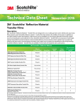 Technical Data Sheet November 2015 3M Scotchlite Reflective Material Transfer Films ™ ™ Description 3M™ Scotchlite™ Reflective Material – Transfer Films are designed for use on safety garments and in athletic and casual wear. When properly used, Scotchlite reflective material – transfer films help enhance the visibility of the wearer in nighttime or low-light conditions when illuminated by a light source such as headlights, by returning the light back toward the original source and reaching the automobile driver’s eye. Scotchlite reflective material – transfer films are composed of wide angle, exposed retroreflective lenses bonded to a heat activated adhesive. Some products contain a plastic liner to protect the adhesive side that must be removed before lamination and a paper liner to protect the retroreflective side during handling. Scotchlite reflective material – transfer films are available in home wash and industrial wash constructions. 3M Scotchlite Reflective Material ™ ™ Home Wash1 5510 Segmented Home Wash Trim 5510M Segmented Home Wash Trim Polyester X 5530 Segmented Industrial Wash Trim Polyester X 5535 Segmented Flame Resistant Trim Polyester X 5807 Custom Cuttable Transfer Film Polyester X X 8711 Silver Graphic-Ready Transfer Film Polyurethane X X 8712 Silver Transfer Film3 Polyurethane X X 8725 Silver Transfer Film and 8725LL Linerless Silver Transfer Film3,4 Polyester X X 8726 Silver Transfer Film and 8726LL Linerless Silver Transfer Film4 Polyester X X 8735 Flame Resistant Transfer Film Polyester X 8786 Fluorescent red-orange Transfer Film Polyester 8787 Fluorescent lime-yellow Transfer Film Polyester 9720 Silver Industrial Wash Transfer Film Polyester X X 9740 Industrial Wash Flame Resistant Transfer Film Polyester X X Product Number Industrial Wash1 Flame Resistant Recommended for Occupational Apparel2 Adhesive (Heat Activated) X X X X X X X X X X 3M™ Scotchlite™ Reflective Material – 8710 Silver Transfer Film has been terminated. Please contact your local 3M Representative for the best replacement product for your application. 1 See Care and Maintenance Instructions section for Home Wash and Industrial Wash conditions 2 Certified to an occupational or industrial clothing standard such as ANSI/ISEA 107-2010 American National Standard for High Visibility Safety Apparel and Headwear or CAN/CSA Z96-09 High Visibility Safety Apparel. Customers should contact 3M Technical Service regarding certifications to specific standards. 3 3M™ Scotchlite™ Reflective Material – 8712 Silver Transfer Film and 3M™ Scotchlite™ Reflective Material – 8725 Silver Transfer Film have “3M” imaged on their silver surface. 4 “LL” denotes that transfer film is sold without a liner on the reflective or adhesive surfaces Retroreflective Performance The coefficient of retroreflection (RA, in cd/lux/m²) of 3M™ Scotchlite™ Reflective Material is measured by methods based on either of the following retroreflective intensity testing procedures: ASTM E809-02 and E810-03 (RA) CIE 54.2:2001 (R’) Reflected color of Scotchlite reflective material – transfer films is white. Retroreflective performance data were generated by 3M and are based on testing new product. The RA values listed in the following tables were measured at +5.0° entrance and 0.2° observation angles. It is important to note that use, wear, laundering, and environmental conditions will affect performance. Please contact your 3M representative for proposed product specifications. Product Certification ANSI/ISEA 107-2010 and CAN/CSA Z96-09 The following 3M™ Scotchlite™ Reflective Material – Transfer Films have certificates available for the ANSI/ISEA 107-2010 American National Standard for High-Visibility Safety Apparel and Headwear for Level 2 retroreflective performance and meet the requirements for CAN/CSA Z96-09 High Visibility Safety Apparel. 3M™ Scotchlite™ Reflective Material that is certified to ANSI/ISEA 107-2010 will also meet the requirements for retroreflective material in ANSI/ISEA 207-2010 American National Standard for High-Visibility Public Safety Vests. 3M Scotchlite Reflective Material ™ ™ Daytime Color Initial Average RA5 Minimum RA6 Washing Cycles7 Dry-Cleaning Cycles8 5510 Segmented Home Wash Trim 5510M Segmented Home Wash Trim Silver >330 330 75 30 5530 Segmented Industrial Wash Trim Silver >330 330 100 50 5535 Segmented Flame Resistant Trim Silver >330 330 65 30 5807 Custom Cuttable Transfer Film Silver 500 330 50 30 8711 Silver Graphic-Ready Transfer Film Silver 500 330 25 25 8712 Silver Transfer Film Silver 500 330 25 25 8725 Silver Transfer Film and 8725LL Linerless Silver Transfer Film Silver 500 330 50 30 8726 Silver Transfer Film and 8726LL Linerless Silver Transfer Film Silver 450 330 50 30 8735 Flame Resistant Transfer Film Silver 500 330 50 50 9720 Silver Industrial Wash Transfer Film Silver 500 330 50 50 9740 Industrial Wash Flame Resistant Transfer Film Silver 500 330 50 0 Product Number 5Measured by 3M on new product at +5.0° entrance and 0.2° observation angles 107-2010 minimum coefficient of retroreflection for Level 2 retroreflective material 7ISO 6330 Method 2A at 60 °C (140 °F) and R ≥ 100 cd/lux/m² (home wash) A 8ISO 3175-2 Method 9.1 and R ≥ 100 cd/lux/m² A 6ANSI/ISEA 2 NFPA and CAN/CGSB The following Scotchlite reflective material – transfer films are flame resistant and certified to NFPA and CAN/CGSB standards as components for fire fighting and technical rescue clothing and equipment, when applied to compliant fabrics such as certain aramids, modacrylics, and FR treated cottons. These standards include: NFPA 1971 Standard on Protective Clothing and Equipment for Structural Fire Fighting and Proximity Fire Fighting, 2007 edition; NFPA 1977 Standard on Protective Clothing and Equipment for Wildland Fire Fighting, 2005 Edition; NFPA 1951 Standard on Protective Ensembles for Technical Rescue Incidents, 2007 Edition, NFPA 211