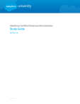 Salesforce Certified Advanced Administrator Study Guide Spring ‘16 STUDY GUIDE Certified Advanced Administrator – Study Guide Contents ABOUT THE SALESFORCE CERTIFIED ADVANCED ADMINISTRATOR PROGRAM .............................................................. 3 SECTION 1. PURPOSE OF THIS STUDY GUIDE ..................................................................................................... 3 SECTION 2. AUDIENCE DESCRIPTION : SALESFORCE CERTIFIED ADVANCED ADMINISTRATOR ............................................ 3 SECTION 3. ABOUT THE EXAM ...................................................................................................................... 4 SECTION 4. RECOMMENDED TRAINING AND REFERENCES ..................................................................................... 4 SECTION 5. EXAM OUTLINE ......................................................................................................................... 5 SECTION 6. SAMPLE EXAM QUESTIONS ........................................................................................................... 6 SECTION 7. ANSWERS TO SAMPLE EXAM QUESTIONS .......................................................................................... 7 SECTION 8. MAINTAINING A CERTIFICATION ..................................................................................................... 7 TRAINING & CERTIFICATION Certified Advanced Administrator – Study Guide About the Salesforce Certified Advanced Administrator Program The Salesforce Certified Advanced Administrator program is designed for individuals who have expertise as a seasoned Salesforce administrator. The program encompasses the breadth of applications, the features and functions available to an end user, and the advanced configuration, management, and application extending options available to an administrator across the Sales Cloud, Service Cloud, and Salesforce Chatter The first credential in the program is the Salesforce Certified Administrator. This credential focuses on the features and functionality used to maintain a Salesforce implementation. The second level in the program is the Salesforce Certified Advanced Administrator. This credential is targeted towards the Salesforce Certified Administrator who has mastered Salesforce configuration maintenance, can demonstrate an understanding of administration best practices, and is able to use the advanced features and functionality to solve a variety of business problems. Section 1. Purpose of this Study Guide This study guide is designed to help you evaluate if you are ready to successfully complete the Salesforce Certified Advanced Administrator exam. This guide provides information about the target audience for the certification program, the recommended training and documentation, and a complete list of exam objectives—all with the intent of helping you achieve a passing score. Salesforce highly recommends a combination of on-the-job experience, course attendance, and self-study to maximize your chances of passing the exam. Section 2. Audience Description: Salesforce Certified Advanced Administrator The Salesforce Certified Advanced Administrator exam is intended for an individual who has significant experience performing as a Salesforce administrator, including hands-on experience applying the skills and concepts noted in the exam outline in Section 5 below. The candidate is a Salesforce Certified Administrator and has successfully completed the Administration Essentials for Experienced Admins (ADM 211) from Salesforce or an Authorized Training Center or possesses the equivalent experience and knowledge. The candidate has also invested time in studying the course materials and additional study materials provided by Salesforce. The candidate should have a broad knowledge of the full application capabilities, the features/functions available to an end user, and the configuration and management options available to an administrator across the Sales Cloud, Service Cloud, and Salesforce Chatter applications. The candidate should be capable of performing administration functions at an expert level, using the full set of Salesforce features as described in the exam outline. The candidate can leverage the advanced administration capabilities of Salesforce to solve specific business challenges and automate complex business processes. The candidate should be able to recommend configuration enhancements and best practices to optimize and extend their organization’s use of Salesforce. The candidate actively seeks out new functionality as it becomes available and evaluates the potential benefits of new features for their organization. The candidate should be able to: Appropriately define record and field data access based on business requirements. Create custom objects and define the appropriate relationship types. Set up and configure Sales Cloud applications including products, price books, schedules, and quotes. Understand the capabilities of Customizable Forecasting and Collaborative Forecasting. Set up and configure Service Cloud applications including Salesforce Knowledge and entitlements. Assess, cleanse, and maintain data quality using standard Salesforce functionality. Set up and configure Salesforce CRM Content. Understand the capabilities of sandboxes and the tools available to move data between environments. Use custom report types, analytic snapshots, complex charting, custom summary formulas, bucketing, joined reports, and cross filters to build reports that meet complex business requirements. TRAINING & CERTIFICATION Certified Advanced Administrator – Study Guide Use dynamic dashboards and dashboard filters to enhance dashboards. Create workflow rules, approval processes, and formula fields to automate complex business processes. Section 3. About the Exam The Salesforce Certified Advanced Administrator exam has the following characteristics: Content: 60 multiple-choice/multiple-select q