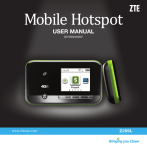 Mobile Hotspot USER MANUAL Z079584505807 www.zteusa.com Z289L Copyright © 2014 ZTE CORPORATION Table of Contents All rights reserved. Getting Started.....................................................................................................1 No part of this publication may be excerpted, reproduced, translated or utilized in any form or by any means, electronic or mechanical, including photocopying and microfilm, without the prior written permission of ZTE Corporation. The manual is published by ZTE Corporation. We reserve the right to make modifications on print errors or update specifications without prior notice. microSDHC logo is a trademark of SD-3C, LLC. Other trademarks and trade names are the property of their respective owners. Introduction..........................................................................................................1 Outline and Parts..................................................................................................1 Indicators..............................................................................................................3 Function Icons......................................................................................................3 Connection Scenario............................................................................................4 Setting Up Your Device........................................................................................5 Charging Your Device...........................................................................................7 Powering On/Off Your Device..............................................................................7 Sleep Mode..........................................................................................................7 Connecting to Your Device...................................................................................8 Navigating Your Device...................................................................................10 Prepaid...............................................................................................................10 Device Info.........................................................................................................10 Connected Devices............................................................................................11 Settings..............................................................................................................11 WPS...................................................................................................................12 Using the WPS...................................................................................................12 Version No.: R1.0 Accessing the Internet.....................................................................................14 Edition Time: March 2014 Configure Your Device on the Web.............................................................15 Accessing the Configuration Page.....................................................................15 NOTE: Do not use the device in an enclosed environment or where heat dissipation is poor. Prolonged work in such space may cause excessive heat and raise ambient temperature, which may lead to automatic shutdown of the device for your safety. In the case of such event, cool the device in a well-ventilated place before turning on for normal use. Navigating Your Web Interface.....................................................................16 Settings.................................................................................................................17 Quick Setup........................................................................................................17 i Table of Contents Marketing Msgs..................................................................................................19 Operating Messages in Your Inbox....................................................................19 Device Settings..................................................................................................20 Wi-Fi ® Settings...................................................................................................21 Firewall...............................................................................................................24 Router Settings..................................................................................................26 Verifying SIM PIN Code......................................................................................27 Resetting Your Device........................................................................................29 Getting Started Introduction ZTE Z289L is a 4G hotspot device, working on WCDMA/HSPA/HSPA+/LTE networks. You can connect your devices to it via Wi-Fi. The device supports data services, enabling you to communicate anytime and anywhere. Outline and Parts The following figure shows the appearance of the device. It is only for your reference. The actual device may be different. Advanced Users............................................................................................... 30 Verifying IP Address and DNS............................................................................30 Setting Up Your White List for Authorized Devices............................................32 Information...........................................................................................................33 For Your Safety...................................................................................................34 To the Owner......................................................................................................34 Using Your Device..............................................................................................34 Battery Handling.................................................................................................35 Limited Warranty....