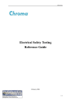 Overview Electrical Safety Testing Reference Guide February 2006 1-1 Electrical Safety Testing Reference Guide Legal Notices The information in this document is subject to change without notice. Chroma ATE INC. makes no warranty of any kind with regard to this manual, including, but not limited to, the implied warranties of merchantability and fitness for a particular purpose. Chroma ATE INC. shall not be held liable for errors contained herein or direct, indirect, special, incidental or consequential damages in connection with the furnishing, performance, or use of this material. CHROMA ATE INC. No. 66 Hwa-Ya 1st Rd., Hwa-Ya Technical Park, Kuei-Shan Hsiang, Taoyuan Hsien, Taiwan Copyright Notices. Copyright 2006 Chroma ATE INC., all rights reserved. Reproduction, adaptation, or translation of this document without prior written permission is prohibited, except as allowed under the copyright laws. 1-2 Electrical Safety Testing Reference Guide Table of Contents 1. Overview ....................................................................................................................1-4 2. Introduction to Global Safety and Directive...........................................................2-1 2.1 2.2 2.3 2.4 2.5 2.6 2.7 3. U.S.A. ................................................................................................................................. 2-1 CANADA .............................................................................................................................. 2-1 EUROPE .............................................................................................................................. 2-1 GERMANY ........................................................................................................................... 2-3 MAINLAND CHINA ............................................................................................................. 2-4 JAPAN.................................................................................................................................. 2-4 SAFETY DEVELOPMENT IN THE FUTURE .......................................................................... 2-5 Electrical Safety Test.................................................................................................3-1 3.1 HIPOT TEST ........................................................................................................................ 3-1 3.1.1 AC/DC Hipot Test ...................................................................................................... 3-2 3.1.2 ARC Test .................................................................................................................... 3-3 3.1.3 Load Regulation ......................................................................................................... 3-3 3.1.4 DUT Load Regulation ................................................................................................ 3-3 3.1.5 Line Regulation .......................................................................................................... 3-3 3.1.6 Ramp Voltage Design................................................................................................. 3-4 3.1.7 Hipot Test 500VA ....................................................................................................... 3-4 3.2 GROUND PROTECTION TEST............................................................................................. 3-5 3.3 INSULATION RESISTANCE TEST ........................................................................................ 3-5 3.4 LEAKAGE CURRENT TEST ................................................................................................. 3-6 4. Test Equipment and Operating Safety ....................................................................4-1 4.1 4.2 4.3 4.4 5. TEST ENVIRONMENT ......................................................................................................... 4-1 TEST EQUIPMENT .............................................................................................................. 4-1 TEST CONNECTION ............................................................................................................ 4-2 TRAINING AND OPERATION NOTICE ITEM FOR PERSONNEL .......................................... 4-2 Safety Test Equipment ..............................................................................................5-1 5.1 5.2 6. HOW TO SELECT THE CORRECT SAFETY TEST EQUIPMENT .......................................... 5-1 AUXILIARY ACCESSORY, FIXTURE AND SOFTWARE ........................................................ 5-1 Industry Application .................................................................................................6-1 6.1 6.2 6.3 6.4 6.5 6.6 7. TRANSFORMER TEST ......................................................................................................... 6-1 GENERATOR/MOTOR TEST ............................................................................................... 6-1 COMPONENT TEST ............................................................................................................. 6-1 NON-ELECTRONIC PRODUCT TEST .................................................................................. 6-1 APPLIANCE PRODUCT TEST .............................................................................................. 6-2 MEDICAL EQUIPMENT TEST ............................................................................................. 6-2 Best Appliance for Safety Test..................................................................................7-1 7.1 7.2 7.3 7.4 7.5 7.6 7.7 7.8 FULL FUNCTION SAFETY ANALYZER - CHROMA 19032 .................................................. 7-1 WOUND COMPONENT SCANNER – 19035 ......................................................................... 7-1 MULTIPLE FUNCTION AND SCAN HIPOT TESTER – CHROMA 1905X ......................