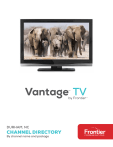 Vantage TV by Frontier DURHAM, NC CHANNEL DIRECTORY By channel name and package FEATURES OF YOUR VANTAGE TV™ BY FRONTIER® REMOTE CONTROL Control Devices with Mode Buttons Initiate Program Recording Stop Program Play Pause Program Play DVR Jump Forward or Backward by Interval Go to the On Demand Library Return to Previous Menu Screen Go to Main Menu Screen Return to Live TV Access Applications (if Applicable) Change Volume Mute Audio Return to Previously Viewed Live TV Channel Edit Text on the Search Screen Power On/Off Devices Rewind or Fast Forward Program Allow Navigation between TV Components (RGB, HDMI, Analog, other) Start or Resume Program Play Go to Recorded TV Programs List View Online Weather, Sports, Stocks and Traffic Navigate Channels, Menus and Screens Select On-Screen Option Display Program Info Screen Change/Page Guide Up or Down Go to Interactive Program Guide Screen Numeric Alpha Text Keypad for Channel and Search Functions Access the Screen Viewing Options UPGRADE TO THIS WINNING COMBO Get the ultimate in entertainment freedom! Our exclusive Wireless Receiver lets you enjoy TV virtually anywhere in your home. Design your room to suit your style—you’re no longer tied to your TV outlet! And our Point Anywhere Remote Control doesn’t require lineal-sight, so it works however you aim it—even through cabinets and walls. Add them both for amazing flexibility and convenience. Go to Frontier.com to order. The Point Anywhere Remote Control is intended and sold for use only with Vantage TV by Frontier receivers. May not be compatible with all entertainment systems or capable of accepting every programming code for other devices. Limited one-year replacement-only warranty. See enclosed User Guide for further information. Go to Frontier.com for details. Technical restrictions apply; may not be available to all customers. ©2016 Frontier Communications Corporation. DURHAM, NC CHANNEL DIRECTORY* Guide Channels Adult Only On Demand DVR App Frontier Account Manager App Vantage TV On Demand 956 9999 9910 1 Vantage TV Local EVINE Live HSN QVC WLFL (CW) WLFL-American Sports Network 19 6 12 22 53 WNCN (CBS) 17 WNCN Antenna TV WRAL (NBC) WRAL-50 (Heroes & Icons) WRAY (IND) WRAY ABN WRAY TCT Family WRAZ (FOX) WRAZ MeTV WRDC-Grit TV WRDC-My Network WRPX (ION) WRPX IONLife WRPX Qubo WTNC (UniMas) WTVD (ABC) WTVD Laff WTVD Live Well WUNC (PBS) WUNC PBS Explorer WUNC PBS Kids WUVC (Univision) 54 5 50 30 60 59 13 64 56 28 47 62 61 26 11 58 57 4 51 52 40 Vantage TV Prime Includes locals, plus these channels: A&E 132 Accuweather 225 AMC 119 American Heroes 259 (fka Military Channel) Animal Planet 252 AWE (fka Wealth TV) 147 BBC America 122 Believers Voice of 226/726 Victory Network BEST 20/430 BET 155 BET Gospel 516 Boomerang 327 Bravo 181 BTN 650 BTN1 659 BTN2 660 C-SPAN 230 C-SPAN2 231 C-SPAN3 232 Cartoon Network 325 Centric 515 Chiller 153 cloo 161 CMT 525 CMT Pure Country 527 CNBC 216 CNN 202 Comedy Central 140 Cooking Channel 456 Crime & Investigation Network 163 Daystar 563 Discovery Channel 120 Discovery Family (fka The Hub) 335 Disney Channel 302 Disney Jr. 306 Disney XD 304 DIY Network 454 E! Entertainment Television 134 ESPN ESPN Classic ESPN2 ESPNews ESPNU Esquire Network Evine 2 EWTN EWTN Espanol FM Food Network Fox Business Network Fox News Channel Fox Sports 1 Fox Sports 2 Freeform FS Carolinas (FS South) FS Southeast (SportsSouth) fuse Fusion FX FX Movie Channel FXX FYI (fka BIO) GAC Galavision Golf Channel GSN VICELAND Hallmark Channel Hallmark Movies & Mysteries HGTV History HLN Hotbuy HSN HSN2 IFC INSP Investigation Discovery Jewelry Television Justice Central Lifetime Television LMN LOGO MC 70s MC 80s MC 90s MC Adult Alternative MC Alternative MC Blues MC Classic Country MC Classic Rock MC Classical Masterpieces MC Contemporary Christian MC Country Hits MC Dance/EDM MC Easy Listening MC Gospel MC Hip-Hop and R&B MC Hip-Hop Classics MC Hit List MC Indie MC Jazz MC Kidz Only! MC Light Classical MC Love Songs MC Max MC Metal MC Mexicana MC Musica Urbana MC Party Favorites MC Pop & Country MC Pop Hits MC Pop Latino MC R&B Classics MC R&B Soul MC Rap MC Reggae MC Rock MC Rock Hits MC Romances MC Singers & Swing 602 603 606 604 605 380 146/646 562 3077 182 452 211 210 651 652 178 745 729 535 206 129 792 128 272 529 3003 641 173 257 117 133 450 256 203 135/435 422 423 797 564 260 197 166 360 362 183 5129 5128 5127 5116 5115 5146 5134 5118 5155 5135 5133 5103 5148 5111 5105 5107 5101 5104 5145 5124 5150 5152 5102 5114 5138 5137 5122 5131 5121 5136 5109 5110 5106 5112 5113 5117 5153 5147 MC Stage & Screen MC Smooth Jazz MC Soft Rock MC Solid Gold Oldies MC Sounds of the Season MC Soundscapes MC Teen Beats MC Throwback Jamz MC Today's Country MC Toddler Tunes MC Tropicales MC Y2K MGM MSNBC MTV MTV Jams MTV Live MTV Tr3s MTV2 mtvU Music Choice Play Nat Geo Wild National Geographic Channel NBC Sports Network NBC Universo (fka mun2) Nick Jr. Nick Music Nick Toons Nick2 Nickelodeon One America News Network OWN Oxygen QVC QVC+ RLTV Science SonLife Broadcasting Network Spike TV Sprout Sundance TV SyFy TBN TBS TCM TeenNick Telemundo The Time Life Channel The Word Network TLC TNT Travel Channel truTV TV Land TV One Universal USA Network Velocity VH1 VH1 Classic WE WGN America 5154 5144 5119 5130 5141 5143 5123 5108 5132 5125 5139 5126 116 215 502 508 505 3142 504 510 5100 266 265 640 3009 320 509 318 316 314 208 170 368 420 421 175 258 580 145 337 798 151 560 112 790 322 204 229 575 250 108 254 164 138 157 105 124 104 518 520 372 180 Vantage TV Extreme Includes everything in Vantage TV Prime, plus these channels: AXS TV Baby First TV BBC World News CBS Sports Network CCTV News (fka CCTV-9) CNBC World CNNI (CNN International) Destination America El Rey FOX Deportes Toku (fka FUNimation) Life (fka Discovery Fit & Health) Lifetime Real Women Military History MLB Network NASA TV NBA TV 102 310 207 643 3602 217 205 465 466 3114 484 468 364 276 634 264 632 NFL Network NHK World NHL Network HD 