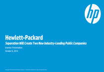 Hewlett-Packard Separation Will Create Two New Industry-Leading Public Companies Investor Presentation October 6, 2014 © Copyright 2014 Hewlett-Packard Development Company, L.P. The information contained herein is subject to change without notice. Safe harbor This presentation contains forward-looking statements that involve risks, uncertainties and assumptions. If the risks or uncertainties ever materialize or the assumptions prove incorrect, the results of HP may differ materially from those expressed or implied by such forward-looking statements and assumptions. All statements other than statements of historical fact are statements that could be deemed forward-looking statements, including but not limited to any statements of the plans, strategies and objectives of HP for future operations, including the separation transaction; the future performance of Hewlett-Packard Enterprise and HP Inc. if the separation is completed; the execution of restructuring plans and any resulting cost savings or revenue or profitability improvements; any projections of revenue, margins, expenses, HP’s effective tax rate, net earnings, net earnings per share, cash flows, benefit plan funding, share repurchases, currency exchange rates or other financial items; any projections of the amount, timing or impact of cost savings or restructuring charges; any statements concerning the expected development, performance, market share or competitive performance relating to products or services; any statements regarding current or future macroeconomic trends or events and the impact of those trends and events on HP and its financial performance; any statements regarding pending investigations, claims or disputes; any statements of expectation or belief; and any statements of assumptions underlying any of the foregoing. Risks, uncertainties and assumptions include the need to address the many challenges facing HP’s businesses; the competitive pressures faced by HP’s businesses; risks associated with executing HP’s strategy, including the planned separation transaction; the impact of macroeconomic and geopolitical trends and events; the need to manage third-party suppliers and the distribution of HP’s products and services effectively; the protection of HP’s intellectual property assets, including intellectual property licensed from third parties; risks associated with HP’s international operations; the development and transition of new products and services and the enhancement of existing products and services to meet customer needs and respond to emerging technological trends; the execution and performance of contracts by HP and its suppliers, customers and partners; the hiring and retention of key employees; integration and other risks associated with business combination and investment transactions; the execution, timing and results of the separation transaction or restructuring plans, including estimates and assumptions related to the cost including any possible disruption of HP’s business and the anticipated benefits of implementing the separation transaction and restructuring plans; the resolution of pending investigations, claims and disputes; and other risks that are described in HP’s Annual Report on Form 10-K for the fiscal year ended October 31, 2013, and HP’s other filings with the Securities and Exchange Commission, including HP’s Quarterly Report on Form 10-Q for the fiscal quarter ended July 31, 2014. As in prior periods, the financial information set forth in this presentation, including tax-related items, reflects estimates based on information available at this time. While HP believes these estimates to be reasonable, these amounts could differ materially from actual reported amounts in HP’s Annual Report on Form 10-K for the fiscal year ended October 31, 2014. HP assumes no obligation and does not intend to update these forward-looking statements. 2 © Copyright 2014 Hewlett-Packard Development Company, L.P. The information contained herein is subject to change without notice. Use of non-GAAP financial information To supplement HP’s historical and forecasted financial results presented on a GAAP basis, HP provides revenue on a constant currency basis, HP’s non-GAAP tax rate, nonGAAP diluted net earnings per share and free cash flow. Definitions of these non-GAAP financial measures and reconciliations of these non-GAAP financial measures to the most directly comparable GAAP financial measures are included elsewhere in this presentation and available in the supplemental information provided at www.hp.com/investor/2014OctAnnouncement/. HP’s management uses revenue on a constant currency basis, HP’s non-GAAP tax rate and non-GAAP diluted net earnings per share to evaluate and forecast HP’s performance before gains, losses or other charges that are considered by HP’s management to be outside of HP’s core business segment operating results. Free cash flow is a liquidity measure that provides useful information to management about the amount of cash available for investment in HP’s businesses, funding strategic acquisitions, repurchasing stock and other purposes. These non-GAAP financial measures may have limitations as analytical tools, and these measures should not be considered in isolation or as a substitute for analysis of HP’s results as reported under GAAP. Items such as amortization of purchased intangible assets, though not directly affecting HP’s cash position, represent the loss in value of intangible assets over time. The expense associated with this loss in value is not included in non-GAAP diluted net earnings per share and HP’s non-GAAP tax rate and therefore does not reflect the full economic effect of the loss in value of those intangible assets. In addition, items such as restructuring charges that are excluded from nonGAAP diluted net earnings per share and HP’s non-GAAP tax rate can have a material impact on cash flows and earnings per s