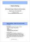 Claims Drafting : Defining the Scope of Search and Examination Kuala Lumpur, November 2011 Dr Wolfgang Tauchert Dr. Presiding Judge (German Fed. Patent Court) ret. 1 Claims Drafting – Claims Form and Function 1) Function Art. 84 EPC: “The The claims shall define the matter for which protection is sought. They shall be - clear, - concise and - supported by the description.” Art. 69(1) EPC: “The extent of the protection conferred by a E European patent t t or a European E patent t t application li ti shall be determined by the terms of the claims. Nevertheless,, the description p and drawings g shall be used to interpret the claims (see also Protocol to Art. 69)”. Tauchert/Kuala Lumpur 2011 2 Claims Function : ((“The The Name of the Game is the Claim”) Claim ) Rule 29(1) (Guidelines C-III, 2.1) „The The claim shall define the matter for which protection is sought in terms of the technical features of the invention“; ( i il in (similar i other th legislations). l i l ti ) 1) Claims define the subject of protection therefore and corresponding (broad/narrow) 2) claims define equally the subject of search and examination, Tauchert/Kuala Lumpur 2011 3 Claims Function : ((“The The Name of the Game is the Claim”) Claim ) Claims shall define the invention by words. i.e. by the technical (structural and/or functional) features of the invention There is no invention outside the claims (even if it were, it wouldn´t matter; this sounds natural, t l b butt is i often ft overseen in i the th process of examination). The skilled person (assessing patentability) has the same level of knowledge and experience in understanding and interpreting the claimed application and the state of the art Tauchert/Kuala Lumpur 2011 4 Form of a Claim Basic structure: - Introducing part (Category, purpose..) - body (specific legal description of the invention by structural and/or functional features) - link (words/phrases like comprising, including, consisting of …. - one part claim - ) or characterized in ((- two p part claim)) Tauchert/Kuala Lumpur 2011 5 Form of a Claim Dependent - / independent claim Formally: with / without reference to another claim within the same category Substantive: Further specification of an independent claim. Important: An independent claim has to p present an independent p solution of the underlying objective problem of the invention. Oth Otherwise: i Lack L k off Unity! U it ! Tauchert/Kuala Lumpur 2011 6 Form off a C Claim One part - / two part claim Dependent - / independent claim Basic types (categories) of claims: 1) Type entity: Product, apparatus, device. 2) Type activity: Process, method, use. Further F th on: Special S i l types, t e.g.: 1st and 2nd medical use, product-byprocess, Markush grouping, disclaimer Tauchert/Kuala Lumpur 2011 7 Form of a Claim: One Part / Two Part (R l 21(1)b EPO G (Rule Guidelines) id li ) One p part claim: Presentation of the essential characteristics of the invention without structure as to state of the Art. Example: „Apparatus comprising features A, B, C, D …..“ Two partt claim: T l i Presentation of the essential characteristics of the invention with a structure according to the state of the art (so far as known) „Apparatus with features A , B, characterized by features C, D …. characterized in that features C C, D …are are comprised. comprised Invention comprises all features of the claim ! Tauchert/Kuala Lumpur2011 8 Form of a Claim: One Part / Two Part - Handling One part claim: Each of the essential characteristics of the invention (= the claim !) has to be referred to in state of the Art, as far as known. Example: „Apparatus comprising features A, B, C, D …..“ p an apparatus pp showing g showing g Doc. 1)) provides feature A; Doc. 2) shows an apparatus with feature C) …. General: If there is no clear single starting document in the state of the art giving the base fort the invention, then a one part claim can be useful and taken into consideration. consideration Invention comprises all features of the claim ! Tauchert/Kuala Lumpur2011 9 Form of a Claim: One Part / Two Part - Example O partt claim: One l i From: Int. Application Nr. PCT/IB2003/005958 1) A Method of producing a soya bean product, product the method including the step of exposing soya beans to an acidic aqueous solution. 2) A method as claimed in Claim 1, 1 in whichthe acidic aqueous solution has a pH of between about 2.0 and 5.5. 3)) A method as claimed in Claim 1 or Claim 2,, in which the soya beans are whole beans 4) A method as claimed in any one of the preceding claims which includes the prior step of dissolving an organic acid in water to produce an aqueous acidic solution. 5) A method as claimed in Claim 4 in which the organic i acid id is i citric it i acid. id Tauchert/Kuala Lumpur2011 10 Form of a Claim: One Part / Two Part - Handling Two part claim: Introductory part – characterizing part C t Category, purpose, generall - specific ifi features f t Link: characterized in ... or characterized by…. The introductory features of the invention are generally supposed to be known to the applicant. (US: definitly state of the art; Europe: Closest st.o.a) the characterizing features form the body of the invention with the specific features to be protected , introduced by „characterized in ….(as far as known) „Apparatus „ pp with features A , B,, characterized by features C, D …. If there is a document in the state of the art giving the clear base for the invention, then a two part claim is to be considered and useful. It should be applied “whenever appropriate” (EPO-practice). Tauchert/Kuala Lumpur2011 11 Form of a Claim: One Part / Two Part - Example Two part claim: 1) A dining table having legs evenly distributed around the periphery of the table top, which legs do not protrude beyond said periphery, characterized in that the table has three legs. 2) A dining table according to Claim 1 characterized in that the legs ar