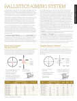 Leupold’s Ballistics Aiming System® is comprised of specialized reticles that take into account the variables crucial to accurate, long-range shooting. The purpose is to help shooters be more effective by learning how to gauge target distance, place your reticle for that distance, and even compensate for wind deflection. The end result is improved accuracy and clean kills. It has proved so successful in helping hunters learn how to shoot accurately at long range, we’ve expanded your BAS options with additional reticles offering many of the same benefits as the original reticles. We’ve also made them available in more riflescopes than ever. With practice, the Ballistics Aiming System will take your accuracy to the next level and let you consistently make shots you wouldn’t have attempted in the past. Accurate, long-range shooting is one of the most difficult hunting skills to master. For many hunters, it remains a combination of hard-won experience, intuition, and a little luck. Together, the reticles of the Ballistics Aiming System give the hunter very useful tools for successful hunts with clean and efficient harvests. By practicing with the Ballistics Aiming System, all hunters can add science to the art of long-range shooting, and master this important skill. The Boone and Crockett® Big Game reticle and the Varmint Hunter’s reticle use the same principles to help you hone your long-range shooting skills, though each has been tailored to meet the needs of big game or varmint hunters. With practice, using each will become a natural part of your shooting. Unlike other range estimating reticles, the calculations made here are incredibly simple, and take the guesswork out of long-range shooting. Each reticle provides a series of aiming points. The first aiming point, the intersection of the Duplex® reticle, is to be used at 200 yards with most common cartridges, and 300 yards with several flatter shooting, longer-range loads. The Boone and Crockett Big Game reticle and Varmint Hunter’s reticle also provide you with two different power selector ring settings, indicated by large and small triangles on the power selector. These allow you to select the hold points best suited to the cartridge you are using. In some cases, the smaller triangle setting can be used with your slower, heavier bullet load, and the large triangle setting with your faster loads in the same rifle. For example, a 30-06 with a 180gr spritzer bullet and 2700 fps muzzle velocity would use the smaller triangle setting. In the same rifle, a 150gr spitzer bullet with 3000 fps muzzle velocity would use the larger triangle. We have designated three sets of cartridges to be used with the large and small triangle settings, and sight-in distances of either 200 or 300 yards, described as Group A (large triangle, 200 yard zero), Group B (small triangle, 200 yard zero), or Group C (large triangle, 300 yard zero). The SA.B.R. reticle also features holdover points and a power selector matched to different load settings for muzzleloaders and shotguns. The LR Duplex® and LRV Duplex® reticles are designed to be used only at the maximum magnification settings. Verify the aiming points by shooting at the actual distances at which the hold points in the reticle are intended to work. With the LR Duplex and LRV Duplex reticles, a shooter can tailor the reticle to his or her load by varying the magnification, thus altering the subtensions. Remember, with all BAS reticles, the most important thing: practice. There’s no substitute for putting in the time to be the best shooter you can be. Boone and Crockett ® Varmint Hunter’s Reticle * Leupold worked closely with the Boone and Crockett Club® to create the first optical product to bear The Club’s name. With practice it will hone your long-range shooting skills, providing precise aiming points for easy-to-remember range increments as well as wind deflection. This reticle system will help you hit small targets at longer ranges than ever. It will help you determine the range to the target, and provide precise aiming points for easy-to-remember range increments, as well as wind deflection. Aiming points are fine lines that won’t obscure small targets at long range. Big Game Reticle* 200 yd 200 yd 300 yd 300 yd 400 yd 400 yd 450 yd 500 yd 500 yd 10 mph shift 10 mph shift + F irst optical product to bear the Boone and Crockett name. + Ideal for small targets at long ranges. + P ower Selector ballistics tuning. + F ine lined German #4-style central aiming point with cross‑wire hold points. + D uplex aiming point with CPC‑style hold points. + T raditional VX-3 range estimating feature between Duplex central aiming point and bottom of the top vertical heavy post. RANGE 200 yd MOA 10 MPH DRIFT — — — 300 yd MOA 2.19 2.74 2.16 300 yd inches 6.88 8.61 6.79 400 yd MOA 4.80 6.00 3.03 400 yd inches 20.11 25.13 12.69 450 yd MOA 6.26 7.83 — 450 yd inches 29.50 36.87 — 500 yd MOA 7.82 40.95 9.78 51.18 — — 200 yd inches 500 yd inches *Available in illuminated and non-illuminated. 20 mph shift + P rairie dog range estimator between the 500 yard and bottom vertical heavy post. + P ower Selector ballistics tuning. POWER SELECTOR VALUES SMALL BULLET DROP LARGE BULLET DROP — BALLISTICS AIMING SYSTEM BALLISTICS AIMING SYSTEM ® — — RANGE POWER SELECTOR VALUES SMALL BULLET DROP LARGE BULLET DROP 10 MPH DRIFT 20 MPH DRIFT 30 MPH DRIFT 200 yd MOA — — 1.77 3.54 5.31 200 yd inches — — 3.71 7.41 11.12 300 yd MOA 1.81 2.26 2.86 5.72 — 300 yd inches 5.69 7.10 8.98 17.97 — 400 yd MOA 4.13 5.16 4.09 8.17 — 400 yd inches 17.30 21.61 17.13 34.22 — 500 yd MOA 7.02 8.78 5.49 10.99 — 36.80 46.00 25.87 51.79 — 500 yd inches 1 BALLISTICS AIMING SYSTEM SA.B.R. ® (SAbot Ballistics Reticle) LR/LRV DUPLEX ® + H oldovers in 50-yard increments to 300 yards. The LR Duplex will assist you with accurate, repeatable, and ethical long‑range shooting. It features a Duplex centr