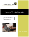 Master of Arts in Education Educational Technology Kevin Winslow, PhD 2014 Handbook Lindenwood University Table of Contents Table of Contents Welcome to Lindenwood University School of Education! ........................................................... 2 Overview of the Program ................................................................................................................ 4 Admission ....................................................................................................................................... 5 Program Planning and Completion ................................................................................................. 6 Course Descriptions ........................................................................................................................ 8 Student Learning Outcomes .......................................................................................................... 10 Field Experience/Internship/Practicum ......................................................................................... 11 Frequently Asked Questions ......................................................................................................... 12 Appendix ....................................................................................................................................... 16 1 Welcome Welcome Welcome to Lindenwood University School of Education! Welcome! Lindenwood University is a thriving institution with a variety of undergraduate and graduate programs with locations across Missouri and Illinois, in addition to online offerings. The School of Education is one of the largest schools at this institution and in the state of Missouri. However, here at Lindenwood, we pride ourselves on our student-centered approach, advising by actual faculty members, and our open door policy so you never feel like a number. The faculty not only has the appropriate academic credentials, but also extensive experience in a wide variety of schools as teachers, counselors, principals, librarians, and leaders at all levels. The faculty is truly vested in providing the best opportunity for all students to succeed. Lindenwood University prides itself in providing a support network for students who need extra assistance in attaining their goals. Lindenwood provides assistance to students through the Student and Academic Support Services (SASS). SASS supports the Lindenwood University student community through academic engagement, problem resolution, service learning opportunities, and provision of resources. We are committed to a studentcentered environment reinforcing retention and persistence to graduation by encouraging academic and individual development, along with social responsibility. Do you already have a master’s degree but still want an additional certification? That is also an option at Lindenwood University. The Master of Arts in Education programs offer opportunities for teachers and professionals to improve their practice in many different areas of study including: Teaching English to Speakers of Other Languages (TESOL) Library Media Special Reading K-12 Gifted Education Certification Special Education K-12 2 Character Education Autism Spectrum Disorders K-12 Early Interventions in Autism and Sensory Impairments Educational Technology Mathematics Education Specialist 1-6 School Administration 3 Program Overview Program Overview The Master of Arts in Education with an emphasis in Educational Technology program prepares graduate students to assume roles of leadership in instructional technology settings in school, business, and industry. The emphasis is in equipping students to leverage technology in order to facilitate instruction in a wide variety of settings. Graduates will acquire technical and research skills involving equipment, software, web-based applications, current issues, trends, theories, and principles of instructional design. The program is delivered entirely online, allowing students to earn their degree remotely and according to schedules convenient to them. In addition, most of the courses are offered in an eight-week format, allowing students to complete the 33-hour program at an accelerated pace; therefore, students can complete the program in less than two years while never taking more than two courses at a time. 4 Admission Program Admission Admission Standards Lindenwood University consciously seeks a diverse student body and welcomes applicants from all socioeconomic, religious, and ethnic backgrounds. The University also values geographic diversity and welcomes international students. Admission to graduate programs is granted to students who demonstrate academic preparedness and the potential for academic excellence. Applications for admission to Lindenwood University graduate programs will reviewed by the Director of Evening Admissions and Dr. Kevin Winslow. Application Procedures Apply by visiting the Office of Evening and Graduate Admissions at the Lindenwood University Welcome Center on the St. Charles campus, any of the extension centers, or online at the following address: https://applylu.lindenwood.edu/login.asp To be considered for admission to the University, an applicant’s file must include each of the following documents: • • • • Electronic or paper application, along with a non-refundable $30 application fee. Current resume. An official undergraduate transcript as well as official transcript(s) from any graduate school(s) attended if transfer credit is desired. A copy of applicant’s valid teaching certificate. Model II Specialty Area: Educational Technology Model II programs do not lead to additional certification. These programs allow the student to develop extensive expertise in a specific content area. The student and the faculty advisor will design a comprehensive program in the content area. The program includes four core courses required of all graduate students in educati
