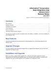 Informatica® Corporation Data Integration Hub Version 9.6.2 Release Notes June 2015 Copyright (c) 1993-2015 Informatica Corporation. All rights reserved. Contents New Features. . . . . . . . . . . . . . . . . . . . . . . . . . . . . . . . . . . . . . . . . . . . . . . . . . . . . . . . . . . . . . . . . . . . . . . . . . . . . . . . . . 1 Upgrade Changes. . . . . . . . . . . . . . . . . . . . . . . . . . . . . . . . . . . . . . . . . . . . . . . . . . . . . . . . . . . . . . . . . . . . . . . . . . . . . . 1 Installation and Upgrade. . . . . . . . . . . . . . . . . . . . . . . . . . . . . . . . . . . . . . . . . . . . . . . . . . . . . . . . . . . . . . . . . . . . . . . . 1 Fixed Limitations. . . . . . . . . . . . . . . . . . . . . . . . . . . . . . . . . . . . . . . . . . . . . . . . . . . . . . . . . . . . . . . . . . . . . . . . . . . . . . . 3 Known Limitations. . . . . . . . . . . . . . . . . . . . . . . . . . . . . . . . . . . . . . . . . . . . . . . . . . . . . . . . . . . . . . . . . . . . . . . . . . . . . . 3 Informatica Global Customer Support. . . . . . . . . . . . . . . . . . . . . . . . . . . . . . . . . . . . . . . . . . . . . . . . . . . . . . . . . . . . . 6 This document contains important information about main features, installation, and known limitations for Data Integration Hub. New Features For a list of new features and enhancements in Data Integration Hub, see the Data Integration Hub Release Guide. Upgrade Changes For a list of behavior and functionality changes after you upgrade Data Integration Hub, see the Data Integration Hub Release Guide. Installation and Upgrade Before you install or upgrade Data Integration Hub, verify that your system meets the minimum requirements and follow the pre-installation steps. For information about installing or upgrading Data Integration Hub, see the Data Integration Hub Installation and Configuration Guide. DIH-RLN-96000-0001 1 Installation and Upgrade Limitations Issue Description XE-10798 When you install Data Integration Hub in a Windows operating system, if you clear all the options in the Installation Components page and then navigate to the previous page, Installation Directory, you cannot navigate from the Installation Directory page back to the Installation Components page. Workaround: Verify that at least one component is selected on the Installation Components page before you leave the page. XE-10575 When you upgrade to version 9.6.2 and your publication repository runs on a Microsoft SQL Server, if partitioning was previously enabled on the repository but is disabled at the time of the upgrade, if you re-enable partitioning after the upgrade, the partitioning function contains a datetime data type and you cannot create topics in Data Integration Hub. Workaround: Before you re-enable partitioning on the repository, delete all Data Integration Hub partition functions. For example: DIH__DATE_PARTITION_FUNCTION. XE-9809 When you install Data Integration Hub on a Windows Operating system, if you install the Data Integration Hub client plugin for PowerCenter component and define a custom ODBC connection string, the string, user name, and password that you define during the installation are not saved to the plugin. When you create custom workflows, event status names are not loaded into PowerCenter Designer. Workaround: Take one of the following steps: - Enter the string, user name, and password in the following file: <DIHInstallationDir>/powercenter/pluginVERSION/dxplugin.xml - Manually enter event status names in PowerCenter Designer. 2 XE-8373 On an existing Data Integration Hub installation where you changed your configuration files since the installation, when you add components to Data Integration Hub using the Data Integration Hub installer, the Data Integration Hub installer does not present the configuration data that you modified after the original installation during the component installation. Workaround: Verify that the data that the installer presents during component installation is correct, and correct it if required. XE-6870 When you install or uninstall Data Integration Hub on IBM AIX operating systems in console mode, an error message might appear with the following text: Hostname and service name not provided or found. Workaround: Ignore the error message. XE-6569 When you install Data Integration Hub on IBM AIX 6.1 operating systems, an error message might appear with the following text: Unzip: not found. Workaround: Ignore the error message. DIH-RLN-96000-0001 Fixed Limitations Review the Release Notes of previous releases for information about previous fixed limitations. Issue Description XE-10071 The Dashboard is not supported on IBM AIX operating systems. XE-9911 When the following settings are enabled in the dx-configuration.properties file, the pmrep process does not end if Data Integration Hub crashes: - pwc.pmrep.use.process.pool - pwc.pmrep.process.pool.max Note: To end the pmrep process, enable the system property dih.onstartup.clean.stale.pmrepinstances. XE-8527 The first time that you test connections in Data Integration Hub, the test might fail with an error. Workaround: Wait one minute and then test the connection. If the test fails after you wait a few seconds, delete the folder DIH__SYSTEM_WORKFLOWS in PowerCenter, and then test the connection. XE-7482 You can only use the default Data Integration Hub schema to connect to data sources and data targets. Workaround for Oracle databases only: If you don't want to use the default schema to which Data Integration Hub connects, in the connection properties, append the following string to the connection string: ALTER SESSION SET CURRENT_SCHEMA=<schema name> You must define an identical schema in the following fields: - In the Metadata Access section, in the Connection String field. - In the Data Access section, in the Environment SQL field. Known Limitations CR Description XE-10849 For topics where the structure of a topic contains columns