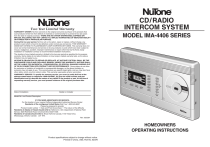 Two Year Limited Warranty WARRANTY OWNER: NuTone warrants to the original consumer purchaser of its products that such products will be free from defects in materials or workmanship for a period of two (2)) years from the date of original purchase. THERE ARE NO OTHER WARRANTIES, EXPRESS OR IMPLIED, INCLUDING, BUT NOT LIMITED TO, IMPLIED WARRANTIES OF MERCHANTABILITY OR FITNESS FOR A PARTICULAR PURPOSE. CD/ RADIO INTERCOM SYSTEM MODEL IMA-4406 SERIES During this two year period, NuTone will, at its option, repair or replace, without charge, any product or part which is found to be defective under normal use and service. THIS WARRANTY DOES NOT EXTEND TO FLUORESCENT LAMP STARTERS OR TUBES. This warranty does not cover (a) normal maintenance and service or (b) any products or parts which have been subject to misuse, negligence, accident, improper maintenance or repair (other than by NuTone), faulty installation or installation contrary to recommended installation instructions. The duration of any implied warranty is limited to the two year period as specified for the express warranty. Some states do not allow limitation on how long an implied warranty lasts, so the above limitation may not apply to you. NUTONE’S OBLIGATION TO REPAIR OR REPLACE, AT NUTONE’S OPTION, SHALL BE THE PURCHASER’S SOLE AND EXCLUSIVE REMEDY UNDER THIS WARRANTY. NUTONE SHALL NOT BE LIABLE FOR INCIDENTAL, CONSEQUENTIAL OR SPECIAL DAMAGES ARISING OUT OF OR IN CONNECTION WITH PRODUCT USE OR PERFORMANCE. Some states do not allow the exclusion or limitation of incidental or consequential damages, so the above limitation or exclusion may not apply to you. This warranty gives you specific legal rights, and you may also have other rights, which vary from state to state. This warranty supersedes all prior warranties. WARRANTY SERVICE: To qualify for warranty service, you must (a) notify NuTone at the address stated below or telephone 1/800-543-8687, (b) give the model number and part identification and (c) describe the nature of any defect in the product or part. At the time of requesting warranty service, you must present evidence of the original purchase date. Date of Installation Builder or Installer Model No. and Product Description IF YOU NEED ASSISTANCE OR SERVICE: For the location of your nearest NuTone Independent Authorized Service Center: Residents of the contiguous United States Dial Free 1-800-543-8687 Please be prepared to provide: Product model number • Date and Proof of purchase • The nature of the difficulty Residents of Alaska or Hawaii should write to: NuTone Inc. Attn: Department of National Field Service, 4820 Red Bank Road, Cincinnati Ohio 45227-1599. Residents of Canada should write to: Broan-NuTone Canada, 1140 Tristar Drive, Mississauga, Ontario, Canada L5T 1H9. Rev. 03/2001 HOMEOWNERS OPERATING INSTRUCTIONS Product specifications subject to change without notice. Printed in China, 3/03, Part No. 62378 FCC INFORMATION This equipment has been tested and found to comply with the limits for a Class B digital device, pursuant to Part 15 of the FCC Rules. These limits are designed to provide reasonable protection against harmful interference in a residential installation. This equipment generates, uses and can radiate radio frequency energy and, if not installed and used in accordance with the instructions may cause harmful interference to radio communications. However, there is no guarantee that interference will not occur in a particular installation. If this equipment does cause harmful interference to radio or television reception, which can be determined by turning the equipment off and on, the user is encouraged to try to correct the interference by one or more of the following measures: -- Reorient or relocate the receiving antenna. -- Increase the separation between the equipment and receiver. -- Connect the equipment into an outlet on a circuit different from that to which the receiver is connected. -- Consult the dealer or an experienced radio/TV technician for help. FCC Warning - This equipment may generate or use radio frequency energy. Changes or modification to this equipment may cause harmful interference unless the modifications are expressly approved in the instruction manual. The user could lose the authority to operate this equipment if an unauthorized change or modification is made. FCC Warning - Changes or modifications not expressly approved by the party responsible for compliance could void the user’s authority to operate the equipment. The serial number of this product may be found behind the lower operating doors. No others have the same serial number as yours. You should record the number and other vital information here and retain this book as a permanent record of your purchase to aid identification in case of theft. Date of Purchase Dealer Purchased from Dealer’s Address Dealer’s Phone No. Model No. IMA-4406 IMPORTANT This product has many functions and controls. Please read entire operating instructions before using this product. 2 Table of Contents Page Illustration of Model IMA-4406 . . . . . . . . . . . . . . . . . . . . . . . . . . . . . . . . . . . . . . . . . . . . 4 Master Station Controls. . . . . . . . . . . . . . . . . . . . . . . . . . . . . . . . . . . . . . . . . . . . . . . . . . 5 Digital Clock . . . . . . . . . . . . . . . . . . . . . . . . . . . . . . . . . . . . . . . . . . . . . . . . . . . . . . . . . . . 6 Setting the Time . . . . . . . . . . . . . . . . . . . . . . . . . . . . . . . . . . . . . . . . . . . . . . . . . . . . . 6 Radio Timer . . . . . . . . . . . . . . . . . . . . . . . . . . . . . . . . . . . . . . . . . . . . . . . . . . . . . . . . 6 Setting Radio ON Time . . . . . . . . . . . . . . . . . . . . . . . . . . . . . . . . . . . . . . . . . . . . . . . 6 Setting Radio OFF Time . . . . . . . . . . . . . . . . . . . . . . . . . . . . . . . . . . . . . . . . . . . . . . 6 Enabling/Disabling the Radio Timer . . . . . . . . . . . . . 