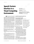 SpeechlGesture Interface to a ViSua[-CompUting Environment rh recent y<,;irs have witnessed progress in 3D inincl-sivc A l t tremeiidous houb display and virtual reality, the col-i-cspniidinghumaocom~xiterinieraction (HCI) tccliiiologics havc lagged hehind. Current intcrfaces involve licavy headsets, dataglovcs, tctticrs, and o ~ h c virtual r reality devices, which may detcr or distract the user. 'To fully cxploil VR's potential for visualizing and interacting with cooiplcx information, uscrs m u s t bc ahlc IU iiiteract with tlic virlual display in a inorc na~uralway (seethe "Hatid gesturcs" sidchar uii tlic iicxt pagc). I n this article, we dcscrilic a bimodal spccch/gcsturc interface, which we liavc integrated in a 3D visualconipnling environment used Iiy strnctural biologists. This interface leis researchers intcract with 31) graphical ohjccls in aviruial ciiviroiiiiieni urin~:spoken words and simple, free haiid gcsturcs. Tlic rcason wc uscd a parlicular virmal cnviruoment cootext was to set the occessary cuiistraiiits to iilabe o w analysis roliust and to develop a command language that o p h a l l y conihioes speech and gesture inputs. Our intcrfacc uses E anlomatic speech recngnition (ASR), aided by a microphone, to rccogiiizc voice co~iimands; E two slralegically posi~ioocdcaincras to detccl hand gcsuircs: and E automatic gesture recngnitioii (AGK), a SCL OS coniputer-vision techniques, to interpret thosc hand gcstnres. The coinputer vision algoritlims can cxlracl the iiscr's hand lrom Ihc Iiackground, dctecl diffcreot finger p s i lions, and clistiiiguish mcaninglul gcsuircs lrnm iniiiitcntional hand i ~ ~ o v c ~ i i e o t ~ . Our main goalwas to siniplifyniodcl maiiipulationand reiidcring 10 inakc bioinulccular modcling more playful. Kesearchcrs can explore variations uf their niodel arid cuiicciitratc on bioiiiolecular aspects of their task without undue distractioii Iiy coiiiptitational aspects, They can view simulations oiniolccular rlyiiamics, play w i ~ hdiffcrccnt co~iibioalionsof iiiu~ccu~ar striichlrcs, alld Iiettcr OZ72~I7161001$10.000 2 0 0 0 IFEE Rajeev Sliarma Perin*ylvania State University Micllael UniversityofSouthernC[il~ornia Zeller Vladiiiiir I. Pavlovic. Thomas S. Huane. I, Zion Lo. Stcpheti Chu, Yuiixin Zhao, James C. Phillips, and Klaus Scliulten University of Illinois, Urhaiin-Cliampaign undersmnd tlic molcculcs' iniportanl properties. A poteritial hencfit, for example, might he reducing the time to discover iicw conipounds lor ncw drugs. Virtual environment testbed 'I'lic 'I'lieorciical HiophysicsCroup at the Univcrsiiy of Illinois, Urbana-Champaign, huilt the virtual cnvironmeot we are using: MIIScopc. MUScopc is a set 01imcgratcd sollwarc cumpuncots that allows simulation and visualization of Iiiomolecular systems in structnralbiology. As Pigurc 1 (ilex1 page) shows, three separate p a c k ages, which maybc uscd individually or togcthcr, constilulc the MDScope eiivirniimeiit:' We developed a speech/ gesture interface that uses visual hand-gesture analysis and speech recognition to control a 3D display in VMD, a virtual environment for Molecular Dynamics) program, a iiiolccular-dyiiaiiiics program structural biology. that rims iii pxallel on varinus architcclurcs a n d upcrating systems. E Thc VMD (Visual Molecular I)ynamics) program, a ninlcciilar~vistializalionprogram thal displays both siatic molecular SLrucLiii-cs and dynamic molccnlar motion, as computed Ihy programs such as NAMI). E Tlic MDComm (MolccnlarDyximics Communication) sortware, which provides ai cfficient iiieiiiis of conimunication bctwccn VMII am1 NAMII and ICIS VMD act as agr;iphic;il user interface toNAMD. Using NAMT) as a conipulalional cnginc, VMU iiscs MDComm t o provide an interface lor interaclive scuip and display o l a inolccola~--dy~ialamics siiiiulatioiis on 11 remote supercoliiputer or high-perforiiiaocc worlcstat ion. E Thc NAMD (Numerical Analysis The NAMD program Molccular-dynamics calculations tire computatioiially vcry expensive and require large amounts of iiieiiiory to store the ~iiolectiI~r striictiirc, coordinates, and alo~ii~io-atom inrcraclion lists. The challcngc is to IEEE Computer Graphics and Applications 29 Feature Article - _ _ I _ ~ Hand Gesturer The communication mode that seems most relevant for manipulating physical objects is hand motion, also called hand gestures. People use this mode t o act on the world, to grasp and explore objects, and to express ideas. Virtual objects, unlike physical objects, are under computer control. Psychological experiments indicate that people prefer to use speech and hand gestures in a virtual environment so that they can interact without special training or special apparatus and concentrate more on the virtual objects and the tasks a t hand.' Several experimental systems study different aspects of this multimodality. One of the earliest was the "Put-That-There" system,' where a frame-based integration architecture fused spoken input and magnetically tracked 3D hand gestures. More recently, the QuickSet system integrated voice input with pen-based gestures t o control military simulation^.^ Other systems include VisualMan.' Virtual-World, Artificial Life Interactive Video Environment,s and Smart Rooms.6 To interact naturally in a VR environment, users need as few devices attached to them as possible. However, most demonstrated gesturelspeech systems use some hand-held device or instrumented glove, which is often tethered with cables that connect the device to a computer. This hinders user ease i n interacting with the computer-controlled environment. A highly specialized application domain, such as simulation of surgery in a VR environment, might justiiy using such devices, but these cumbersome interface tools deter the everyday user. This problem has L [ A r5Fzi; -1 The VMD program, coupled with the NAMD program a MDComm. These facilities comprise MDScope, a oblem-solvingenvironment for structural biology. ternal speechl