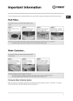 Important Information For your Condenser dryer to operate efficiently, you must follow the regular maintenance schedule shown below: GB Fluff Filter... ! You MUST clean the fluff filter after EVERY drying cycle. STEP 1. Open the door of your dryer. STEP 2. Pull out the filter (using the two finger grips). STEP 3. Clean any fluff deposits from the filter mesh. STEP 4. Refit the filter - NEVER run the dryer without the filter in position. ! Failure to clean the filter after EVERY drying cycle will affect the drying performance of your machine. - It will take longer to dry and as a result will use more electricity during drying. Water Container... ! You MUST empty the water container after EVERY drying cycle. STEP 1. Pull the water container towards you and remove it fully from the dryer. STEP 2. Empty all the water collected in the water container. STEP 3. Refit the water container, ensuring that it is pushed fully back into position. ! Failure to empty the water container will result in: - The machine will stop heating (so the load may still be wet at the end of the drying cycle). - The ‘Empty Water’ light will illuminate to tell you that the water container is full. Priming the Water Collection System When your dryer is new, the water container will not collect water until the system is primed... this will take 1 or 2 drying cycles. Once primed it will collect water during every drying cycle. 1 Important Information GB Condenser Unit... ! You MUST clean the fluff from the condenser EVERY month. STEP 1. Open the condenser cover - hold the handle and pull towards you. STEP 2. Remove the condenser by rotating the 3 clips then pulling the condenser towards you. (There may be some water in the tubes, this is normal). ● STEP 4. Refit the condenser unit - ensure that the unit is pushed in fully, all 3 clips are re-secured and the positiong arrows on the front of the condenser are pointing upwards. Check that: - The positioning arrows are pointing upwards. - The 3 clips are re-secured back into their ‘lock’ position. Rotate 3 clips ! Failure to clean the condenser could cause premature failure of your dryer. 2 STEP 3. Flush the condenser, from the rear with water, to remove any fluff deposits. Instruction booklet TUMBLE DRYER GB Contents English Installation, 4 GB Door reversal instructions Where to put your dryer Ventilation Water drain Electrical connection Before you start using your dryer Dryer description, 5 The front The back Control panel Start and programmes, 6 Choosing a programme IS70C Laundry, 7-8 Sorting your laundry Wash care labels Special clothing items Drying times Warnings and Suggestions, 9 General safety Disposal Saving energy and respecting the environment Maintenance and Care, 10 Switching off the electricity Cleaning the filter after each cycle Empty the water container after each cycle Check the drum after each cycle Cleaning the condenser unit Cleaning the dryer Troubleshooting, 11 Service, 12 Spare parts ! Keep this instruction booklet on hand in order to refer to it when necessary. Take it with you when you move, and should you sell this appliance or pass it on to another party, make sure that this booklet is supplied along with the dryer so that the new owner may be informed about warnings and suggestions on how the appliance works. ! Read these instructions carefully; the following pages contain important information on installation and suggestions on how the appliance works. 3 Installation GB Where to put your dryer Electrical connections Place your dryer at a distance from gas ranges, stoves, heaters, or cook tops because flames can damage the appliance. Minimum gap 10mm ● If you are going to install the appliance under a work counter, be sure to leave a 10mm space between the Minimum gaps top and any other objects 15mm on or above the machine and a 15mm space between the sides and lateral furnishings or walls. This is to ensure proper air circulation. ! Make sure that the back vents are not obstructed. Make sure of the following before you insert the plug into the the electrical socket: ● Ventilation When the dryer is in use, there has to be adequate ventilation. Make sure you put your dryer in an environment that is not damp and has proper air circulation throughout. Airflow around the dryer is essential to condense the water produced during the washing, the dryer will not operate efficiently in an enclosed space or cupboard. ! If using the dryer in a small or cold room some condensation could be experienced. ! We do not recommend that the dryer is installed in a cupboard but the dryer must never be installed behind a lockable door, a sliding door or a door with a hinge on the opposite side to that of the dryer door. Door Reversal Instructions Hinge Door catch Door latch Ensure your hands are dry. The socket must be grounded. ● The socket must be able to sustain the machines maximum power, which is indicated on the rating label (see Dryer Description). ● Power voltage must be within the values indicated on the rating label (see Dryer Description). ● The socket must be compatible with the dryers plug. Should this not be the case, replace the plug or the socket. ! Do not use extension cords. ! The dryer must not be installed outdoors, even if the space is sheltered. It can be very dangerous if it is exposed to rain or storms. ! Once installed, the dryers electrical wire and plug must be within easy reach. ! The power cord must not be bent or squashed. ! The power cord supplied is fitted with a BS1363 plug and a 13 amp BS1362 fuse. If you need to replace the fuse, use only those rated at 13 amp (13A) and ASTA approved to BS1362. ● ● Moulded plug ! The plug must not be used without the fuse cover in place. If a replacement fuse holder/cover is required, it must be of the same colour coding or wording as shown on the base of the plug. Replacements are available from authorised dealers. Changing the plug The wires in the power cord are coloured i