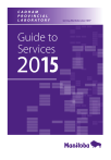 CADHAM PROVINCIAL L ABOR ATORY Guide to Services 2015 Serving Manitoba since 1897 CADHAM PROVINCIAL LABORATORY MANITOBA HEALTH Location: Cadham Provincial Laboratory 750 William Avenue Winnipeg, Manitoba Telephone: 204-945-6123 Fax: 204-786-4770 Email: cadham@gov.mb.ca Website: www.gov.mb.ca/health/publichealth/cpl Mailing Address: Cadham Provincial Laboratory P.O. Box 8450 Winnipeg, Manitoba R3C 3Y1 December 2011 Revised March 2013 (electronic version only) Revised November 2014 (electronic version only) Revised October 2015 (electronic version only) 1 TABLE OF CONTENTS Responsibilities ……………………………………………………………………………………4 Senior Staff …………………………………………………………………………………………5 Abbreviations Used …………………………………………………………………………………6 General Guide to Laboratory Use ………………………………………………………………7 Biohazard Response Team ………………………………………………………………………11 Outbreak Response Support ……………………………………………………………………12 Sexual Assault Protocol …………………………………………………………………………15 Needlestick Injury Protocol………………………………………………………………………16 1.0 Technical Support Services …………………………………………………………………17 1.1 1.2 1.3 1.4 1.5 1.6 1.7 Specimen Submission Requirements ……………………………………………17 1.1.1 Requisition Requirements ………………………………………………17 1.1.4 Transport of Specimens …………………………………………………19 1.1.2 1.1.3 Specimen Labeling Requirements ……………………………………18 Newborn Screening and Maternal Serum Screening ………………19 Specimen Rejection Policy ………………………………………………………20 Packaging and Transport of Specimens…………………………………………21 Transporting Specimens to CPL …………………………………………………22 Transport Supplies …………………………………………………………………26 Transport Media (TM) ……………………………………………………………27 Trans-shipping of Specimens by CPL……………………………………………27 2.0 Clinical Microbiology …………………………………………………………………………28 2.1 Specimen Collection ………………………………………………………………29 2.1.1 Abscesses ………………………………………………………………30 2.1.4 Bullae, Cellulitis, Petechiae, Vesicles …………………………………31 2.1.2 2.1.3 2.1.5 2.1.6 2.1.7 2.1.8 2.1.9 2.1.10 2.1.11 2.1.12 2.1.13 2.1.14 2.1.15 2.1.16 2.1.17 2.1.18 2.1.19 Blood for Culture …………………………………………………………30 Body Fluids ………………………………………………………………30 Cerebrospinal Fluid………………………………………………………31 Cervix and Endometrium ………………………………………………32 Conjunctiva ………………………………………………………………32 Nasopharynx ……………………………………………………………33 Nose ………………………………………………………………………33 Pus…………………………………………………………………………33 Skin ………………………………………………………………………34 Sputum ……………………………………………………………………34 Stool, Feces, Rectal ……………………………………………………34 Throat ……………………………………………………………………35 Transtracheal Aspirate …………………………………………………35 Vagina ……………………………………………………………………35 Urethra ……………………………………………………………………35 Mid-Stream Urine ………………………………………………………36 Wounds……………………………………………………………………36 2 2.2 STI Bacteriology ……………………………………………………………………37 2.3 Reference Microbiology……………………………………………………………39 2.4 2.5 2.6 2.2.1 2.2.2 Gonorrhea ………………………………………………………………37 Chlamydia…………………………………………………………………38 Antibiotic Susceptibility Testing …………………………………………………40 Reporting ……………………………………………………………………………41 Clinical Microbiology Turnaround Times…………………………………………41 3.0 Serology - Parasitology ………………………………………………………………………43 3.1 Serology Tests………………………………………………………………………44 3.1.1 3.1.2 3.1.3 3.1.4 3.1.5 3.1.6 3.2 3.3 3.4 3.5 3.6 3.7 3.1.7 Hepatitis B Testing Guidelines …………………………………………44 Galactomannan (Gm) Antigen Test ……………………………………45 Interferon Gamma-Release Assay (IGRA) for Latent Tuberculosis Infection (LTBI) …………………………46 Viral Load (NAAT) Testing and Genotyping …………………………46 3.1.4.1 3.1.4.2 HBV, HCV and HIV Viral Loads ……………………………47 HIV 1/2 and HTLV-I-II Provirus Testing ……………………47 Syphi