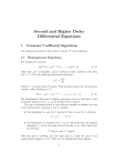Second and Higher Order Differential Equations 1 Constant Coefficient Equations The methods presented in this section work for nth order equations. 1.1 Homogeneous Equations We consider the equation: a0 y (n) (t) + a1 y (n−1) (t) + · · · + an y(t) = 0 (1.1.1) where the ai are real numbers, and we attempt to find a solution of the form y(t) = ert . (Note the following notational convention: y (n) dn y := n dt while y n := y raised to the nth power.) This attempt leads to the characteristic equation (after dividing by ert ): P (r) := a0 rn + a1 rn−1 + · · · + an−1 r + an = 0 . (1.1.2) The Fundamental Theorem of Algebra guarantees that we will have n (not necessarily distinct) roots, ri , of our characteristic equation. The type of solutions which we get will now depend on whether the root of our characteristic equation is real or complex. • Corresponding to a real root r̃ repeated ℓ times we get the ℓ solutions: er̃t , ter̃t , . . . , tℓ−1 er̃t . • Corresponding to a complex root λ + iµ, we will always have its complex conjugate λ − iµ (we are using the fact that the ai are real), and we get the solutions eλt sin(µt) and eλt cos(µt) . With this kind of problem, the only hard part is to find the zeros of our characteristic equation (1.1.2) . Here are two helpful facts from algebra: 1 1. If the ai are integers, and p/q is a rational root, then p is a factor of an and q is a factor of a0 . 2. If r̃ is a root of P (r), our characteristic polynomial, then r − r̃ is a factor of P (r). In other words, there is a polynomial Q(r) (which can be found by long division) such that (r − r̃)Q(r) = P (r). (This fact is called The Factor Theorem in some Precalculus texts.) Now the degree of Q is smaller than the degree of P, so it will probably be easier to find the roots of Q. 1.2 Nonhomogeneous Equations Now we consider the equation: a0 y (n) (t) + a1 y (n−1) (t) + · · · + an y(t) = g1 (t) + · · · + gm (t) (1.2.1) where the ai are real numbers, and each function gi (t) is the product of some combination of 1. t to a positive whole number power, 2. e to a constant times t, and 3. a sine or cosine of a constant times t. We attempt to solve equation ( 1.2.1) by guessing the form of the answer. This method is called the method of undetermined coefficients. Rather than completely random guesswork we have some guides: 1. We can solve (1.2.1) by adding our solutions to the m separate problems: a0 y (n) (t) + a1 y (n−1) (t) + · · · + an y(t) = gi (t) . 2. We never guess a sine without a cosine and vice versa. 3. If A0 tℓ f (t) is the leading term of our guess, then we should guess A0 tℓ f (t) + A1 tℓ−1 f (t) + · · · + Aℓ−1 tf (t) + Aℓ f (t). 4. Now if any of the terms of our guess are in fact solutions to the homogeneous problem (i.e. (1.1.1) ), then we adjust our guess by multiplying it by t to a power large enough to ensure that all of the terms of our new guess will NOT be solutions of the homogeneous problem (1.1.1) . 2 2 Nastier Equations Now we will present some methods to solve some nastier equations. 2.1 Variation of Parameters If p, q, and g are continuous on the open interval I, and if y1 and y2 are linearly independent solutions of the homogeneous equation y ′′ (t) + p(t)y ′ (t) + q(t)y(t) = 0 , (2.1.1) then ∫ Y (t) = −y1 (t) y2 (t)g(t) dt + y2 (t) W (y1 , y2 )(t) ∫ y1 (t)g(t) dt W (y1 , y2 )(t) (2.1.2) will be a solution of the inhomogeneous equation y ′′ (t) + p(t)y ′ (t) + q(t)y(t) = g(t) . (2.1.3) Of course this method assumes that you have already found two linearly independent solutions, y1 and y2 . 2.2 When the Dependent Variable Is Missing For a 2nd order ODE of the form y ′′ (t) = f (t, y ′ ) , (2.2.1) the substitution v = y ′ , v ′ = y ′′ leads to the 1st order ODE v ′ (t) = f (t, v) . (2.2.2) y (n) (t) = f (t, y (n−1) , y (n−2) , . . . , y (n−m) ) , (2.2.3) In general, if we have where n − m > 0, then the substitution u = y (n−m) will simplify things. (It will reduce the order from n to m.) 2.3 Euler Equations We consider the equation: t2 y ′′ (t) + αty ′ (t) + βy(t) = 0. 3 (2.3.1) The trick to solving this equation is to introduce the change of variables x = ∵ ln(t) (so dx = 1t ), and use the chain rule (and a bunch of scratch paper ⌣ ) dt to derive the following equation relating y and x : y ′′ (x) + (α − 1)y ′ (x) + βy(x) = 0. (2.3.2) In this last equation we have y as a function of x, not t, and the derivatives are with respect to x, not t. Now we have a constant coefficient equation whose solution, say y(x) = c1 y1 (x) + c2 y2 (x), is easy to find. Our solution to (2.3.1) is then y(t) = c1 y1 (ln(t)) + c2 y2 (ln(t)) . (2.3.3) Now for those of you who want practice with the chain rule, and those mathematicians among you who don’t want to accept stuff on faith, here is the derivation: We use the chain rule in the following form: d dg dg dx g(x(t)) = g ′ (x(t))x′ (t) or = · dt dt dx dt with g = y and then again with g = dy . dx (2.3.4) Since x = ln(t) we get: dy dy dx dy 1 = · = · dt dx dt dx t [ ] [ ] d2 y d dy d 1 dy = = · dt2 dt dt dt t dx (2.3.5) [ ] 1 dy 1 d dy =− 2 · + · by the product rule t dx t dt dx [ =− 2 1 dy 1 d y dx · + · · t2 dx t dx2 dt (2.3.6) ] by the chain rule with g = dy dx 1 dy 1 d2 y + · . =− 2 · t dx t2 dx2 Now we substitute into (2.3.1) : d2 y dy 0 = t · 2 + αt · + βy dt dt ] [ ] [ 1 d2 y 1 dy 1 dy 2 + · + αt · =t − 2 · + βy t dx t2 dx2 t dx 2 = y ′′ − y ′ + αy ′ + βy = y ′′ + (α − 1)y ′ + βy . 4 (2.3.7) 2.4 Reduction of Order Suppose that we have one solution, y1 (t) (not identically zero), of y ′′ (t) + p(t)y ′ (t) + q(t)y(t) = 0 . (2.4.1) To find a second solution, we let y2 (t) := v(t)y1 (t). Substituting into (2.4.1) yields 0 = y1 v ′′ + (2y1′ + py1 )v ′ + (y1′′ + py1′ + qy1 )v = y1 v ′′ + (2y1′ + py1 )v ′ . (2.4.2) So by letting u := v 