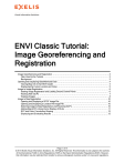 ENVI Classic Tutorial: Image Georeferencing and Registration Image Georeferencing and Registration Files Used in this Tutorial Background Opening and Displaying Georeferenced Data Viewing Map Info in the ENVI header Displaying the Cursor Location and Value Image to Image Registration Starting Image Registration and Loading Ground Control Points Working With GCPs Warping Images Image to Map Registration Opening and Displaying a SPOT Image File Opening and Displaying a Landsat TM Image File Selecting Image-to-Map Registration and Restoring GCPs Adding Map GCPs Using Vector Display of DLGs RST and Cubic Convolution Warping Displaying and Evaluating Results 2 2 2 4 4 5 6 6 7 8 10 10 10 10 11 12 12 Page 1 of 14 © 2014 Exelis Visual Information Solutions, Inc. All Rights Reserved. This information is not subject to the controls of the International Traffic in Arms Regulations (ITAR) or the Export Administration Regulations (EAR). However, this information may be restricted from transfer to various embargoed countries under U.S. laws and regulations. Image Georeferencing and Registration This tutorial provides basic information about georeferenced images in ENVI® Classic and provides a starting point for conducting image-to-image and image-to-map registration using ENVI Classic. It assumes that you are already familiar with general image-registration and resampling concepts. This tutorial is designed to be completed in about 1 to 2 hours. Files Used in this Tutorial Download data files from the Exelis website. File bldr_sp.img (.hdr) bldr_tm.img (.hdr) bldr_tm.pts bldrtm_m.pts bldr_rd.dlg File bldr_tm1.wrp bldr_tm2.wrp bldr_tm3.wrp bldr_tm4.wrp bldr_tm5.wrp bldrtm_m.img (.hdr) (.hdr) (.hdr) (.hdr) (.hdr) (.hdr) bldrtmsp.img (.hdr) Description Boulder SPOT georeferenced image subset Non-georeferenced Boulder TM data GCPs for TM-SPOT image-to-image registration GCPs for TM-Map registration Boulder roads DLG Description Image-to-image result using RST and nearest neighbor Image-to-image result using RST and bilinear interpolation Image-to-image result using RST and cubic convolution Image-to-image result using 1st degree polynomial and cubic convolution Image-to-image result using Delaunay triangulation and cubic convolution Image-to-map result using RST and cubic convolution for the Boulder TM data Boulder TM/SPOT sharpening result using HSV sharpening, 10 meter pixels Background ENVI Classic provides full support for georeferenced images in numerous predefined map projections including UTM and State Plane. In addition, ENVI Classic’s user-configurable map projections allow construction of custom map projections utilizing 30 standard projection types. In addition to the projections listed in Table D-8, ENVI Classic also reads any projection type from a geodatabase or Esri® layer file. See ArcGIS® Help for a full list of supported projections, or refer to the Tech Tip “Esri® Projection Engine Reference v1.0” on the Exelis VIS website. ENVI Classic map projection parameters are stored in an ASCII text file map_proj.txt that you can edit or modify using ENVI Classic map projection utilities. The information in this file is used in the ENVI header files associated with each image and allows simple association of a reference pixel location with known map projection coordinates. Selected ENVI Classic functions can then use this information to work with the image in georeferenced data space. Page 2 of 14 © 2014 Exelis Visual Information Solutions, Inc. All Rights Reserved. This information is not subject to the controls of the International Traffic in Arms Regulations (ITAR) or the Export Administration Regulations (EAR). However, this information may be restricted from transfer to various embargoed countries under U.S. laws and regulations. ENVI Classic’s image registration and geometric correction utilities allow you to reference pixel-based images to geographic coordinates and/or correct them to match base image geometry. Ground control points (GCPs) are selected using the Image and Zoom windows for both image-to-image and image-tomap registration. Coordinates are displayed for both base and uncorrected image GCPs, along with error terms for specific warping algorithms. Next GCP point prediction allows simplified selection of GCPs. Warping is performed using resampling, scaling and translation (RST), polynomial functions (of order 1 through n), or Delaunay triangulation. Resampling methods supported include nearest-neighbor, bilinear interpolation, and cubic convolution. Comparison of the base and warped images using ENVI Classic’s multiple dynamic overlay capabilities allows quick assessment of registration accuracy. The following sections provide examples of some of the map-based capabilities built into ENVI Classic. For more detailed information, see the ENVI Classic Help. Page 3 of 14 © 2014 Exelis Visual Information Solutions, Inc. All Rights Reserved. This information is not subject to the controls of the International Traffic in Arms Regulations (ITAR) or the Export Administration Regulations (EAR). However, this information may be restricted from transfer to various embargoed countries under U.S. laws and regulations. Opening and Displaying Georeferenced Data 1. From the ENVI Classic main menu bar, select File > Open Image File. 2. Select bldr_sp.img and click Open. The Available Bands List appears. 3. From the Available Bands List, select the Georeferenced SPOT band and click Load Band to load the image into a new display group. Viewing Map Info in the ENVI header 1. In the Available Bands List, right click on the Map Info icon and select Edit Map Information. The Edit Map Information dialog appears. This dialog lists the basic map information used by ENVI Classic in georeferencing. The image coordinates correspond to a reference pixel used by ENVI Classic as the starting point for the map coordinate system. Because ENVI Classic knows the map projection, pixel size, and map 