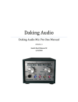 Daking Audio Daking Audio Mic Pre One Manual VERSION 1.5 Hendrik David Gideonse XIX 11/15/2010 Safety Considerations 1. Read, follow and keep these instructions. 2. Heed all warnings. 3. Do not use this equipment in or near water. Do not place liquids on or near the device because the device might be damaged during a spill. 4. Clean only with a soft dry cloth. 5. Do not block any ventilation openings. Install in accordance with the manufacturer’s instructions. 6. Use only Daking supplied power supplies to prevent damage to your device or create safety hazards. 7. Do not install near any heat sources such as radiators, heat registers, stoves, or other apparatus (including amplifiers) that produce heat. 8. Do not defeat the safety purpose of the polarized or grounding-type plug. A polarized plug has two blades with one wider than the other. A grounding-type plug has two blades and a third grounding prong. The wide blade or the third prong are provided for your safety. If the provided plug does not fit into your outlet, consult an electrician for replacement of the obsolete outlet. 9. Protect the power cord and all connecting cables from being walked on or pinched particularly at plugs, receptacles, and the point where they exit from the device. 10. Only use attachments/accessories specified by the manufacturer. 11. Unplug this device when unused for long periods of time. 12. Refer all servicing to qualified service personnel. Servicing is required when the apparatus has been damaged in any way, such as when a power-supply cord or plug is damaged, liquid has been spilled or objects have fallen into the apparatus, the apparatus has been exposed to rain or moisture, does not operate normally, or has been dropped. 13. Do not overload wall outlets and extension cords as this can result in a risk of fire or electric shock. 2 Contents 1 Daking Audio Mic Pre One ........................................................................................ 4 1.1 About Daking Audio ............................................................................................ 4 1.2 Quick Start Guide ................................................................................................. 4 1.2.1 Don’t read the manual! ................................................................................. 4 1.2.2 Basic Set Up .................................................................................................. 5 1.3 The Power Supply ................................................................................................ 5 1.4 Back Panel ............................................................................................................ 5 1.4.1 In General: XLR Connectors and ¼” TRS Connectors ................................ 6 1.4.2 Microphone Input (XLR) .............................................................................. 6 1.4.3 Instrument Input (¼”) ................................................................................... 7 1.4.4 Line Output (XLR and ¼” TRS)................................................................... 7 1.4.5 Power Supply Connection............................................................................. 7 1.5 Front Panel ........................................................................................................... 7 1.5.1 LED VU and Peak Meter .............................................................................. 7 1.5.2 The HPF (High Pass Filter) Knob ................................................................. 8 1.5.3 The Gain Knob .............................................................................................. 9 1.5.4 ¼” Instrument Input Jack ............................................................................ 10 1.5.5 ¼” Button .................................................................................................... 10 1.5.6 Pad Button................................................................................................... 10 1.5.7 +48 Button .................................................................................................. 10 1.5.8 Ø Phase Button ........................................................................................... 11 1.6 Signal Flow: Patching Into and Out of Your Mic Pre One ................................ 11 1.6.1 Microphone to Mic Pre One to Audio Interface or Mixer .......................... 11 1.6.2 Via a Patch Bay........................................................................................... 11 1.7 Specifications ..................................................................................................... 13 3 1 Daking Audio Mic Pre One 1.1 About Daking Audio Congratulations! You’ve purchased a Mic Pre One, a very high end piece of gear! The Mic Pre One uses all discrete transistor Class A circuits, THAT Corporation differential amp and printed circuit board mounted switches. Signal capacitors are precision polypropylene or ultra low-leakage electrolytic types. Our boards are assembled on a mil-spec assembly line. The chassis are stainless steel for maximum RF and hum rejection and a long lasting finish. Every unit is hand finished, tested, burned in, and tested again in a second facility. Also, we just couldn’t stand to use plastic knobs, so we designed our own anodized, engraved aluminum knobs that give a much more precise and quality feel. We designed our gear to be gear you’d own for life, not some passing fancy you’d leave in the dust once you figured what the good stuff sounds like. This IS the good stuff. -Geoff Daking 1.2 Quick Start Guide 1.2.1 Don’t read the manual! Most of you will already know how to use mic preamps perfectly well and might be even a little offended at the idea of reading the instruction manual. So don’t read it. This manual is not for you. This manual is for someone that knows enough to buy the very best (Daking of course!), but doe