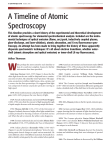 32 Spectroscopy 21(10) w w w. s p e c t r o s c o p y o n l i n e . c o m October 2006 A Timeline of Atomic Spectroscopy This timeline provides a short history of the experimental and theoretical development of atomic spectroscopy for elemental spectrochemical analysis. Included are the instrumental techniques of optical emission (flame, arc/spark, inductively coupled plasma, glow-discharge, and laser-ablation), atomic absorption, and X-ray fluorescence spectroscopy. An attempt has been made to bring together the history of these apparently disparate spectrometric techniques: It’s all about electron transitions, whether outershell (atomic absorption and optical emission) or inner-shell (X-ray fluorescence). Volker Thomsen W hile perhaps the most extensive such timeline to date, it is surely not complete. Sources for further information have been provided. 1786: American astronomer and instrument maker David Rittenhouse (1732–1796) produces the first primitive diffraction grating with parallel hairs laid across two screws. 1666: Isaac Newton (1642–1727) (Figure 1) shows that the white light from the sun could be dispersed into a continuous series of colors. He coined the word “spectrum.” His apparatus, an aperture to define a light beam, a lens, a prism, and a screen, was the first spectroscope. He suggested that light was composed of minute corpuscles (particles) moving at high speed. 1802: English scientist William Hyde Wollaston (1766–1828) is the first to observe dark lines in the spectrum of the sun. 1678: Dutch mathematician and physicist Christian Huygens (1629–1695) proposes the wave theory of light. 1826: Scotsman William Henry Fox Talbot (1800–1877) observes that different salts produce colors when placed in a flame. 1729: French mathematician and scientist Pierre Bougeur (1698–1758) notes that the amount of light passing through a liquid sample decreases with increasing sample thickness. 1752: Thomas Melville (1726–1753) of the University of Glasgow, Scotland, observes a bright yellow light emitted from a flame produced by burning a mixture of alcohol and sea salt. When the salt is removed, the yellow color disappears. 1814: The German optician Joseph von Frauenhofer (1787–1826) invents the transmission diffraction grating and makes a detailed study of the dark lines in the solar spectrum. 1851: M.A. Masson produces the first spark-emission spectroscope. 1852: German scientist August Beer (1825–1863) publishes a paper showing that the amount of light absorbed was proportional to the amount of solute in aqueous solutions. 1760: German mathematician and scientist Johann Heinrich Lambert (1728–1777) publishes his “Law of Absorption.” 1859: The German physicist Gustav Robert Kirchoff (1824–1887) and chemist Robert Wilhelm Eberhard von Bunsen (1811–1899) (Figure 3) discover that spectral lines are unique to each element. 1776: Italian physicist Alessandro Volta (1745–1827) (Figure 2) uses his “perpetual electrophorus” device for producing static electric charges to spark various materials. He notes different colors with different materials. Eventually he is able to identify certain gases by the colors emitted when sparked. 1860–1861: Kirchoff and Bunsen discover the elements cesium and rubidium using their new technique of spectral analysis. 1861: The element thallium is discovered by Sir William w w w. s p e c t r o s c o p y o n l i n e . c o m October 2006 21(10) Spectroscopy 33 Figure 1: Sir Isaac Newton. Figure 2: Alessandro Volta. Figure 3: Gustav Kirchoff (left) and Robert Bunsen. Crookes (1832–1919) (Figure 4) using the method of spectral analysis. the (complex) spatial structure of the atomic emission within the high-voltage spark-induced plasma is a function of the concentration of the emitting element. Furthermore, he shows that improved quantitation is possible by comparing the analyte emission with that of another element in the sample (an early example of “internal standardization”). 1863: The element indium is discovered by German professor of physics Ferdinand Reich (1799–1882) and German metallurgical chemist Theodor Richter (1824–1898), also by the method of spectral analysis. 1877: L.P. Gouy introduces the pneumatic nebulizer for transferring liquid samples into a flame. 1868: The element helium is discovered through its characteristic spectral lines in the spectrum of the sun. The discovery was made independently by French astronomer Pierre Janssen (1824–1907) and English astronomer Joseph Norman Lockyer (1836–1920). It was named for the Greek term for sun, Helios. (Note: Lockyer is knighted shortly after this discovery. Also, he founded the journal Nature in 1869. See also 1873–1874.) 1868: Swedish physicist Anders Jonas Ångström (1814–1874) (Figure 5) publishes a detailed study of the wavelengths of solar spectral lines, expressed in units of 1010 meters. This unit is now known as the angstrom (Å). He is considered one of the fathers of modern spectroscopy. 1869: Ångström produces the first reflection grating. 1873–1874: Sir Joseph Norman Lockyer (see 1868) (Figure 6) observes that Circle x 1882: American physicist Henry A. 34 Spectroscopy 21(10) w w w. s p e c t r o s c o p y o n l i n e . c o m October 2006 Figure 4: Sir William Crookes. Figure 5: Anders Ångström. Figure 6: Sir Joseph Lockyer. Rowland (1848–1901) (Figure 7)produces greatly improved (curved) diffraction grating using his new grating “ruling machine” at Johns Hopkins University (Baltimore, Maryland). Gratings produced in his laboratory became the standard throughout the world. fessor, shows that the wavelengths of the visible spectral lines of hydrogen could be represented by a simple mathematical formula. These lines are now known as the Balmer series of hydrogen. physics for his discovery (1901). 1882: W.N. Hartley of Dublin conducts a systematic study of change in spectral line intensity with concentration. Later, he 