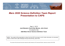 Mars 2020 Science Definition Team Report: Presentation to CAPS Sept. 4, 2013 Jack Mustard, David Des Marais, John Grant On behalf of the 2020 Mars Rover Science Definition Team NOTE: The content of this presentation is drawn from the SDT SDT’ss text report report, and for further information information, the interested reader is referred there (http://mepag.jpl.nasa.gov/reports/mep_report.html). The content of this document has been cleared for public release by JPL Document Review, clearance number CL#13-2766 Mars 2020 Science Definition Team Report: Part 1. Introduction, Context, Constraints, A Assumptions, ti and d Objective Obj ti A Jack Mustard, Brown University NOTE: The content of this presentation is drawn from the SDT SDT’ss text report report, and for further information information, the interested reader is referred there (http://mepag.jpl.nasa.gov/reports/mep_report.html). The content of this document has been cleared for public release by JPL Document Review, clearance number CL#13-2766 Seeking signs of past life Prepare for human exploration Two major in situ science objectives Coordinated, nested context and fine-scale measurements Returnable cache of samples Coring C i system Efficient surface operations, one Mars-year lifetime M lif ti 9/9/2013 Geologically diverse site of ancient habitability MSL heritage rover Improved EDL for landing site access 2020 Mars Rover Science Definition Team 3 The SDT envisions a 2020 Mars Rover mission that would: • Conduct Rigorous In Situ Science – Geologic Context and History Carry out an integrated set of sophisticated context, contact and spatially-coordinated contact, spatially coordinated measurements to characterize the geology of the landing site – In Situ Astrobiology Using the geologic context as a foundation, find and g chance of characterize ancient habitable environments, identifyy rocks with the highest preserving signs of ancient Martian life if it were present, and within those environments, seek the signs of life • Enable the Future – Sample Return Place carefully and rigorously-selected samples in a returnable sample cache as the most scientifically, technically, and economically compelling method of demonstrating significant technical progress toward Mars sample return – Human Exploration Conduct a Mars-surface Mars surface critical ISRU demonstration to prepare for eventual human exploration of Mars – Technology Demonstrate technology required for future Mars exploration • Respect Current Financial Realities – Utilize MSL-heritage design and a moderate instrument suite to stay within the resource constraints specified by NASA 9/9/2013 2020 Mars Rover Science Definition Team 4 Recap ecap of o SDT S Process ocess a and d Key Concepts Scientific Theme Highest Priority Science Goal Next Step To Achieve Highest Priority Science Goal Mars 2020 Science Definition Team Task 9/9/2013 NASA’s Mars Exploration Program Scientific Theme: Seeking Signs of Life (Decadal Survey, MEPAG, etc.) Following the MSL, MAVEN, ExoMars, and InSight missions, to address in detail the questions of habitability & the potential origin and evolution of life on Mars. (Planetary Decadal Survey–Mars Chapter) To explore on the surface an ancient site relevant to the planet’s early habitability with sophisticated context, contact, and spatially coordinated measurements in order to perform detailed exploration of sites on Mars that could reveal past habitability and biosignature preservation potential. With this overarching g strategy gy in mind,, to define detailed objectives, measurements, payload options and priorities & an integrated mission concept for a 2020 rover mission to address: A. B B. C. D. past habitability, potential t ti l biosignature bi i t preservation, ti progress toward sample return, & contributed technology/human exploration payloads. 2020 Mars Rover Science Definition Team 6 A B C D Explore an astrobiologically relevant ancient environment on Mars to decipher its geological processes and history history, including the assessment of past habitability. 1 Launch in 2020 2 Instrument cost nominal limit of $100M (including margin/reserves) ~$80M for SMD instruments Assess the biosignature preservation potential within the selected geological environment and search for potential biosignatures. Demonstrate significant technical progress towards the future return of scientifically selected, well-documented samples to Earth. Provide an opportunity for contributed Human Exploration & Operations Mission Directorate (HEOMD) or Space Technology Program (STP) participation, compatible with the science payload and within the mission’s payload capacity. capacity Note: The phrasing of Objectives A and B above is modified slightly from that given in the SDT charter, and the analysis in this package is organized along the lines of the above objectives statements. 9/9/2013 ~$20M for contributed elements Surface operations costs and science support equipment (e.g., arm) not included in the above limits 3 Utilize MSL Sky Crane EDL flight systems and Curiosity-class roving capabilities Address potential value and cost for improving access to high-value science landing sites 4 Mission lifetime of one Mars year (~690 Earth days) 5 Mission pre-project will provide additional constraints on payload mass, volume, data rate, and configuration 2020 Mars Rover Science Definition Team 7 Deciphering geologic processes and history and assessing habitability: In situ science results 1. Provides science results in its own right 2. Lays the foundation for objective B (Assessing potential for preservation of biosignatures, and seeking potential biosignatures) 3. Lays the foundation for objective C (careful selection of wellp for MSR)) documented samples 9/9/2013 2020 Mars Rover Science Definition Team Essential scientific foundation for MSR science results 8 Organics Raw Materials Energy gy Macro Structures/ Textures Stromatolite (macroscale 