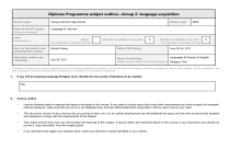 Diploma Programme subject outline—Group 2: language acquisition School name Canyon del Oro High School Name of the DP subject Language B: German School code 6955 (indicate the language) Level (indicate with X) Name of the teacher who completed this outline Date when outline was completed Higher Standard completed in two years (not applicable for languages ab initio) X Standard completed in one year * X (not applicable for languages ab initio) Wendi Ousley Date of IB training June 20-24, 2011 July 25, 2011 Name of workshop Languages B Generic in English (indicate name of subject and workshop category) Category One * All Diploma Programme courses are designed as two-year learning experiences. However, up to two standard level subjects, excluding languages ab initio and pilot subjects, can be completed in one year, according to conditions established in the Handbook of procedures for the Diploma Programme. 1. If you will be teaching language B higher level, identify the two works of literature to be studied N/A 2. Course outline – Use the following table to organize the topics to be taught in the course. If you need to include topics that cover other requirements you have to teach (for example, national syllabus), make sure that you do so in an integrated way, but also differentiate them using italics. Add as many rows as you need. – This document should not be a day-by-day accounting of each unit. It is an outline showing how you will distribute the topics and the time to ensure that students are prepared to comply with the requirements of the subject. – This outline should show how you will develop the teaching of the subject. It should reflect the individual nature of the course in your classroom and should not just be a “copy and paste” from the subject guide. – If you will teach both higher and standard level, make sure that this is clearly identified in your outline. Topic Contents (as identified in the IB subject guide) State the topics in the order you are planning to teach them. Year 1 Leisure (OPTION) 1. Travelling (holidays) 2. Social interaction through leisure (talking about popular European vacation sites) Global Issues (CORE) 1. International Economy (The European Union) Leisure (OPTION) 1. Travelling (planning a trip to a German speaking state, travel brochure) 2. Social interaction through leisure (youth hostel, Pension, Gasthof, Hotel) Customs and Traditions (OPTION) Social Relationships (CORE) Allocated time One class is 60 minutes. In one week there are 5 classes. August/September AP essay topics, cloze exercises, directed responses, and story telling based on pictures. Speaking: Role play Plan a trip to a German speaking country with a thematic focus: eco-friendly, historical, artistic, musical, scientific, mathematical, or technological. September/October Text handling skills: travel brochures and articles on tourism. Read and discuss text types. Keep a notebook (will be checked later) of formats and examples. Create a travel blog and write a review for the accommodations. Performance: Demonstration speech and finished product. 1. Food (meal planning) 2. Celebrations and social events (picnic) 3. Historical events (Kulturstadt Europas) 4. The Arts (poetry) 1. Self-identity (man vs. self) 2. Family relationships (blended families and conflict) Assessment instruments to be used Analyse a piece of German Romantic Poetry from late 1700 – early 1800s. October/November Text handling skills: written responses to the questions presented about the novel. Read fashion report. What information is included in Resources List the main resources to be used, including information technology if applicable. Topic Contents (as identified in the IB subject guide) State the topics in the order you are planning to teach them. Customs and Traditions (OPTION) 1. Fashion (appearances and trends) Allocated time One class is 60 minutes. In one week there are 5 classes. November/December Leisure (OPTION) 1. Self-identity (German subcultures) 2. Social behaviours and stances (priorities of adolescents) 3. Taboos vs. what is socially acceptable (cliques) Social Relationships (CORE) 1. Relationships (friendship, work, family) 2. Educational system (Gymnasium, Realschule, Hauptschule, Hochschule, Universität) Global Issues (CORE) 1. Prejudice (bias and complaints) Social Relationships (CORE) 1. Minorities (immigrants) 2. Taboos vs. what is socially acceptable (inter-racial marriage) this type of text? Write a report discussing several current trends. Write a review on a collection of clothing (a variety of pieces). 1. Sports (staying fit) Social Relationships (CORE) Assessment instruments to be used Individual Speaking Practice: Based on pictures with a fashion or fitness focus. January/February February/March Find a piece of writing (article, editorial) which suggests cultural bias. Discuss what you discovered from the writing. (Who are the participants? What is their bias? Where is it happening? When did it start? Why is their prejudice Resources List the main resources to be used, including information technology if applicable. Topic Contents (as identified in the IB subject guide) State the topics in the order you are planning to teach them. Social Relationships (CORE) 1. Social and/or political structures (rights and responsibilities : military service, voting, driving, marriage). 2. Cultural identity (The White Rose student resistance movement) Allocated time Assessment instruments to be used One class is 60 minutes. In one week there are 5 classes. March/April Resources List the main resources to be used, including information technology if applicable. Communication and Media (CORE) Customs and Traditions (OPTION) 1. Press, radio and tv, and sensationalism in the media 2. Press (school newspaper) 3. Editorials 1. The Arts (Fairy Tales) April/May AP essay topics, cloze exercises, directed responses, and story telling based on pictures. Speaking: Role play Plan a trip to a Germa