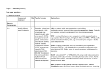 Topic 3—Networks (9 hours) Past paper questions : 3.1 Networks (9 hours) Assessment statement Obj Teacher’s notes Explanations Identify different types of networks. 2 Examples include local area network (LAN), virtual local area network (VLAN), wide area network (WAN), storage area network (SAN), wireless local area network (WLAN), internet, extranet, virtual private network (VPN), personal area network (PAN), peer-to-peer (P2P). S/E, INT Globalization has been accelerated by the technical advances linked to network development. LAN = a network inside one organization or one building traditionally made of wires and hubs connecting servers and clients. Typically in a business, connecting employee's PCs to the company's servers. Network fundamentals 3.1.1 WAN = a network that spans many computers in widely separate locations, e.g. separate cities for example, linking bank offices and ATMs. WANS usually include connections that are public, e.g. not owned by the company - like the public telephone lines VLAN = it seems to be a LAN, and is all controlled by one organization. Commonly PART of a LAN, isolated with no connection to other parts of the actual physical LAN. Makes sense for security purposes, isolating sensitive resources. WLAN - also called WIFI - a WIRELESS LAN, using mostly radio connections to "access point" hubs, with wires connecting the hubs to the servers. Rarely provides direct wireless connections between clients and servers, as cables (wires) are much faster. SAN - a network containing large amounts of storage (HDD). Usually virtualized so users don't need to worry about the actual machines containing the storage devices - commonly "data centers" VPN - Virtual Private Network - provides secure, private connections between clients and servers, running across public connections like phone line typically running across the Internet Security issues (encryption) are very important here. PAN - Personal Area Network - used to connect devices belonging to one user, or maybe a family. Typically running through wireless router in a home. P2P - Peer to Peer - communicates between "equal" clients, without using servers. Commonly used in the Internet to exchange files directly between client PCs. Video links: https://www.belden.com/blog/smart-building/network-types :https://www.youtube.com/watch?v=fCxfp1iUbqw 3.1.2 Outline the importance of standards in the construction of networks. 2 INT Standards enable compatibility through a common “language” internationally. ASCII - Before networks (1950's and 1960's) computers were all non-standard, custom built devices. They used "custom" storage methods, including non-standard character-code systems. Once there were enough computers containing enough data to make communication and data exchange useful, standard storage systems were needed. Then ASCII was invented in the early 1960's, making it possible to exchange data and information easily. Original ASCII was 7-bits plus a parity bit (128 codes). Later this expanded to 8-bits (without a parity bit) to provide 256 codes. UNICODE - Much later (1990s) this was expanded to UNICODE, because ASCII did not include codes for "foreign" languages like Chinese, Russian, Persian, etc. UNICODE is 16-bits, providing codes for 65536 different characters. Ethernet - a standard for LAN connections. This includes a communication protocol, as well as a standard type of connection card and standard cables. Without such standards, we could not ensure that new machines could connect successfully to an existing network. https://www.slideshare.net/makyong1/chapter-33-12564245 1. Standards ensure compatiblity 2. Define protocol 3. Roles: data integrity, flow control, deadlock resolution, congestion, error checking 3.1.3 Describe how communication over networks is broken down into different layers. 2 Awareness of the OSI seven layer model is required, but an understanding of the functioning of each layer is not. OSI - Open System Interconnection By establishing STANDARD layers with specific responsibilities, it's possible to implement communication (networking) with interchangeable modules. For example, if a new Operating System is created (e.g. Android), it's responsibilities must be implemented (programmed) inside the OS. But it's not necessary to also create a new browser (although this might actually be optimized for the system). https://www.geeksforgeeks.org/layers-of-osi-model/ https://www.youtube.com/watch?v=LANW3m7UgWs 3.1.4 Identify the technologies required to provide a VPN. 2 3.1.5 Evaluate the use of a VPN. 3 Client machine, server, connection (probably via Internet), encryption software, client software (not necessarily a browser), often a "relay" server (but not necessarily) S/E, AIM 9 The use of a VPN has led to changes in working Virtual Private Network - VPN provides "the best of both worlds" - mobility convenience through remote connections - security equivalent to that provided in a LAN patterns. This permits employees - including important administrators to work from home or during a trip, but still have access to sensitive and private data stored on the company's servers. This often uses non-standard, hence secure, communication protocols. A simple version uses non-standard PORT numbers for the communication channel. Simple VPNs only make connections between one client and one server. More complex versions may provide direct connections between clients, e.g P2P. Data transmission 3.1.6 Define the terms: protocol, data packet. 1 Protocol = a clear and effective set of rules for communication, including specific steps for starting a conversation, continuing the conversation, making decisions about when to continue or stop, and a specific way for ending the conversation Data Packet = a small collection of data that is part of a larger communication. For example, a video may be broken into smaller packets - maybe 16 KiloBytes each - that are "streamed" one after another out to the client. Not