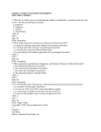 Chapter 3: Clinical Assessments and Diagnosis MULTIPLE CHOICE 3. What do we call the process of determining whether an individual’s symptoms meet the criteria for a specific psychological disorder? a. prognosis b. diagnosis c. analysis d. classification ANS: B PTS: 1 REF: 69 BLM: Remember 4. What is the Diagnostic and Statistical Manual of Mental Disorders? a. a guide for training psychology students in assessment techniques b. a textbook about the etiology of psychological disorders c. a classification system for abnormal behaviour d. an encyclopedia of treatment approaches for psychological disorders ANS: C PTS: 1 REF: 69 BLM: Remember 5. What organization publishes the Diagnostic and Statistical Manual of Mental Disorders? a. the International Medical Association b. the American Psychological Association c. the American Psychiatric Association d. the National Institute of Mental Health ANS: C PTS: 1 REF: 69 BLM: Remember 6. For what purpose does the process of clinical assessment result in narrowing the focus? a. to consider a broad range of problems b. to focus on “inter” and “intra” personal problems equally c. to concentrate on problem areas that seem most relevant d. to uncover all possible causes of stress in the person’s life ANS: C PTS: 1 REF: 70 BLM: Higher Order Copyright © 2015 Nelson Education Limited 3-1 Chapter 3 Test Bank Barlow Abnormal Psychology 4ce 7. A patient who had recurrent headaches, fatigue, and loss of appetite received different diagnoses from several psychiatrists. In terms of assessment, what type of problem does this example illustrate? a. a problem with classification b. a problem with reliability c. a problem with validity d. a problem with standardization ANS: B PTS: 1 REF: 70 BLM: Higher Order 8. Dr. Evans conducts a study that showed his colleague’s “depression screener” doesn’t predict depressive symptoms. What is the problem with the depression screener? a. validity b. standardization c. reliability d. classification ANS: A PTS: 1 REF: 70–71 BLM: Higher Order 9. If an assessment measures what it is intended to measure it is said to be considered to be which of the following? a. valid b. reliable c. standardized d. clinical ANS: A PTS: 1 REF: 71 BLM: Remember 10. An IQ test indicates a level of intelligence that closely corresponds with a student’s high school grades and with teachers’ ratings of the student’s intelligence. In this instance, what does this IQ test have? a. concurrent validity b. content validity c. predictive validity d. construct validity ANS: A PTS: 1 REF: 71 BLM: Higher Order 11. When Ms. Rath was seeking employment, a job consultant gave her a standard IQ test. The following year, the same consultant gave Ms. Rath the same IQ test. Ms. Rath’s score was similar on both occasions. What does this indicate? a. The test has concurrent validity. b. The test has long-term validity. c. The test has inter-rater reliability. d. The test has test-retest reliability. ANS: D PTS: 1 REF: 71 BLM: Higher Order Copyright © 2015 Nelson Education Limited 3-2 Chapter 3 Test Bank Barlow Abnormal Psychology 4ce 12. Mr. Lopez, a 40-year-old recent immigrant to Canada, is learning to speak English. He applies for a job and is given a test. His score is compared to other test takers who are mostly college graduates whose native language is English. Mr. Lopez thinks this is unfair. What kind of problem does this situation illustrate? a. a problem with classification b. a problem with standardization c. a problem with validity d. a problem with reliability ANS: B PTS: 1 REF: 71 BLM: Higher Order 13. As part of a psychological assessment, a mental status exam is used to find out how a person thinks, feels, and behaves. However, what is the primary purpose of a mental status exam? a. to determine what type of treatment should be used b. to determine if a psychological disorder might be present c. to determine whether the individual also has a medical condition d. to determine which medication would be most effective ANS: B PTS: 1 REF: 71–72 BLM: Higher Order 14. How is a mental status exam related to a clinical interview? a. A mental status exam score is important information for hospitalizations. b. A mental status exam is used to elicit spontaneous information that is not usually obtained in the interview. c. A mental status exam is administered immediately following the interview. d. A mental status exam is used to organize the information obtained during the interview. ANS: D PTS: 1 REF: 71–72 BLM: Remember 15. In a mental status exam, a clinician can make a rough estimate of the patient’s intellectual functioning. What does the clinician attempt to detect by listening to the patient’s speech? a. the ability to talk about his or her problems logically and objectively b. insight into his or her problems c. the tendency to use abstractions and metaphors d. the ability to speak slowly and clearly ANS: C PTS: 1 REF: 71–72 BLM: Remember 16. Which of the following is NOT a category covered in a mental status exam? a. physical symptoms b. behaviour c. appearance d. intellectual functioning ANS: A PTS: 1 REF: 71–72 BLM: Remember 17. With regard to a mental status exam, which of the following questions is NOT related to the concept of sensorium? a. Who are you? b. Where are you? c. How old are you? d. What is today’s date? ANS: C PTS: 1 REF: 71–72 BLM: Remember 3-3 Copyright © 2015 Nelson Education Limited Chapter 3 Test Bank Barlow Abnormal Psychology 4ce 18. Which of the following is a part of the intellectual functioning component of a mental status exam? a. noting a person’s vocabulary b. noting the appropriateness of a person’s attire c. noting a person’s mood d. noting the content of what a person is saying ANS: A PTS: 1 REF: 72 BLM: Remember │WWW 19. The term “sensorium” refers to part of the mental status exam. What does sensorium mean? a. a person’s impairment in visual or auditory functioni
