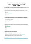 OSHA 10 HOUR CONSTRUCTION FINAL EXAM TIP: Press CTRL + F on PC or Command + F on Macintosh computers to quickly find the correct answer to your questions. • • • • Employers who receive a citation and want to protest it should contact OSHA within _____ days by _____. A. 3; letter B. 15; letter (correct answer) C. 21; email D. 30; fax In order to protect the human resources of the United States, what legislation did Congress pass in 1970? A. Federal Employers Liability Act B. Workers' Compensation Act C. Occupational Safety and Health Act (correct answer) D. Ensuring Worker Safety Act Employers who receive citations for violations must post that citation near the site of the violation for ____ days. A. 3 (correct answer) B. 15 C. 21 D. 30 OSHA recognizes all these workers rights EXCEPT A. Working with employers to identify and correct workplace hazards B. Filling complaints with OSHA about hazardous workplace conditions C. Appealing their termination of employment for violation of safety policies (correct answer) D. Seeking safe workplace conditions without threat of discipline or termination Get All Answers to OSHA 10 Hour Construction Final Exam • • • • • During the opening conference of an inspection that results from an employee complaint, the CSHO will provide all of this information EXEPT: A. The reason the establishment was selected B. The identity of the complainant (correct answer) C. The purpose and scope of the inspection D. The contents of the complaint All of the following are correct Exept: A. Each year, on average, 14 workers die every day from job injuries B. Over 4,700 Americans die from workplace injuries annually C. In 2009, over 3 million non-fatal workplace injuries and illneses were reported D. OSHA inspects every job site in America (correct answer) If an employee files complaint with OSHA and inspection results in a citation, the employer MUST NOT: A. Correct the conditions before a CSHO inspects the workplace B. Contact OSHA to dispute the citation C. Request guidance from OSHA for suggested remedies D. Discipline or terminate the complaining employee (correct answer) For workplace safety violations, OSHA holds ___ ultimately responsible. A. Employers B. Employees C. Its inspectors D. The injured party (correct answer) OSHA standards apply only to which one of these employer groups? A. Mining B. Public Service C. Maritime (correct answer) D. Atomic Energy Get All Answers to OSHA 10 Hour Construction Final Exam • • • • • What does the General Duty Clause require of employers? A. To create a formal system whereby all employees may file safety complaints B. To respond any penalty-bearing citations within 15 days of being cited C. To post the complaints of any employees along with their names and duties D. To provide a safe and healthful workplace for all employees (correct answer) Exposure records and data analyses based on the exposure records are to be kept by employers for __years. A. 5 B. 6 C. 7 D. 30 (correct answer) Safety programs should contain all these elements EXEPT: A. Management commitment B. Employee involvement C. Worksite analysis D. Increased exposure to build endurance (correct answer) Background data, such as laboratory reports and worksheets, for exposure records should be kept for: A. Six months B. Seven years C. Five years D. One year (correct answer) Confineed or enclosed spaces are purposefully designed to prevent: A. Exit B. Continuous occupancy (correct answer) C. Limited entrance D. Assigned work Get All Answers to OSHA 10 Hour Construction Final Exam • • • • • Job site inspections should focus on all these factors EXEPT: A. The job site B. Materials C. Equipment D. The lunch room (correct answer) Effective safety programs DO NOT require: A. Annual review and revision of the program B. Employee involvement in safety meetings and inspections C. Union oversight if the worksite is unionized (correct answer) D. Management observance of safety rules Based on specific OSHA definitions of workers A. Authorized (correct answer) B. Qualified C. Competent D. Skilled An emergency action plan should contain all these elements EXEPT: A. Emergency escape procedures and emergency escape route assignments B. Procedures for employees who remain to operate emergency equipment C. Procedures to account for all employees after emergency evacuation D. General job duties for each employee after the “all clear” is sounded (correct answer) At job sites where harmful plants or animals are present, employers should train employees in all these areas EXEPT: A. Potential hazards B. Injury avoidance C. Hazard removal (correct answer) D. First aid Get All Answers to OSHA 10 Hour Construction Final Exam • • • • • Based on specific OSHA definitions of workers and their roles, job site inspections should be performed only by ___ persons. A. Authorized B. Qualified C. Competent (correct answer) D. Skilled OSHA required hazard communication training must include all of me following information EXCEPT: A. Understanding Material Safety Data Sheets B. Understanding labels C. Proper selection and use of personal protective equipment D. Chemical hazard cost analysis (correct answer) Explosive symbols are used to label materials that release great amounts of energy in all of the following forms EXCEPT: A. Heat B. Light C. Sound (correct answer) D. Expanding pressure Training for employees exposed to hazardous chemicals must include all of [he following EXCEPT: A. How to handle chemicals safely B. How to read and understand labels and Material Safety Data Sheets C. How to dispose of the chemicals after use (correct answer) D. What personal protective equipment is required Although OSHA created no symbols or specific color designations as part of its Hazard communication Standard, whose hazard class symbol and color system does it endorse? A. US. Department of Labor B. U.S. Department of Energy C. U.S. Department of Transportation (c