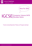 New for 2016 IGCSE Computer Science 0478 Revision Notes “Covers everything from Theory to Program solving” © Copyright 2016 by smartnotesonline.com © Copyright 2016 by smartnotesonline.com This document contains images and excerpts of text from educa onal resources available on the internet and printed books. If you are the owner of such media, text or visual, u lized in this document and do not accept its usage then I urge you to contact us on smartnotesonline.com. Under no condi ons may this document be distributed under the name of false author(s) or sold for financial gain; the document is solely meant for educa onal purposes and it is to remain a property available to all at no or minimal cost. It is currently freely available from the website smartnotesonline.com. This work is licensed under a Crea ve Commons A ribu on-NonCommercial-ShareAlike 4.0 Internaonal License. ®IGCSE is the registered trademark of Cambridge Interna onal Examina ons. This text has not been through the endorsement process. © Copyright 2016 by smartnotesonline.com Data Transmission Simplex Data Transmission ‐ Data transmission in one direction only. Half Duplex Data Transmission ‐ Data transmission in two directions but not at the same time. Full Duplex Data Transmission ‐ Data transmission in two directions at the same time. Serial Data Transmission ‐ Data is sent one bit at a time over a single wire or channel. Parallel Data Transmission‐ Several bits of data are send down several wires or channels. Asynchronous Data Transmission ‐ Data is being transferred in an agreed bit pattern together with controls bits known as start bit & stop bit. Synchronous Data transmission – Data is being transferred in a continues stream accompanied by timing signals generated by an internal clock; timing signals are synchronized with each other to endure sender are receiver are synchronized with each other to ensure bits are reassembled into the correct bit pattern. USB – Universal Serial Bus; an asynchronous serial data transmission method which has become an industry standard What happens when a device is plugged into a computers using one of the USB ports? 1.) The device is automatically detected. 2.) A known device is recognized and a device driver is loaded. 3.) If a new device is plugged in, the computer looks for the correct device driver or the user will be prompted to download the driver. Error Checking Methods of Data Transmission What is parity Check? 1.) Parity Checks can be even (even number of bits) or odd (odd number of bits); one bit is known as Parity bit. 2.) Parity blocks allow an erroneous bit to be identified. 3.) If the parity of a byte of data hasn’t changed (following data transmission) but still an error has occurred, then it’s impossible using this method to identity where the error has occurred. What is Automatic Repeat Request (ARG)? 1.) ARG used acknowledgment to indicate data receiver correctly. 2.) A timeout is used which is the time allowed to elapse before an acknowledgment is received. What is Checksum? 1.) 2.) 3.) 4.) Data is sent in blocks. An additional value called Checksum, is end at the end of the block of data. The checksum is based on the number of bytes in the block. If the checksum at the receiver’s end doesn’t match the checksum at the end of the data block, then an error in transmission has occurred. What is Echo Check? 1.) 2.) 3.) 4.) Data is returned to the sender. The sender compares data with the data received back. If different error has occurred somewhere in the process. The problem could that the data was actually send correctly, but it was during the processing of sending back to the sender that the error occurred. Internet Technologies Internet Service Provider (ISP) – An ISP is company that provides the user with access to the internet, they usually charge a monthly fee. Internet Protocol (IP) Address – Each device is given an IP address as soon as it connects to the internet. The IP address will be different each time the device connects. Media Access Control (MAC) Address – MAC address uniquely identifies a device connected to the internet. HYPERTEXT MARK‐UP LANGUAGE (HTML) ‐ is used when writing and developing web pages. HTML Structure – is the essential part of the HTML document; it includes the semantics(meaning) and structural mark‐up of the document. HTML PRESENTATION ‐ is the style of the document; i.e. how the document will look (or even sound if it includes multimedia elements). Web Browser ‐ is software which allows a user to display a web page on their computer screen. Web browsers interpret or translate the HTML code from websites and show the result of the translation. Logic Gates & Logic Circuits Logic Gates: Truth tables: Logic Statements: Logic Circuits: Operating System Operating system – The software running in background of a computer system. It manages many of the basic functions. Interrupt – An interrupt is a signal sent from a device (or from somewhere) to processor requesting its attention. The interrupt will cause the processor to temporarily stop what it’s doing to serve the interrupt. Buffer – A buffer is temporary memory area in a device. It allows the processor to carry on with other tasks whilst. Computer Architecture Buses ‐ They move data around the computer and also end send out control signals to synchronize internal operations. Types of Buses: 1.) Address Bus – This carries signals relating to the address between the processor and memory; its uni‐directional. 2.) Data Bus – This sends data between the processor, memory unit and the input/output devices; its bi‐directional. 3.) Control Bus – This carries signals relating to control and coordination of all activates within the computer; it can be uni‐directional or bi‐directional due to internal connections. Registers – High‐speed storage areas within the computer. Types of Registers: 1.) 2.) 3.) 4.) 5.) Memory A