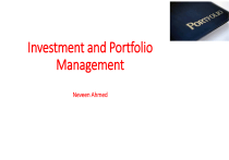 Investment and Portfolio Management Neveen Ahmed Foundation • • • • • • • • • • • • Investment choices Trading Terminologies Portfolio Management IPS Dimension of investment Investment classes Asset allocation & Security selection Investment Philosophies Margin trading Short-selling Index construction Mutual Fund Why do we invest?! • Moving money from present to future • Why do we do it? • • • • Wealth Preservation Wealth Accumulation Life Goals Diversification Now take 3 minutes Rank your preferred investment • 1• 2• 3- Please select the most accurate statement from the 4 statements below • 1.Highrisk=high return (in the short and long-run) • 2.Highrisk=high return(in the short-run) • 3.Highrisk=high return(in the long-run) Let’s review the nominal performance of familiar asset classes from 31 Dec 16 to 31 Dec 18 Year 8 Price Gold Lebanese stock market Interest on deposit * 2016 1,600,000 118.4 1000 2,000,000 2018 Percentage Change 25% 117.8 1123.6 -0.5% 12.36% What would be the value of LLB 100,000,000 invested back on 31 Dec 16? Year Return on deposit 2016 Return on Gold Return on Lebanese stock market 100,000,000 100,000,000 2018 125,000,000 112,360,000 99,493,243 100,000,000 *Assumption interest rate on US deposit as of end 2010 = 6% Now, let’s take the analysis one step further –enter “inflation” CPI 2016 94 2018 104 Percentage change 10.6% ๐๐๐ซ๐ข๐จ๐ ๐๐๐๐ฅ ๐๐๐ญ๐ ๐จ๐ ๐๐๐ญ๐ฎ๐ซ๐ง= (๐+๐๐๐ซ๐ข๐จ๐๐๐จ๐ฆ๐ข๐ง๐๐ฅ ๐๐๐ญ๐ ๐จ๐ ๐๐๐ญ๐ฎ๐ซ๐ง / ๐+๐๐๐ซ๐ข๐จ๐ ๐๐ง๐๐ฅ๐๐ญ๐ข๐จ๐ง ๐๐๐ญ๐) −๐ What would be the “Real” value of LBP100,000,000 invested back on 31 Dec 16 CPI 2016 94 2018 104 Percentage change 10.6% What would be the REAL value of LLB 100,000,000 invested back on 31 Dec 16? Year Year 2016 2016 2018 2018 Nominal R Real R Return on Gold Return on Return on Return on ReturnLebanese on 2stock y CD deposit market Gold Lebanese 100,000,000stock market 100,000,000 100,000,000 100,000,000 100,000,000 127,400,000 99,493,243 112,360,000 127,400,000 113,4000,000 25% -0.5% 12.36% 13% -14% 1.6% Performance ranking from 31 Dec 2016 to 31 Dec 2018 (based on inflation-adjusted return) • 1. Return on bank low risk/moderate real return • 2. Gold moderate risk/highest real return • 3. EGX30 portfolio high risk/worst negative real return Now, let’s take a longer-term view –from 31 Dec 10 to 31 Dec 18 CPI 2010 84 2018 104 Percentage change 23.8% Year Gold price Return on Lebanese stock market Interest on deposit 2010 1,500,000 94.440 1000 2018 2,000,000 117.852 1,127.8 Percentage Change 33% 23% 12.7% Assumption interest rate on US deposit as of end 2010 = 6.2% Now, let’s take a longer-term view –from 31 Dec 10 to 31 Dec 18 Year Return on Gold Return on Lebanese stock Return on deposit market 2010 100,000,000 100,000,000 100,000,000 2018 133,000,000 123,000,000 112,700,000 Nominal R 33% 23% 12.7% Real R 7.4% -0.6% -8.9% Performance ranking from 31 Dec 2010 to 31 Dec 2018 (based on inflation-adjusted return) • 1. Gold Moderate risk/ highest real return • 2. Blom portfolio High risk/ low negative real return ( by 2019 it turned to be positive return) • 3. Deposit lowest risk / worst real return Summing all up • The popular phrase “high risk/high return” may not hold in the shortterm but usually holds well in the long-term • We should care about the “real”, or, “inflation-adjusted” rate of return. • This is calculated as: • Period Real Rate of Return = (1+ Period Nominal Rate of Return) / (1+Period Inflation Rate) − 1 Asset performance Trading and Securities Markets Terminologies Types of Order • Market Orders: buy or sell orders to be executed immediately at current market prices. If you are a buyer, the best current price is the lowest Ask Price. If you a seller, the best current price is the highest Bid Price. • Limit Orders • Limit buy: instruct broker to buy shares if market price reaches or is below a specified price. For example, if I want to buy a stock at a max price of $35/share, the broker will only execute if it is $35 or lower. • Limit sell: instruct broker to sell shares if market price reaches or is above a specified price. • Limit Orders can be specified to be executed: Fill or Kill, Good for Day, Month, Week, Good till Cancelled • Stop order • Stop loss: sell if prices falls to certain price • Stop buy: buy if price rises to certain price (useful with short sales discussed later) Trading Glossary • Primary Markets • Equity Offerings: IPO and Seasoned Offerings • Private Placement • Underwriting • Secondary Markets • OTC vs. Organized Exchanges Trading glossary • Stock Market Index • A quantitative tool that measures performance of a stock market. It is used as a performance benchmark (discussed later in details). • Market Capitalization • Stock Price x Number of Outstanding Shares • Trading Volume • Number of Shares traded of a company • Free Float • % of company’s shares available to trade on the stock market • Value Traded • Trading Volume x Stock Price • Liquidity • How well can you sell shares without having to change the price • Most Basic Proxy is Annual Value Traded Portfolio Management Portfolio Management Portfolio management is the art and science of making decisions about investment mix, matching investments to objectives, asset allocation for individuals and institutions, and balancing risk against performance. Steps for portfolio Management 1- Planning Understand your investor’s needs this Involves constructing Investor Policy Statement (IPS) 2- Execute: Based on IPS decide on Asset allocation and security selection and hence construct the investor's portfolio. 3- Feedback: This includes Portfolio monitoring and rebalancing Performa