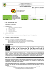 Republic of the Philippines NUEVA VIZCAYA STATE UNIVERSITY Bambang, Nueva Vizcaya INSTRUCTIONAL MODULE IM No.: MATH 1-1S-2020-2021 College: Engineering Campus: Bambang DEGREE PROGRAM SPECIALIZATION YEAR LEVEL I. BSME/BSEE/ BSECE/BSCPE Mechanical/Electrical Electronics/Computer 1st Year COURSE NO. MATH 1 COURSE TITLE Differential Calculus TIME FRAME 16 hrs. WK NO. 14 -17 IM NO. UNIT TITLE/CHAPTER TITLE Applications of Derivative II. III. LESSON TITLE I. Applications of Maxima and Minima II. Rate of Changes III. Rectilinear Motion IV. Rectilinear Rates V. Parametric Equations LESSON OVERVIEW This lesson provides the students an understanding the derivatives in its applications. IV. DESIRED LEARNING OUTCOMES At the end of the lesson, the students should be able to: 1. Apply the different properties of derivatives in solving related rates 2. Solving problems involving relationships between changing quantities. 3. Derive mathematical concepts related to rates. V. COURSE CONTENT 5 5 APPLICATIONS OF DERIVATIVES There are various applications of derivatives not only in math and real life but also in other fields like science, engineering, physics, etc. In previous classes, you must have learned to find the derivative of different functions, like, trigonometric functions, implicit functions, logarithm functions, etc. In this section, you will learn the use of derivatives with respect to mathematical concepts and in real-life scenarios. 5.1 MAXIMA AND MINIMA It was noted that at a point where its first derivative vanishes, a function assumes an extreme value, provided the derivative changes sign at that point. This result finds application in a great variety of problems, some of which will now be considered. When the derivative is equated to zero, it may happen, of course, that several critical values are obtained. in practice, the value that gives the desired maximum or minimum can often be selected at once by inspection NVSU-FR-ICD-05-00 (081220) “In accordance with Section 185, Fair Use of a Copyright Work of Republic Act 8293, the copy righted works included in this material may be reproduced for educational purposes only and not for commercial distribution” Page |1 Republic of the Philippines NUEVA VIZCAYA STATE UNIVERSITY Bambang, Nueva Vizcaya INSTRUCTIONAL MODULE IM No.: MATH 1-1S-2020-2021 EXAMPLE A box is to be made of piece of cardboard 9 𝑖𝑛2 by cutting equal squares out of the corners and turning up the sides. Find the volume of the largest box that can be made in this way. Solution: 𝑉 = (9 − 2𝑥)2 𝑥 𝑉 = 81𝑥 − 36𝑥 2 + 4𝑥 3 𝑑𝑉 = 81 − 72𝑥 + 12𝑥 2 = 0 𝑑𝑥 4𝑥 2 − 24𝑥 + 27 = 0 ÷3 Using quadratic formula −𝑏 ± √𝑏 2 − 4𝑎𝑐 𝑥= 2𝑎 −(−24) ± √(−24)2 − 4(4)(27) 𝑥= 2(4) 24 ± 12 𝑥= 8 𝑥 = 4.5 and 𝑥 = 1.5 Use 𝑥 = 1.5 𝑉 = (9 − 2𝑥)2 𝑥 2 𝑉 = (9 − 2(1.5)) (1.5) 𝟑 𝑽 = 𝟓𝟒 𝒊𝒏 EXAMPLE Find the rectangle of maximum perimeter inscribed in a given circle Solution: Diameter 𝐷 is constan, (circle is given) 𝑥 2 +𝑦 2 = 𝐷 2 2𝑥 + 2𝑦𝑦 ′ = 0 −𝑥 𝑦′ = 𝑦 Perimeter 𝑃 = 2𝑥 + 2𝑦 𝑑𝑃 = 2 + 2𝑦 ′ 𝑑𝑥 0 = 2 + 2𝑦 ′ −𝑥 2 +2( ) = 0 𝑦 𝑦=𝑥 The largest rectangle is a square. NVSU-FR-ICD-05-00 (081220) “In accordance with Section 185, Fair Use of a Copyright Work of Republic Act 8293, the copy righted works included in this material may be reproduced for educational purposes only and not for commercial distribution” Page |2 Republic of the Philippines NUEVA VIZCAYA STATE UNIVERSITY Bambang, Nueva Vizcaya INSTRUCTIONAL MODULE IM No.: MATH 1-1S-2020-2021 EXAMPLE If the hypotenuse of the right triangle is given, show that the area is maximum when the triangle is isosceles. Solution: 𝑥2 + 𝑦2 = 𝑐2 2𝑥 + 2𝑦𝑦 ′ = 0 −𝑥 𝑦′ = 𝑦 Area: 1 𝑥𝑦 2 𝑑𝐴 1 = [𝑥𝑦 ′ + 𝑦] 𝑑𝑏 2 1 0 = [𝑥𝑦 ′ + 𝑦] 2 0 = 𝑥𝑦 ′ + 𝑦 −𝑥 𝑥( )+𝑦 = 0 𝑦 𝑥2 𝑦= 𝑦 𝑦2 = 𝑥2 𝑦=𝑥 𝐴= The triangle is an isosceles right triangle. Do what is being asked for. 1. A box is to be made from a sheet of cardboard that measures 12" × 12". The construction will be achieved by cutting a square from each corner of the sheet and then folding up the sides. What is the box of greatest volume that can be constructed in this fashion? 2. A rectangular garden is to be constructed against the side of a garage. The gardener has 100𝑓𝑡 of fencing and will construct a three-sided fence; the side of the garage will form the fourth side. What dimensions will give the garden of greatest area? 3. A farmer has enough money to build only 100𝑚 of fence. What are the dimensions of the field he can enclose the maximum area? 4. Find the minimum amount of tin sheet that can be made into a closed cylinder having a volume of 108 cu. inches in square inches. 5. A box is to be constructed from a piece of zinc 20𝑖𝑛2 by cutting equal squares from each corner and turning up the zinc to form the side. What is the volume of the largest box that can be so constructed? 6. A poster is to contain 300 (cm square) of printed matter with margins of 10𝑐𝑚 at the top and bottom and 5𝑐𝑚 at each side. Find the overall dimensions if the total area of the poster is minimum. 7. A normal window is in the shape of a rectangle surmounted by a semi-circle. What is the ratio of the width of the rectangle to the total height so that it will yield a window admitting the most light for a given perimeter? NVSU-FR-ICD-05-00 (081220) “In accordance with Section 185, Fair Use of a Copyright Work of Republic Act 8293, the copy righted works included in this material may be reproduced for educational purposes only and not for commercial distribution” Page |3 Republic of the Philippines NUEVA VIZCAYA STATE UNIVERSITY Bambang, Nueva Vizcaya INSTRUCTIONAL MODULE IM No.: MATH 1-1S-2020-2021 8. Determ