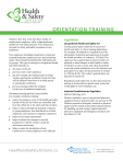 Orientation Training Statistics show that, in the first three months of employment, employees suffer a disproportionate number of work-related injuries. This underscores the need for safety and health orientation of new employees. New employees (including transferred, re-hired and seasonal/temporary employees) have special training needs. These should be identified for individuals and for groups. The type of training for occupational health and safety depends on: ■■ ■■ ■■ ■■ the nature of the job previous work or job experience age (for example, the training needs of young workers entering the workforce for the first time will be different from those of an older person re-entering the workforce) previous training within the company (in the case of transferred employees) Orientation training provides many benefits. For example, orientation training: ■■ ■■ ■■ ■■ ■■ makes the employee aware of the health and safety hazards of the job, how these are controlled, and how they affect his or her safety and that of others helps to reduce the high risk potential of injuries to young employees, new/transferred or re-hired employees, and seasonal or temporary employees helps to meet legal requirements helps to balance the company’s need for productivity with the worker’s needs for self-esteem and security helps to make the introduction of new, transferred or re-hired employees more efficient HealthandSafetyOntario.ca Legislation Occupational Health and Safety Act Certain general duties under the Occupational Health and Safety Act have training implications. For example, the employer is required to provide information, instruction and supervision to protect the health and safety of workers [s. 25(2)(a)]. The supervisor has a general duty to advise workers of potential or actual dangers to their health or safety of which he or she is aware, and where prescribed, to provide written instructions as to the measures and procedures to be taken for the protection of workers [s. 27(2)(a) & (b)]. The worker’s general duties are specified in section 28. Regulations made under this Act have provisions for training to be provided in specific areas. Some that would apply in most workplaces are: Industrial Establishments Regulation (R.R.O.1990, Reg. 851) Workers required to wear or use personal protective equipment must be trained in their use and care (s.79). Workers exposed to biological, chemical or physical agents must be trained in procedures and precautions for handling, use and storage, required personal protective equipment and emergency measures and procedures (s.130). Orientation Training Workplace Hazardous Materials Information System Regulation (R.R.O. 1990, Reg. 860) Workers who work with or near hazardous materials must receive training in the content of labels and MSDSs, procedures for use, care, handling and storage, procedures where fugitive emissions are present, and in emergency procedures. Refer to sections 6 & 7 of the WHMIS regulation for complete requirements. Furthermore, under section 42 of the Occupational Health and Safety Act, this training and worker’s familiarity with it must be reviewed at least annually and whenever changes are made in the workplace that affect worker health and safety. Designated Substance Regulation (O. Reg. 490/09) Affected workers must be trained in the use, care, and limitations of respirators, and in the provisions of the control program for the designated substances. The Codes for Medical Surveillance that are a part of these regulations contain requirements for specific health education. Training Program At a minimum, any orientation program should have provisions for: ■■ ■■ ■■ ■■ General training Job-specific training Allocation of responsibilities Measurement and evaluation General Training For the newcomer, this should include information about the company, its products, etc., and an explanation of: ■■ ■■ ■■ ■■ ■■ department functions reporting structures relationships with other departments standard operating procedures reporting of hazards Job-Specific Training Training and instruction should be provided in: ■■ ■■ ■■ the safety and health hazards of the job safe working practices, procedures and precautions (include applicable control systems such as lock-out or work permits) the use, care and maintenance of personal protective equipment Specific legal requirements, such as, for example, those required for instruction and training in hazardous materials, must be identified and addressed in the training that is provided. The forms provided in figures 1 and 2 will help you to identify the items to be covered in your orientation training program. 2 © 2011, Safe Workplace Promotion Services Ontario, publicly known as Workplace Safety & Prevention Services. 1 877 494 WSPS (9777) | 905 614 1400 | www.wsps.ca Orientation Training Allocation of Responsibilities Measurement and Evaluation In small firms, the responsibility for carrying out orientation training may rest with one person. In large firms, this responsibility may be shared between the manager, supervisors, the personnel department, the health and safety representative (H & S Rep) or joint health and safety committee (JHSC) and others. In either case, the employer or his/her delegate (senior manager) should provide the policy direction with respect to occupational health and safety orientation training. Some examples of responsibilities are: Set standards against which to monitor compliance with the orientation program. Keep records of all health and safety orientation provided including on-the-job training. This is useful for monitoring compliance. Personnel Manager ■■ ■■ ■■ ■■ ■■ Ensure policy is communicated and implemented Prepare orientation checklist and update this as necessary Plan and administer the formal program Assist and advise staff having orientation responsibilities Manager