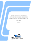 FINITE ELEMENT MODELING OF REINFORCED CONCRETE STRUCTURES STRENGTHENED WITH FRP LAMINATES Final Report SPR 316 Oregon Department of Transportation FINITE ELEMENT MODELING OF REINFORCED CONCRETE STRUCTURES STRENGTHENED WITH FRP LAMINATES Final Report SPR 316 by Damian Kachlakev, PhD Civil and Environmental Engineering Department, California Polytechnic State University, San Luis Obispo, CA 93407 and Thomas Miller, PhD, PE; Solomon Yim, PhD, PE; Kasidit Chansawat; Tanarat Potisuk Civil, Construction and Environmental Engineering Department, Oregon State University, Corvallis, OR 97331 for Oregon Department of Transportation Research Group 200 Hawthorne SE, Suite B-240 Salem, OR 97301-5192 and Federal Highway Administration 400 Seventh Street SW Washington, DC 20590 May 2001 Technical Report Documentation Page 1. Report No. 2. Government Accession No. 3. Recipient’s Catalog No. FHWA-OR-RD-01-XX 4. Title and Subtitle 5. Report Date Finite Element Modeling of Reinforced Concrete Structures Strengthened with FRP Laminates – Final Report May 2001 6. Performing Organization Code 7. Author(s) 8. Performing Organization Report No. Damian Kachlakev, PhD, Civil and Environmental Engineering Department, California Polytechnic State University, San Luis Obispo, CA 93407 and Thomas Miller, PhD, PE; Solomon Yim, PhD, PE; Kasidit Chansawat; Tanarat Potisuk, Civil, Construction and Environmental Engineering Department, Oregon State University, Corvallis, OR 97331 9. Performing Organization Name and Address 10. Work Unit No. (TRAIS) Oregon Department of Transportation Research Group 200 Hawthorne Ave. SE, Suite B-240 Salem, OR 97301-5192 11. Contract or Grant No. SPR 316 12. Sponsoring Agency Name and Address 13. Type of Report and Period Covered Oregon Department of Transportation Research Group and 200 Hawthorne Ave. SE, Suite B-240 Salem, OR 97301-5192 Final Report Federal Highway Administration 400 Seventh Street SW Washington, DC 20590 14. Sponsoring Agency Code 15. Supplementary Notes 16. Abstract Linear and non-linear finite element method models were developed for a reinforced concrete bridge that had been strengthened with fiber reinforced polymer composites. ANSYS and SAP2000 modeling software were used; however, most of the development effort used ANSYS. The model results agreed well with measurements from full-size laboratory beams and the actual bridge. As expected, a comparison using model results showed that the structural behavior of the bridge before and after strengthening was nearly the same for legal loads. Guidelines for developing finite element models for reinforced concrete bridges were discussed. 17. Key Words 18. Distribution Statement finite element method, FEM, model, ANSYS, SAP2000, bridge, reinforced concrete, fiber reinforced, FRP, composite, strengthening, strain 19. Security Classification (of this report) Unclassified Technical Report Form DOT F 1700.7 (8-72) Available from NTIS 20. Security Classification (of this page) 21. No. of Pages Unclassified 22. Price 111 + appendices Reproduction of completed page authorized i Å Printed on recycled paper SI* (MODERN METRIC) CONVERSION FACTORS APPROXIMATE CONVERSIONS TO SI UNITS Symbol When You Know Multiply By To Find APPROXIMATE CONVERSIONS FROM SI UNITS Symbol Symbol When You Know LENGTH Multiply By To Find Symbol LENGTH in inches 25.4 millimeters mm mm millimeters 0.039 inches in ft feet 0.305 meters m m meters 3.28 feet ft yd yards 0.914 meters m m meters 1.09 yards yd mi miles 1.61 kilometers km km kilometers 0.621 miles mi in2 square inches 645.2 millimeters squared mm2 mm2 millimeters squared 0.0016 square inches in2 ft2 square feet 0.093 meters squared m2 m2 meters squared 10.764 square feet ft2 yd2 square yards 0.836 meters squared m2 ha hectares 2.47 acres ac ac acres 0.405 hectares ha km2 kilometers squared 0.386 square miles mi2 mi2 square miles 2.59 kilometers squared km2 mL milliliters 0.034 fluid ounces fl oz L AREA AREA VOLUME VOLUME fl oz gal ft 3 yd3 fluid ounces 29.57 gallons 3.785 milliliters liters mL L liters 0.264 gallons gal 3 meters cubed 35.315 cubic feet ft3 3 m meters cubed 1.308 cubic yards yd3 g grams 0.035 ounces oz kg kilograms 2.205 pounds lb Mg megagrams 1.102 short tons (2000 lb) T m 3 cubic feet 0.028 meters cubed m cubic yards 0.765 meters cubed m3 MASS 3 NOTE: Volumes greater than 1000 L shall be shown in m . MASS oz ounces 28.35 grams g lb pounds 0.454 kilograms kg T short tons (2000 lb) 0.907 megagrams Mg TEMPERATURE (exact) °C Celsius temperature 1.8 + 32 Fahrenheit °F TEMPERATURE (exact) °F Fahrenheit temperature 5(F-32)/9 Celsius temperature °C * SI is the symbol for the International System of Measurement (4-7-94 jbp) ii ACKNOWLEDGEMENTS The authors would like to thank Mr. Steven Soltesz, Project Manager, and Dr. Barnie Jones, Research Manager, of the ODOT Research Group for their valuable suggestions and many contributions to this project. DISCLAIMER This document is disseminated under the sponsorship of the Oregon Department of Transportation and the United States Department of Transportation in the interest of information exchange. The State of Oregon and the United States Government assume no liability of its contents or use thereof. The contents of this report reflect the views of the author(s) who are solely responsible for the facts and accuracy of the data presented herein. The contents do not necessarily reflect the official policies of the Oregon Department of Transportation or the United States Department of Transportation. The State of Oregon and the United States Government do not endorse products of manufacturers. Trademarks or manufacturers’ names appear herein only because they are considered essential to the object of this document. This report does not constitute a standard, specification, or regulation. iii FINITE ELEMENT MODELING OF REINFORCED CONCRETE STRUCTURES STRENGTHENED WITH FRP LAMINATES TABLE OF CONTENTS 1.0 INTRODUCTION............................