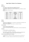 Super Physics Tuition O Level Summary Chapter 1: Measurements • • • • • Scalar quantity is a quantity which has only magnitude but no direction. Vector quantity is a quantity that has both magnitude and direction. 7 Basic Quantities: Length, Mass, Time. Current. Temperature, Amount of Substance, Luminous Intensity. Derived Quantities: Volume, Velocity etc… Prefixes: Prefix giga mega kilo deci centi milli micro nano Symbol G M k d c m µ n Multiplier 1,000,000,000 1,000,000 1,000 0.1 0.01 0.001 0.000001 0.000000001 Exponential 109 106 103 10-1 10-2 10-3 10-6 10-9 Chapter 2: Kinematics • • Displacement is the distance relative to a fixed point in a specified direction while distance is the length covered by a moving object. Displacement is the position of an object relative to a fixed point of reference. Velocity and speed • • • Velocity is the rate of change of displacement Speed is the distance moved per unit time Velocity is a vector that has direction and magnitude but speed is a scalar that has magnitude only. Acceleration • Average acceleration = rate of change of velocity • a = (v-u)/t where v = final velocity, u = initial velocity • • Object going round a circular track at constant speed has acceleration and a changing velocity This is because direction is changing constantly (tangent to the circular path) Free fall in uniform gravitational field (no air resistance) • • A free falling object is falling under the influence of Earth’s gravity (no air resistance, only weight) If there is no air resistance, all objects near Earth fall with the same acceleration (10 m/s2) 1 Falling in a uniform gravitational field with air resistance • • • • When falling through air, air resistance increases as an object falls with increasing velocity. This opposes the weight and causes the net force downwards and hence acceleration to decrease. Terminal velocity is achieved when weight and air resistance are equal. (Newton’s First Law) An object with a larger surface area/smaller mass will reach terminal velocity more quickly. Chapter 3: Dynamics • Newton’s First Law: Every object continues in its state of rest or uniform velocity, if no net force acts on it. • E.g. a car moving in one direction with constant speed: driving force and resistive forces are balanced • Hot air balloon descending with constant speed: weight and resistive forces are balanced • Newton’s Second Law: Acceleration of an object is directly proportional to the net force acting on it, and inversely proportional to its mass. The direction of the acceleration is in the direction of the net force acting on it. • • Net F = ma Newton’s Third Law: Newton’s Third Law states that for every force exerted by one body on another body, there is an equal and opposite force exerted by the second body on the first body. Examples of Newton’s Third Law • • • Fish swimming – fins push back on water with a certain force; water exerts an equal and opposite force to propel fish forward Earth exerts gravitational force on man and the man exerts an equal and opposite force on Earth. Contact force by man on earth = contact force by earth on man Rocket propulsion – solid fuel burns and produces gases that escape at high velocities. The escaping gases result in a force that act on the rocket to push (accelerate) it forward (thrust). o Take note that the thrust is not due to escaping gases pushing on the surrounding air and the air exerting a reaction force in turn to propel the rocket forward. This is because in outer space there is no atmosphere for this scenario to take place. Chapter 4: Mass, Weight and Density • Mass of an object is a constant which is a measure of the amount of matter in an object but weight is the force of gravity acting on an object and it depends on the gravitational field strength of that location • Density = Mass/Volume (SI unit: kg/m3) • Weight = mass × g where g = 10 N/kg on Earth 2 Chapter 5: Moment of a Force & Stability • • • • Centre of gravity of a body is defined as the point through which the weight of the body appears to act (for any orientation of the body) Stability – For a body to remain in equilibrium, the line of action through its centre of gravity must fall within the base of support (when body is tilted, its c.g. produces a moment that returns the body to a stable position) Two factors that increase stability of an object – low c.g. and wide base Types of stability o Stable – when an object is displaced, its c.g. is raised resulting in a net moment that restores it to its original position o Unstable – when object is displaced, its c.g. is lowered resulting in a net moment that causes the object to topple. o Neutral – when object is displaced, its c.g. remains at the same height, the line of action of the weight of the object coincides with the pivot, hence no net moment is produced (no perpendicular distance) and it remains in the new position. • Moment is defined as the product of a force and the perpendicular distance from the line of action of the force to the pivot • Principle of moments states that for a body in equilibrium, the sum of clockwise moment about a pivot is equal to the sum of anticlockwise moments about the same pivot. The resultant force on a body in equilibrium is zero o Moment = F × perpendicular distance • Chapter 6: Pressure • Pressure is defined as the force acting normally per unit area • P = F/A (N/m2 or Pa) • • P = hρg (Pa) Pressure can also be expressed in mmHg or cmHg or mHg Pressure can be measured using a barometer Gas pressure is measured using a manometer Atmospheric pressure is caused by the weight of air above the surface of earth. o 1 atm = 1.0 × 105 Pa o Air pressure decreases with height because there are fewer air molecules per unit volume at a greater height as compared to at sea level • • • • • PV = constant When pressure of a fixed mass of gas