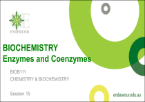BIOCHEMISTRY Enzymes and Coenzymes BIOB111 CHEMISTRY & BIOCHEMISTRY Session 15 Session Plan • • • • • • • • • General Characteristics of Enzymes Enzyme Structure Enzyme Nomenclature Enzyme Function Enzyme Specificity Factors Affecting Enzyme Activity Enzyme Inhibition Regulation of Enzyme Activity Medical Uses of Enzymes http://highered.mheducation.com/sites/0073522732/student_view 0/chapter4/animation_-_enzyme_action.html NOTE: Vitamins are discussed in detail in the Nutrition Modules in your further studies. General Characteristics of Enzymes • ENZYME – • Each cell in the human body contains 1,000s of different enzymes – • Usually a protein, acting as catalyst in specific biochemical reaction Every reaction in the cell requires its own specific enzyme Most enzymes are globular proteins – A few enzymes are made of RNA • • Catalyze biochemical reactions involving nucleic acids Enzymes undergo all the reactions of proteins – Enzymes denaturation due to pH or temperature change • A person suffering high fever runs the risk of denaturing certain enzymes Animation of enzyme at work http://highered.mheducation.com/sites/0072495855/st udent_view0/chapter2/animation__how_enzymes_wor k.html http://bcs.whfreeman.com/webpub/Ektron/pol1e/Animat ed%20Tutorials/at0302/at_0302_enzyme_catalysis.html Enzyme Structure • SIMPLE ENZYMES Composed only of protein • CONJUGATED ENZYMES Composed of: – Apoenzyme • Conjugate enzyme without its cofactor • Protein part of a conjugated enzyme • The apoenzyme can’t catalyze its reaction without its cofactor. – – Coenzyme (Cofactor) • Non-protein part of a conjugated enzyme • The combination of the apoenzyme with the cofactor makes the conjugated enzyme functional. Holoenzyme = apoenzyme + cofactor – The biochemically active conjugated enzyme. Coenzymes and cofactors • Coenzymes provide additional chemically reactive functional groups besides those present in the amino acids of the apoenzymes – Are either small organic molecules or inorganic ions • Metal ions often act as additional cofactors (Zn2+, Mg2+, Mn2+ & Fe2+) – A metal ion cofactor can be bound directly to the enzyme or to a coenzyme • COENZYME – A small organic molecule, acting as a cofactor in a conjugated enzyme • Coenzymes are derived from vitamins or vitamin derivatives – Many vitamins act as coenzymes, esp. B-vitamins Enzyme definitions Term Definition Enzyme (simple) Protein only enzyme that facilitates a chemical reaction Coenzyme Compound derived from a vitamin (e.g. NAD+) that assists an enzyme in facilitating a chemical reaction Cofactor Metal ion (e.g. Mg2+) that that assists an enzyme in facilitating a chemical reaction Apoenzyme Protein only part of an enzyme (e.g. isocitrate dehydrogenase) that requires an additional coenzyme to facilitate a chemical reaction (not functional alone) Holoenzyme Combination of the apoenzyme and coenzyme which together facilitating a chemical reaction (functional) Enzyme Nomenclature • Enzymes are named according to the type of reaction they catalyze and/or their substrate • – • – Substrate Pepsin, trypsin & chymotrypsin • • These enzymes were the first ones to be studied Prefix denotes the type of reaction the enzyme catalyzes – – • Denotes an enzyme Some digestive enzymes have the suffix –in Oxidase: redox reaction Hydrolase: Addition of water to break one component into two parts Substrate identity is often used together with the reaction type – Enzyme Lactase, amylase, lipase or protease • • Substrate = the reactant upon which the specific enzyme acts – Enzyme physically binds to the substrate Suffix of an enzyme –ase Pyruvate carboxylase, lactate dehydrogenase Enzyme/substrate complex Class Classes Reaction Catalyzed Examples in Metabolism 6Enzyme Major of Enzymes Oxidoreductase Redox reaction (reduction & oxidation) Examples are dehydrogenases catalyse reactions in which a substrate is oxidised or reduced Transferase Transfer of a functional group from 1 molecule to another Transaminases which catalyze the transfer of amino group or kinases which catalyze the transfer of phosphate groups. Hydrolysis reaction Lipases catalyze the hydrolysis of lipids, and proteases catalyze the hydrolysis of proteins Hydrolase Lyase Addition / removal of atoms to / from double bond Decarboxylases catalyze the removal of carboxyl groups Isomerase Isomerization reaction Isomerases may catalyze the conversion of an aldose to a ketose, and mutases transfer functional group from one atom to another within a substrate. Ligase Synthesis reaction (Joining of 2 molecules into one, forming a new chemical bond, coupled with ATP hydrolysis) Synthetases link two smaller molecules are form a larger one. 6 Major Classes of Enzymes Based on the type of reaction they catalyze The table explains the functions of enzymes and how they are classified and named. Enzyme Active Site • Active site – The specific portion of an enzyme (location) where the substrate binds while it undergoes a chemical reaction • The active site is a 3-D ‘crevice-like’ cavity formed by secondary & tertiary structures of the protein part of the enzyme – Crevice formed from the folding of the protein • Aka binding cleft – An enzyme can have more than only one active site – The amino acids R-groups (side chain) in the active site are important for determining the specificity of the substrate Stoker 2014, Figure 21-2 p750 Enzyme – Substrate Complex • When the substrate binds to the enzyme active site an Enzyme-Substrate Complex is formed temporarily – Allows the substrate to undergo its chemical reaction much faster Timberlake 2014, Figure 4, p.738 Timberlake 2014, Figure 3, p.737 Lock & Key Model of Enzyme Action • The active site is fixed, with a rigid shape (LOCK) • The substrate (KEY) must fit exactly into the rigid enzyme (LOCK) • Complementary shape & geometry between enzyme and sub