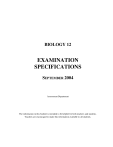 BIOLOGY 12 EXAMINATION SPECIFICATIONS SEPTEMBER 2004 Assessment Department The information in this booklet is intended to be helpful for both teachers and students. Teachers are encouraged to make this information available to all students. BIOLOGY 12 The intent of the Examination Specifications is to convey to the classroom teacher and student how the Biology 12 curriculum will be tested on the provincial examinations. The Table of Specifications provides percentage weightings for each of the curriculum organizers as well as the cognitive levels that are applied to questions. A detailed description of examinable material within each curriculum organizer will be found in the curriculum section of the Biology 11 and 12 Integrated Resource Package (IRP), 1996 and in Appendix A of that package. Replaces All Previous Versions of Biology 12 Examination Specifications 1. The Biology 12 Provincial Examinations conform to the curriculum organizers of the Biology 11 and 12 Integrated Resource Package, 1996. Teachers should thoroughly familiarize themselves with the contents of this package. 2. As outlined in the Introduction of the IRP, an understanding of how the diverse body systems are integrated to maintain homeostasis is a fundamental part of Biology 12. 3. The prescribed learning outcomes O4 and O5 assume an understanding of negative feedback. 4. The following prescribed learning outcomes will not be assessed on the provincial examinations: F1–5 cancer I8 demonstrate the correct use of the dissection microscope J3 demonstrate safe and correct dissection techniques J10 demonstrate the correct use of the compound microscope K5 demonstrate the measurement of blood pressure. 5. Electronic devices, including dictionaries and pagers, are not permitted in the examination room. It is expected that there will be a difference between school marks and provincial examination marks for individual students. Some students perform better on classroom tests and others on provincial examinations. School assessment measures performance on all curricular outcomes, whereas provincial examinations may only evaluate performance on a sample of these outcomes. The provincial examination represents 40% of the student’s final letter grade and the classroom mark represents 60%. Acknowledgement The Assessment Department wishes to acknowledge the contribution of British Columbia teachers in the preparation and review of this document. TABLE OF CONTENTS Description of the Provincial Examination .......................................................................................... 1 Table of Specifications for the Provincial Examination ..................................................................... 2 Description of Cognitive Levels .......................................................................................................... 3 Terminology.......................................................................................................................................... 4 Experimental Design Question for the 2004/05 School Year.............................................................. 7 Sample Questions ................................................................................................................................. 9 BIOLOGY 12 DESCRIPTION OF THE P ROVINCIAL EXAMINATION The Table of Specifications (page 2) outlines the curriculum organizers, sub-organizers, and the cognitive level emphases covered on the provincial examination. A detailed description of examinable material within each curriculum organizer may be found in the Biology 11 and 12 Integrated Resource Package, 1996. The provincial examination is divided into two parts: PART A: Multiple-choice questions worth 75% of the examination (67 marks). PART B: Written-response questions worth 25% of the examination (23 marks). The number of written-response questions may vary from one examination to the next depending on the value of each question; however, the total marks for the written-response section will remain the same. Where appropriate, answers or part-answers, may be presented in point-form. Half marks may be awarded in the marking of written-response questions. The time allowed for the provincial examination is two hours. Students may, however, take up to 30 minutes of additional time to finish. Assessment Department (Issued September 2004) -1- Biology 12 Examination Specifications BIOLOGY 12 TABLE OF SPECIFICATIONS FOR THE P ROVINCIAL EXAMINATION CURRICULUM ORGANIZERS SUB-ORGANIZERS Cell Processes and Applications Human Biology Knowledge Understanding and Application Higher Mental Processes Cell Structure <—————— 5 ——————> B/C Cell Compounds / Biological Molecules <—————— 7 ——————> D DNA <—————— 4 ——————> E Protein Synthesis <—————— 4 ——————> F Cancer <—————— 0 ——————> G Transport Across Cell Membrane <—————— 6 ——————> H Enzymes <—————— 6 ——————> I Digestive System <—————— 9 ——————> J/K Circulatory System: Circulation and Blood / Heart Structure and Function <—————— 13 ——————> Respiratory System <—————— 7 ——————> A Cell Biology COGNITIVE LEVEL L TOTAL MARKS 16 16 58 M/N Nervous System: Neuron, Impulse Generation and Reflex Arc / Divisions of the Nervous System and the Brain <—————— 10 ——————> O Urinary System <—————— 9 ——————> P Reproductive System <—————— 10 ——————> TOTAL 20 52 18 90 The values shown in this table are approximate and may fluctuate. Examination configuration: 67 marks in multiple-choice format 23 marks in written-response format Assessment Department (Issued September 2004) -2- Biology 12 Examination Specifications DESCRIPTION OF COGNITIVE LEVELS The following three cognitive levels are