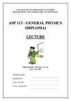 COLLEGE OF TECHNOLOGICAL STUDIES DEPARTMENT OF LABORATORY TECHNOLOGY ASP 113 - GENERAL PHYSICS (DIPLOMA) LECTURE PREPARED BY: PHYSICS STAFF Date: June 2020 Student Name : Student ID : Lab. Section : Year - Semester : Table of Contents CHAPTER 1 - UNITS AND DIMENSIONS ...................................................................... 1 1.1 Introduction ...................................................................................................................... 1 1.2 Derived Quantities ........................................................................................................... 1 1.3 Systems of Units .............................................................................................................. 1 1.4 Conversion of Units ......................................................................................................... 2 1.4.1 Conversion Method ................................................................................................... 3 1.5 Dimensions ...................................................................................................................... 4 CHAPTER 2 - KINEMATICS IN ONE DIMENSION ...................................................... 7 2.1 Average Velocity ............................................................................................................. 7 2.2 Instantaneous Velocity ..................................................................................................... 8 2.3 Acceleration ..................................................................................................................... 8 2.4 Motion with Constant Acceleration ................................................................................. 9 2.5 Falling Objects ............................................................................................................... 11 CHAPTER 3 - NEWTON'S LAWS OF MOTION ........................................................... 16 3.1 Force Concept ................................................................................................................ 16 3.2 Newton’s First Law of Motion ...................................................................................... 16 3.3 Mass Concept ................................................................................................................. 16 3.4 Newton’s Second Law of Motion .................................................................................. 17 3.5 Newton’s Third Law of Motion ..................................................................................... 17 3.6 Friction Force ................................................................................................................. 22 3.7 Applications of Newton’s Laws..................................................................................... 24 3.7.1 Atwood’s Machine .................................................................................................. 24 3.7.2 Two Boxes and a Pulley ......................................................................................... 25 CHAPTER 4 - WORK AND ENERGY ............................................................................ 28 4.1 Work .............................................................................................................................. 28 4.2 Kinetic Energy, and Work-Energy Theorem ................................................................. 29 4.3 Potential Energy ............................................................................................................. 31 4.4 Conservation of Energy ................................................................................................. 31 CHAPTER 5 - MECHANICAL PROPERTIES OF MATTER ........................................ 38 5.1 Density and Specific Gravity ......................................................................................... 38 5.2 Hooke’s Law .................................................................................................................. 40 5.3 Elastic Properties of Solids ............................................................................................ 41 5.3.1 Young’s modulus (Y): Elasticity in length ............................................................. 42 5.3.2 Shear Modulus (S): Elasticity of Shape .................................................................. 43 I 5.3.3 Bulk Modulus (B): Elasticity of Volume ................................................................ 45 CHAPTER 6 - THERMAL PROPERTIES OF MATTER ................................................. 50 6.1 Heat ................................................................................................................................ 50 6.2 Specific heat ................................................................................................................... 50 6.3 Heat transfer by conduction ........................................................................................... 52 6.4 Linear Thermal Expansion ............................................................................................. 54 6.5 Volume Expansion of Solids and Liquids ..................................................................... 55 CHAPTER 7 - HYDROSTATICS .................................................................................... 60 7.1 Pressure .......................................................................................................................... 60 7.2 Variation of Pressure with Depth ................................................................................... 61 7.3 Absolute and Gauge Pressure ........................................................................................ 62 7.4 Buoyant Forces and Archimedes’ Principle .................................................................. 63 7.5 Viscosity and Viscous Fluids .....................