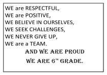 WE are RESPECTFUL, WE are POSITIVE, WE BELIEVE IN OURSELVES, WE SEEK CHALLENGES, WE NEVER GIVE UP, WE are a TEAM. AND WE ARE PROUD WE ARE 6 GRADE. TH LIKE BOOM!