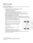 NMR oraz MRI Wstęp teoretyczny – magnetyzm By w pełni zrozumieć zasadę działania NMR (Nuclear Magnetic Resonance) najpierw należy poznać podstawy dotyczące magnetyzmu oraz mechaniki. 1. Równania maxwella dostarczają nam czterech kluczowych informacji (podawanie wzorów nie ma sensu, teoria jest ważna): - źródłem pola elektrycznego są ładunki - pole magnetyczne jest bez źródłowe (ale…) - przepływający prąd oraz zmienne w czasie pole elektryczne wytwarzają pole magnetyczne - zmienne w czasie pole magnetyczne wytwarza pole elektryczne Rzeczywiście najbardziej zaskakuje bez źródłowość pola magnetycznego (drugi myślnik) – w końcu intuicyjnie można by powiedzieć, że magnesy są źródłem czyż nie? By wytłumaczyć tą pozorną nieścisłość musimy przenieść się w świat mikroskopowy. 2. Elektrony i protony się kręcą (a przynajmniej tak załóżmy)1 A więc cząstka poruszająca się (u nas – kręcąca się) oraz posiadająca ładunek elektryczny zgodnie z równaniami Maxwella indukuje pole magnetyczne – oznaczamy to wektorem „μ” (mi) oraz nazywamy momentem magnetycznym (patrz rysunek z prawej, K – wektor pokazujący nam dookoła jakiej osi kręci się cząstka oraz w którą stronę, μ znajduje się nad nim). W świecie makroskopowym moment magnetyczny wytwarza ramka (a zatem też cewka) przez którą przepływa prąd. Dla ramki: ⃗μ = I ⃗ S (μ – moment magnetyczny, I – natężenie prądu płynące przez ramkę, S – pole ograniczone przez ramkę, wektor zwrócony prostopadle do danego pola) Dla cząstek jest to nieco bardziej skomplikowane. Przytoczone „kręcenie się” cząstek jest określane przez moment pędu K (pokazany na rysunku). K= √ I ( I +1 ) h 2 2π (I – spinowa liczba kwantowa dla protonów 1/2, h – stała plancka) Natomiast moment magnetyczny: K ⃗μ=γ ⃗ (γ – stała giromagnetyczna, zależna od atomu, K – jak wyżej) Otrzymujemy tutaj odpowiedź na powyższe pytanie dotyczące bez źródłowości magnetyzmu. Magnesy nie posiadają żadnych „magnetonów” które posiadałyby „ładunek magnetyczny” 3. Posiadają uporządkowane kręcące się cząstki z ładunkiem elektrycznym. 1 - Z “kręceniem się” cząstek spotkaliśmy się już na chemii wraz z pojęciem spinu 2 - h dzielone przez 2π nazywane też jest “h kreślonym” ħ albo stałą Diraca 3 - nazwy autorskie 3. Pod wpływem zewnętrznego pola magnetycznego momenty magnetyczne się porządkują Za pomocą elektrotechnik jesteśmy w stanie wytworzyć silne pola magnetyczne – na rysunku oznaczone wektorem B. Jest to wektor indukcji pola magnetycznego. Jest on definiowany na podstawie siły działającej na ładunek w polu magnetycznym: ⃗ F=q ⃗v × ⃗ B (F – wspomniana siła, nazywana siłą Lorentza, q – wspomniany wyżej ładunek, v – wektor prędkości cząstki, B – wektor indukcji pole magnetycznego a więc interesująca nas wielkość) W podanym wyżej wzorze występuje operacja iloczynu wektorowego. Skalarnie (a więc czysto liczbowo) zapisalibyśmy ten wzór jako: F =|q|v B sin ( a ) Gdzie sin(a) to sinus kąta pomiędzy wektorami w iloczynie wektorowym a więc między v i B. Po przekształceniu: F |q| v sin ( a ) B= Otrzymujemy wyrażenie pozwalające obliczyć wartość wektora indukcji pola magnetycznego. Jego jednostką jest Tesla. Teraz, znając wartość siły musimy jeszcze wyznaczyć jej kierunek – i stąd to całe zamieszanie z „iloczynami wektorowymi” - bowiem wyznaczanie kierunku wektora siły nie jest intuicyjne, dlatego posłużymy się do tego metodą „śruby prawoskrętnej”. (Szybka adnotacja do rysunku obok – na rysunkach często spotykamy się z ⊙ lub ⊗ .Tutaj posługujemy się analogią strzały – kropka oznacza grot, a więc wektor zaraz nas uderzy – jest skierowany w naszą stronę, natomiast krzyżyk oznacza lotki a więc pocisk leci od nas – wektor jest skierowany przeciwnie) Wyobraź sobie, że trzymasz śrubę w swojej prawej ręce w dwóch palcach, pomiędzy wskazicielem a kciukiem. Następnie ustaw śrubę tak by była prostopadła do dwóch wektorów v i B. Teraz ustaw kciuk tak, by był skierowany w kierunku zwrotu v oraz kręć śrubą w taki sposób by twój kciuk był skierowany w kierunku zwrotu wektora B w najszybszy sposób. Co dzieje się ze śrubą? Może się albo ‘wkręcać’ albo ‘wykręcać’ co pokazuje nam zwrot wektora F. Teraz, gdy już wiemy czym jest wektor momentu magnetycznego μ oraz czym jest wektor indukcji pola magnetycznego B4 możemy wreszcie powiedzieć, że jeśli te dwa wektory nie posiadają wspólnego kierunku i zwrotu, lecz są wychylone pod pewnym kątem, to działa na nie siła skręcająca, która dąży do ustawienia ich równolegle. Odsyłam do rysunku na stronie wyżej – wektor F trochę kulawo narysowany oznacza siłę działającą na naszą cząstkę, która pragnie ją obrócić by dwa wektory μ i B był do siebie równoległe (na razie proszę zignoruj dolną część tego rysunku). 4. Jeśli pewne ciało się kręci oraz jeśli działa na nie siła próbująca odchylić jej oś obrotu, to powstaje zjawisko precesji – zjawiska precesji nie będę dokładnie omawiać, byłoby to niepotrzebne mieszanie ciężkimi wzorami (których na wykładzie nie było), posłużę się jednak analogią bączka. Bączek się obraca oraz działa na niego siła grawitacji skierowana w dól – chce 4 - dla pewności przypomnę – jest to miara siły pola magnetycznego, mierzy się ją poprzez pomiar siły działającą na poruszającą się cząstkę w danym polu go przewrócić a więc zmienić kierunek jego osi obrotu. Bączek się jednak nie poddaje – zamiast się przewrócić, obraca się, ale nie on sam tym razem, lecz jego oś obrotu. Gdyby nie istniały siły tarcia, oś obracała by się w nieskończoność. Zjawisko obracania się osi obrotu nazywamy precesją, co obserwujemy także w przypadku cząstek w pol