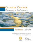 CLIMATE CHANGE EVIDENCE & CAUSES UPDATE 2020 An overview from the Royal Society and the US National Academy of Sciences FOREWORD CLIMATE CHANGE IS ONE OF THE DEFINING ISSUES OF OUR TIME. It is now more certain than ever, based on many lines of evidence, that humans are changing Earth’s climate. The atmosphere and oceans have warmed, which has been accompanied by sea level rise, a strong decline in Arctic sea ice, and other climate-related changes. The impacts of climate change on people and nature are increasingly apparent. Unprecedented flooding, heat waves, and wildfires have cost billions in damages. Habitats are undergoing rapid shifts in response to changing temperatures and precipitation patterns. The Royal Society and the US National Academy of Sciences, with their similar missions to promote the use of science to benefit society and to inform critical policy debates, produced the original Climate Change: Evidence and Causes in 2014. It was written and reviewed by a UK-US team of leading climate scientists. This new edition, prepared by the same author team, has been updated with the most recent climate data and scientific analyses, all of which reinforce our understanding of human-caused climate change. The evidence is clear. However, due to the nature of science, not every detail is ever totally settled or certain. Nor has every pertinent question yet been answered. Scientific evidence continues to be gathered around the world. Some things have become clearer and new insights have emerged. For example, the period of slower warming during the 2000s and early 2010s has ended with a dramatic jump to warmer temperatures between 2014 and 2015. Antarctic sea ice extent, which had been increasing, began to decline in 2014, reaching a record low in 2017 that has persisted. These and other recent observations have been woven into the discussions of the questions addressed in this booklet. Calls for action are getting louder. The 2020 Global Risks Perception Survey from the World Economic Forum ranked climate change and related environmental issues as the top five global risks likely to occur within the next ten years. Yet, the international community still has far to go in showing increased ambition on mitigation, adaptation, and other ways to tackle climate change. Scientific information is a vital component for society to make informed decisions about how to reduce the magnitude of climate change and how to adapt to its impacts. This booklet serves as a key reference document for decision makers, policy makers, educators, and others seeking authoritative answers about the current state of climate-change science. We are grateful that six years ago, under the leadership of Dr. Ralph J. Cicerone, former President of the National Academy of Sciences, and Sir Paul Nurse, former President of the Royal Society, these two organizations partnered to produce a high-level overview of climate change science. As current Presidents of these organizations, we are pleased to offer an update to this key reference, supported by the generosity of the Cicerone Family. Marcia McNutt President, National Academy of Sciences Venki Ramakrishnan President, Royal Society FOR FURTHER READING For more detailed discussion of the topics addressed in this document (including references to the underlying original research), see: ■ NRC, 2013: Abrupt Impacts of Climate Change: Anticipating Surprises [https://www.nap.edu/catalog/18373] ■ Intergovernmental Panel on Climate Change (IPCC), 2019: Special Report on the Ocean and Cryosphere in a Changing Climate [https://www.ipcc.ch/srocc] ■ NRC, 2011: Climate Stabilization Targets: Emissions, Concentrations, and Impacts Over Decades to Millennia [https://www.nap.edu/catalog/12877] ■ National Academies of Sciences, Engineering, and Medicine (NASEM), 2019: Negative Emissions Technologies and Reliable Sequestration: A Research Agenda [https://www.nap.edu/catalog/25259] ■ Royal Society 2010: Climate Change: A Summary of the Science [https://royalsociety.org/topics-policy/publications/2010/ climate-change-summary-science] ■ NRC, 2010: America’s Climate Choices: Advancing the Science of Climate Change [https://www.nap.edu/catalog/12782] ■ Royal Society, 2018: Greenhouse gas removal [https://raeng.org.uk/greenhousegasremoval] ■ U.S. Global Change Research Program (USGCRP), 2018: Fourth National Climate Assessment Volume II: Impacts, Risks, and Adaptation in the United States [https://nca2018.globalchange.gov] Much of the original data underlying the scientific findings discussed here are available at: ■ ■ ■ IPCC, 2018: Global Warming of 1.5°C [https://www.ipcc.ch/sr15] ■ ■ USGCRP, 2017: Fourth National Climate Assessment Volume I: Climate Science Special Reports [https://science2017.globalchange.gov] ■ ■ NASEM, 2016: Attribution of Extreme Weather Events in the Context of Climate Change [https://www.nap.edu/catalog/21852] ■ IPCC, 2013: Fifth Assessment Report (AR5) Working Group 1. Climate Change 2013: The Physical Science Basis [https://www.ipcc.ch/report/ar5/wg1] ■ ■ ■ ■ https://data.ucar.edu/ https://climatedataguide.ucar.edu https://iridl.ldeo.columbia.edu https://ess-dive.lbl.gov/ https://www.ncdc.noaa.gov/ https://www.esrl.noaa.gov/gmd/ccgg/trends/ http://scrippsco2.ucsd.edu http://hahana.soest.hawaii.edu/hot/ THE NATIONAL ACADEMY OF SCIENCES (NAS) was established to advise the United States on scientific and technical issues when President Lincoln signed a Congressional charter in 1863. The National Research Council, the operating arm of the National Academy of Sciences and the National Academy of Engineering, has issued numerous reports on the causes of and potential responses to climate change. Climate change resources from the National Research Council are available at nationalacademies.org/climate. THE ROYAL SOCIETY is a self-governing Fellowship of many of the world’s most distinguished scientists. Its members are drawn from