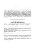 Lawyer's Oath I, do solemnly swear that I will maintain allegiance to the Republic of the Philippines, I will support the Constitution and obey the laws as well as the legal orders of the duly constituted authorities therein; I will do no falsehood, nor consent to the doing of any in court; I will not wittingly or willingly promote or sue any groundless, false or unlawful suit, or give aid nor consent to the same; I will delay no man for money or malice, and will conduct myself as a lawyer according to the best of my knowledge and discretion, with all good fidelity as well to the courts as to my clients; and I impose upon myself these voluntary obligations without any mental reservation or purpose of evasion. So help me God. CODE OF PROFESSIONAL RESPONSIBILITY (Promulgated June 21, 1988) CHAPTER I. THE LAWYER AND SOCIETY CANON 1 - A LAWYER SHALL UPHOLD THE CONSTITUTION, OBEY THE LAWS OF THE LAND AND PROMOTE RESPECT FOR LAW OF AND LEGAL PROCESSES. Rule 1.01 - A lawyer shall not engage in unlawful, dishonest, immoral or deceitful conduct. ule 1.02 - A lawyer shall not counsel or abet activities aimed at defiance of the law or R at lessening confidence in the legal system. Rule 1.03 - A lawyer shall not, for any corrupt motive or interest, encourage any suit or proceeding or delay any man's cause. Rule 1.04 - A lawyer shall encourage his clients to avoid, end or settle a controversy if it will admit of a fair settlement. CANON 2 - A LAWYER SHALL MAKE HIS LEGAL SERVICES AVAILABLE IN AN EFFICIENT AND CONVENIENT MANNER COMPATIBLE WITH THE INDEPENDENCE, INTEGRITY AND EFFECTIVENESS OF THE PROFESSION. Rule 2.01 - A lawyer shall not reject, except for valid reasons, the cause of the defenseless or the oppressed. Rule 2.02 - In such cases, even if the lawyer does not accept a case, he shall not refuse to render legal advice to the person concerned if only to the extent necessary to safeguard the latter's rights. Rule 2.03 - A lawyer shall not do or permit to be done any act designed primarily to solicit legal business. Rule 2.04 - A lawyer shall not charge rates lower than those customarily prescribed unless the circumstances so warrant. CANON 3 - A LAWYER IN MAKING KNOWN HIS LEGAL SERVICES SHALL USE ONLY TRUE, HONEST, FAIR, DIGNIFIED AND OBJECTIVE INFORMATION OR STATEMENT OF FACTS. Rule 3.01 - A lawyer shall not use or permit the use of any false, fraudulent, misleading, deceptive, undignified, self-laudatory or unfair statement or claim regarding his qualifications or legal services. Rule 3.02 - In the choice of a firm name, no false, misleading or assumed name shall be used. The continued use of the name of a deceased partner is permissible provided that the firm indicates in all its communications that said partner is deceased. Rule 3.03 - Where a partner accepts public office, he shall withdrawal from the firm and his name shall be dropped from the firm name unless the law allows him to practice law currently. Rule 3.04 - A lawyer shall not pay or give anything of value to representatives of the mass media in anticipation of, or in return for, publicity to attract legal business. CANON 4 - A LAWYER SHALL PARTICIPATE IN THE DEVELOPMENT OF THE LEGAL SYSTEM BY INITIATING OR SUPPORTING EFFORTS IN LAW REFORM AND IN THE IMPROVEMENT OF THE ADMINISTRATION OF JUSTICE. CANON 5 - A LAWYER SHALL KEEP ABREAST OF LEGAL DEVELOPMENTS, PARTICIPATE IN CONTINUING LEGAL EDUCATION PROGRAMS, SUPPORT EFFORTS TO ACHIEVE HIGH STANDARDS IN LAW SCHOOLS AS WELL AS IN THE PRACTICAL TRAINING OF LAW STUDENTS AND ASSIST IN DISSEMINATING THE LAW AND JURISPRUDENCE. CANON 6 - THESE CANONS SHALL APPLY TO LAWYERS IN GOVERNMENT SERVICES IN THE DISCHARGE OF THEIR TASKS. Rule 6.01 - The primary duty of a lawyer engaged in public prosecution is not to convict but to see that justice is done. The suppression of facts or the concealment of witnesses capable of establishing the innocence of the accused is highly reprehensible and is cause for disciplinary action. Rule 6.02 - A lawyer in the government service shall not use his public position to promote or advance his private interests, nor allow the latter to interfere with his public duties. Rule 6.03 - A lawyer shall not, after leaving government service, accept engagement or employment in connection with any matter in which he had intervened while in said service. CHAPTER II. THE LAWYER AND THE LEGAL PROFESSION CANON 7 - A LAWYER SHALL AT ALL TIMES UPHOLD THE INTEGRITY AND DIGNITY OF THE LEGAL PROFESSION AND SUPPORT THE ACTIVITIES OF THE INTEGRATED BAR. Rule 7.01 - A lawyer shall be answerable for knowingly making a false statement or suppressing a material fact in connection with his application for admission to the bar. Rule 7.02 - A lawyer shall not support the application for admission to the bar of any person known by him to be unqualified in respect to character, education, or other relevant attribute. Rule 7.03 - A lawyer shall not engage in conduct that adversely reflects on his fitness to practice law, nor shall he whether in public or private life, behave in a scandalous manner to the discredit of the legal profession. CANON 8 - A LAWYER SHALL CONDUCT HIMSELF WITH COURTESY, FAIRNESS AND CANDOR TOWARDS HIS PROFESSIONAL COLLEAGUES, AND SHALL AVOID HARASSING TACTICS AGAINST OPPOSING COUNSEL. Rule 8.01 - A lawyer shall not, in his professional dealings, use language which is abusive, offensive or otherwise improper. Rule 8.02 - A lawyer shall not, directly or indirectly, encroach upon the professional employment of another lawyer, however, it is the right of any lawyer, without fear or favor, to give proper advice and assistance to those seeking relief against unfaithful or neglectful counsel. CANON 9 - A LAWYER SHALL NOT, DIRECTLY OR INDIRECTLY, ASSIST IN THE UNAUTHORIZED PRACTICE OF LAW. Rule 9.01 - A lawyer shall not delegate to any unqualified person the performance of any task which by law may only be performed by a member of the bar in good standing. Rule 9.02 - A lawyer
