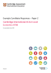 Example Candidate Responses – Paper 2 Cambridge International AS & A Level Economics 9708 For examination from 2020 Version 1 In order to help us develop the highest quality resources, we are undertaking a continuous programme of review; not only to measure the success of our resources but also to highlight areas for improvement and to identify new development needs. We invite you to complete our survey by visiting the website below. Your comments on the quality and relevance of our resources are very important to us. www.surveymonkey.co.uk/r/GL6ZNJB Would you like to become a Cambridge International consultant and help us develop support materials? Please follow the link below to register your interest. www.cambridgeinternational.org/cambridge-for/teachers/teacherconsultants/ Copyright © UCLES 2021 Cambridge Assessment International Education is part of the Cambridge Assessment Group. Cambridge Assessment is the brand name of the University of Cambridge Local Examinations Syndicate (UCLES), which itself is a department of the University of Cambridge. UCLES retains the copyright on all its publications. Registered Centres are permitted to copy material from this booklet for their own internal use. However, we cannot give permission to Centres to photocopy any material that is acknowledged to a third party, even for internal use within a Centre. Contents Introduction.......................................................................................................................................................................4 Question 1........................................................................................................................................................................6 Example Candidate Response – high..............................................................................................................................6 Example Candidate Response – middle..........................................................................................................................9 Example Candidate Response – low..............................................................................................................................12 Question 2......................................................................................................................................................................16 Example Candidate Response – high............................................................................................................................16 Example Candidate Response - middle.........................................................................................................................18 Example Candidate Response – low..............................................................................................................................20 Question 3......................................................................................................................................................................22 Example Candidate Response – high............................................................................................................................22 Example Candidate Response – middle........................................................................................................................25 Example Candidate Response – low..............................................................................................................................26 Question 4.......................................................................................................................................................................28 Example Candidate Response – high............................................................................................................................28 Example Candidate Response – middle.........................................................................................................................31 Example Candidate Response – low..............................................................................................................................34 Example Candidate Responses - Paper 2 Introduction The main aim of this booklet is to exemplify standards for those teaching Cambridge AS & A Level Economics 9708, and to show how different levels of candidates’ performance (high, middle and low) relate to the subject’s curriculum and assessment objectives. In this booklet candidate responses have been chosen from the November 2020 series to exemplify a range of answers. For each question, the response is annotated with a clear explanation of where and why marks were awarded or omitted. This is followed by examiner comments on how the answer could have been improved. In this way, it is possible for you to understand what candidates have done to gain their marks and what they could do to improve their answers. There is also a list of common mistakes candidates made in their answers for each question. This document provides illustrative examples of candidate work with examiner commentary. These help teachers to assess the standard required to achieve marks beyond the guidance of the mark scheme. Therefore, in some circumstances, such as where exact answers are required, there will not be much comment. The questions and mark schemes used here are available to download from the School Support Hub. These files are: November 2020 Question Paper 22 November 2020 Paper 22 Mark Scheme Past exam resources and other teacher support materials are available on the School Support Hub: www.cambridgeinternational.org/support 4 Example Candidate Responses - Paper 2 How to use this booklet This booklet goes through the paper one question at a time, showing you the high-, middle- and low-level response for each question. The candidate answers are set in a table. In the left-hand column are the candidate answers, an