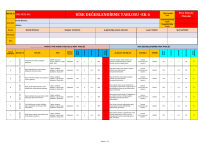BÖLÜM / İŞ RİSK DEĞERLENDİRME TABLOSU -EK 6 SGK SİCİL NO: Risk Analizi Türü Gerçekleştirildiği Tarihi Firma Ünvanı: boya işleri Geçerlilik Bitiş Tarihi Adresi: Destek Elemanı Ünvanı Fine Kinney Metodu Çalışan Temsilcisi iş güvenliği uzmanı (Asınıfı) iş yeri hekimi İşveren/Vekili Adı Soyadı İmza RİSK PUANI ÖNLEM DERECESİ 40 3 2 240 B Boya İşleri Boya ekipmanlarının sıcak çalışma bölgesinde bulundurulması Yangın, parlama, patlama, iş günü kaybı, yaralanma, toplu ölüm Çalışanlar 100 6 0,5 300 Boya İşleri Boya hortumları üzerine sıcak çapak ve kıvılcım gelmesi Yangın, parlama, patlama, iş günü kaybı, yaralanma, toplu ölüm Çalışanlar 100 3 1 Boya İşleri Boya yapılan kapalı alanların çevre perdelerinde sıcak çalışma yapılması Yangın, parlama, patlama, iş günü kaybı, yaralanma, toplu ölüm Çalışanlar 100 6 Boya İşleri Kapalı alanlarda boya yapılırken sürekli olarak gaz ölçümü alınmaması Yangın, parlama, patlama, iş günü kaybı, yaralanma, toplu ölüm Çalışanlar 100 Gaz ölçümlerinin solvetin özelliğine uygun seviyeden alınmaması( alttan veya üstten) Yangın, parlama, patlama, iş günü kaybı, yaralanma, toplu ölüm Çalışanlar Boya yapılan alanda veya yakınlarında sıcak çalışma yapılması Yangın, parlama, patlama, iş günü kaybı, yaralanma, toplu ölüm Çalışanlar 3 4 5 6 7 TERMİN ÖNLEM DERECESİ FREKANS Çalışanlar 2 SORUMLU RİSK PUANI OLASILIK Elektrik çarpması, yangın, parlama, iş günü kaybı, ölüm 1 TEHLİKE FREKANS ZARAR / ŞİDDET Boya İşleri Pompa tabanın iletken yüzeyden yalıtılması BÖLÜM / İŞ OLASILIK MARUZ KALAN ANALİZ NUMARASI ZARAR / ŞİDDET RİSK Boya İşleri SON DEĞERLENDİRME RİSK ANALİZİ Boya İşleri …………………. TARİHLİ FINE KINNEY METODLU RİSK ANALİZİ Pompalar yalıtkan örtüler (naylon vb.) üzerine konuşlandırılmamalı, iletken yüzeyde durması sağlanmalıdır. İşveren (Asıl işveren-alt işveren) Sürekli 40 1 1 40 D B Boya ekipmanları sıcak çalışma yapılan yerlerde veya yakınlarında konuşlandırılmamalıdır. İşveren (Asıl işveren-alt işveren) Sürekli 100 1 0,5 50 D 300 B Boya hortumları sıcak çalışma yapılan yerlerde veya yakınlarında konuşlandırılmamalıdır. İşveren (Asıl işveren-alt işveren) Sürekli 100 1 0,5 50 D 0,5 300 B Boya yapılan alanın çevre perdelerinde sıcak çalışma yapılmamalı, böyle bir durum görüldüğünde tersane iş güvenliği ekibine haber verilmelidir. İşveren (Asıl işveren-alt işveren) Sürekli 100 1 0,5 50 D 3 1 300 B Boya yapılan kapalı alanda 15 dakikada bir gaz ölçümü alınmalı, tehlikeli değerler ölçüldüğünde çalışmaya devam edilmemelidir. İşveren (Asıl işveren-alt işveren) Sürekli 100 1 0,5 50 D 100 3 1 300 B Gaz ölçümü solventin yoğunluğuna göre kapalı alanda nerede birikebileceği düşünelerek yapılmalıdır. İşveren (Asıl işveren-alt işveren) Sürekli 100 1 0,5 50 D 100 6 0,5 300 B Boya yapılan alanda ve yakınlarında sıcak çalışma yapılmamalı, böyle bir durum oluştuğunda tersane iş güvenliği ekibine bilgi verilmelidir. İşveren (Asıl işveren-alt işveren) Sürekli 100 1 0,5 50 D Sayfa 1 / 10 ALINACAK ÖNLEMLER BÖLÜM / İŞ RİSK DEĞERLENDİRME TABLOSU -EK 6 SGK SİCİL NO: Risk Analizi Türü Gerçekleştirildiği Tarihi Firma Ünvanı: boya işleri Geçerlilik Bitiş Tarihi Adresi: Destek Elemanı Ünvanı Fine Kinney Metodu Çalışan Temsilcisi iş güvenliği uzmanı (Asınıfı) iş yeri hekimi İşveren/Vekili Adı Soyadı İmza Pompalar üzerinde bulunan tahliye valflerinin çalışmaması 12 Pompa üzerinde bulunan hava ve sıvı transfer valflerinin çalışmaması 13 Pompa çıkış ve hortum bağlantılarının sağlam olmaması ÖNLEM DERECESİ 11 RİSK PUANI Boya İşleri Pompanın topraklamasının yapılmadan çalıştırılması FREKANS 10 OLASILIK Boya İşleri Boya hortumlarının keskin kenarlı, hareketli parçaların, sıcak yüzeylerin yakınından, araç geçişinin olduğu yerlerden geçirilmesi TERMİN ZARAR / ŞİDDET 9 8 SORUMLU İşveren (Asıl işveren-alt işveren) Çalışanlar Sürekli 40 1 1 40 D Çalışanlar 40 3 2 240 B Delinme, kimyasala maruziyet, yaralanma, yüksekten düşme, iş günü kaybı, ölüm Çalışanlar 40 6 1 240 B Boya hortumları zarar görebilecek yerlerde konuşlandırılmamalıdır. Çalışanlara eğitim verilmeli. Çalışanlar da verilen eğitimler sonrası kural ve talimatlara uymalı, gereken özen ve dikkati göstermelidirler. İşveren (Asıl işveren-alt işveren) Çalışanlar Sürekli 40 1 1 40 D Elektrik çarpması, yangın, parlama, iş günü kaybı, ölüm Çalışanlar 40 1 2 80 C Boya işlerinde kullanılan tüm pompa ve elektrikli ekipmanlar topraklanmalıdır. İşveren (Asıl işveren-alt işveren) Sürekli 40 1 1 40 D Sıkışma, patlama, kimyasala maruziyet, iş günü kaybı Çalışanlar 15 3 2 90 C Çalışmaya başlanmadan önce pompalar detaylı şekilde kontrol edilmeli, valfleri olmayan veya hasarlı olan pompalarla çalışılmamalıdır. İşveren (Asıl işveren-alt işveren) Sürekli 15 1 1 15 E Sıkışma, patlama, kimyasala maruziyet, iş günü kaybı Çalışanlar 15 3 2 90 C Çalışmaya başlanmadan önce pompalar detaylı şekilde kontrol edilmeli, hava ve sıvı valfleri olmayan veya hasarlı olan pompalarla çalışılmamalıdır. Çalışanlara eğitim verilmeli. Çalışanlar da verilen eğitimler sonrası kural ve talimatlara uymalı, gereken özen ve dikkati göstermelidirler. İşveren (Asıl işveren-alt işveren) Çalışanlar Sürekli 15 1 1 15 E Kopma, savrulma, yaralanma, iş günü kaybı, uzuv kaybı Çalışanlar 15 3 2 90 C Pompa çıkış ve hortum bağlantı vidaları iyi şekilde sıkılmalı, periyodik olarak kontrol edilerek gevşemesi önlenmelidir. İşveren (Asıl işveren-alt işveren) Sürekli 15 1 1 15 E FREKAN