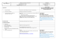 ALS WEEKLY LESSON LOG CLC Teacher Teaching Dates Tue Community Learning Center PORTIA D. SALES APRIL 4-8, 2022 Learning Area Quarter JHS ENGLISH 1 (ANNOTATIONS) -PPST INDICATORS/ KRA OBJECTIVES/RUBRIC INDICATORS TO BE OBSERVED DURING THE CLASSROOM OBSERVATION I. OBJECTIVES A. Content Standards Demonstrates understanding of text types for comprehension. B. Performance Standards Identifies story perspective of text elements. C. Learning Competencies/ Objectives Write the LC code for each. Knowledge: Summarize the information from a text heard, (ENGLC-IVf2.23) -Define what is a summary -Create a summary from a given informational text Skill: Perform the given tasks individually, by pair and by group following the given house rules/standards/guidelines. Attitude: Observe politeness at all times, (ENGA-IId-16) II. CONTENT/TOPIC Level PPST MODULE 7 KRA 3, OBJ. # 7 MT I-IV RUBRIC, INDICATOR 5 -Plans, manages and implements developmentally sequenced teaching and learning processes to meet curriculum requirements through various contexts. MOV--- Knowledge, skill and attitude or KSA is applied in lesson planning objectives in order to meet curriculum requirements based on the Curriculum Guide/CG. Parts of the DLP are based on the PPST Modules. Summarizing an Information From a Text Heard II. LEARNING RESOURCES A. References 1. Teacher’s Guide pages English CG for Grade 6 page 138-139 2. Learner’s Materials pages 3. Textbook pages 4. Additional Materials from Learning Resource (LR) portal B. Other Learning Resources Essential English Work text 6 pages 356 Essential English Teacher’s Resource Material 6 pages 254-255 Pictures LCD projector, laptop, power point presentation, activity cards, meta cards, cartolina, realia, video clip Video clip-A Visit To The Farm https://www.youtube.com/watch?v=yIVufl8FN0E PPST MODULE 9 KRA 3, OBJ. # 9 -Selects, develops, organizes and uses appropriate teaching and learning resources, including ICT, to address learning goals. MOV---The difficult words and their meanings, pictures, video and selections are presented clearly through power point presentation. MOV---Realia and printed materials like activity cards are given on clear sheets of cartolina and meta cards for the pupils to see and read clearly. IV. PROCEDURES A. Reviewing previous lesson or presenting the new lesson *Giving of CLC Rules ( tacked on the board) * The 5 P’s: 1. Be Positive 2. Be Productive 3. Be Polite 4. Be Prepared 5. Be ResPectful 1. 2. 3. 4. 5. 6. 7. 8. 9. Be on time at the beginning of the day and after lunch or recess breaks. Come prepared with supplies and completed assignments. Be kind, polite and courteous to others. Keep your hands and feet to yourself. Be respectful of classmates, teachers and property. Listen to the teacher and classmates, and follow directions. Work hard and always do your best. Be safe. Raise your hand when you would like to speak in class or if you need to leave the classroom for any reason. PPST MODULE 5 KRA 2, OBJ. # 5 MT I-IV RUBRIC, INDICATOR 4 -Manages learner behaviour constructively by applying positive and non-violent discipline to ensure learning-focused environment. MOV---To avoid and prevent misbehaviour, house rules/ standards/guidelines are set before the class starts or before doing an activity. PPST MODULE 2 MT I-IV RUBRIC, INDICATOR 2 -Applies a range of teaching strategies that enhance learner achievement in literacy and numeracy skills. MOV---Literacy in giving and understanding the meaning of words is shown during the Unlocking of Difficulties. *Review: What is an Informational Text? -Show through power point presentation. *Unlocking of Difficulties: --What is a summary? (Power Point Presentation) *Identify the meaning of the underlined words from the choices given: 1. The country’s climate is ideal for growing grapes. 2. An ecosystem is comprised of all the non-living elements and living species in a specific local environment. 3. Corn production is a large part of the agricultural industry in Cebu. 4. The flowers depend on bees for pollination. 5. Irrigation provides water to plants. -the watering of land by artificial means to foster plant growth and production. -the transfer of pollen from a male part of a plant to a female part of a plant -the process of making or growing something for sale or use -the complex of a community of organisms and its environment functioning as an ecological unit -the usual weather conditions in a particular place or region PPST Module1 KRA 1, OBJ. # 1 MT I-IV RUBRIC, INDICATOR 1 -Applies knowledge of content within and across curriculum teaching areas. MOV---Science context is integrated in the Unlocking of Difficulties. B. Establishing a purpose for the lesson/Motivation/Motive Questions *Ask: Who has a farm? Have you visited a farm? What can you see in the farm? *Show a video clip entitled, “A Visit To The Farm”. https://www.youtube.com/watch?v=yIVufl8FN0E I have here a video clip showing how a good climate contributes to healthy production of animals and plants in the farm. Take note of the key points so we can give a summary at the end. C. Presenting examples/instances of the new lesson Ask: What do you see in the video? Are the animals and plants healthy? Why? Why is it important to have healthy plants and animals? Do you think there are enough food for the farmer’s family? Why? Do they need to buy food from the market? Why? Who can save more money, the one with a farm or the one without a farm? Why? What food do you think is healthier to eat, the one you grow or the one you buy from the market? Why? What do you think is the climate of the place? Is it hot/dry or rainy/wet? Too hot/too rainy? Or just moderate? What do you think will happen to the farmer’s farm if the climate is not favourable for his plants and animals? What will happen to his farm if the climate is too hot or too wet? What is the video about? Who will try to give the summary of the video? *Show a picture of a farm destroye