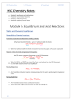 HSC Chemistry Notes Yr 12 Chemistry By Tayyab Awais 23/02/2022 HSC Chemistry Notes: Module 5: Equilibrium and Acid Reactions Module 6: Acid and Base Reactions Module 7: Organic Chemistry Module 8: Applying Chemical Ideas Module 5: Equilibrium and Acid Reactions Static and Dynamic Equilibrium Reversibility of chemical reactions: Formation of hydrated and dehydrated cobalt (II) chloride: Dehydrated cobalt (II) chloride + water ⇌ hydrated cobalt (II) chloride CoCl2 + 6H2O ⇌ CoCl2∙6H2O Blue pink When the hydrated cobalt (II) chloride is heated, it becomes blue again as the water evaporated. Reaction of Iron (III) nitrate and potassium thiocyanate: Iron (III) nitrate + potassium thiocyanate ⇌ iron (iii) thiocyanate Fe3+(aq) + SCN-(aq) ⇌ FeSCN2+(aq) Pale yellow colourless red When (Fe (NO3)3) and (KSCN) are mixed, they form a red-coloured ion, iron (III) thiocyanate Is a reversible reaction and forms an equilibrium Burning Magnesium: 2Mg(s) + O2 2MgO(s) An irreversible combustion reaction, releasing energy into the system, producing white magnesium oxide. Burning Steel Wool: 3 2Fe (s) + O2 (g) Fe2O3 (s) 2 pg. 1 An irreversible reaction and is a combustion reaction. As the steel wool caught on fire and went red with sparks flying out. HSC Chemistry Notes Yr 12 Chemistry By Tayyab Awais 23/02/2022 Static and dynamic equilibrium and differences between closed and open systems: Equilibrium: A situation in which both the forward and reverse reaction are equal in a closed system. Reversible reaction: Reaction that can proceed in either direction depending on the prevailing conditions, reaction that can go backwards. Characteristics of equilibrium: At chemical equilibrium, the rate of forward and reverse reactions is equal. Occurs in a closed system The position of equilibrium is not affected by a catalyst The concentrations of the reactants and products reach constant values at equilibrium Change is occurring at a microscopic level, atoms and molecules are constantly changing Homogenous equilibrium: refers to a state of equilibrium in which all the involved species (reactants and products) are in the same state/phase. CH3COOH (aq) ⇌ CH3COO-(aq) + H+(aq) Heterogenous equilibrium: A reaction in which the substances are in different states. NiCl2(s) ⇌ Ni2+(aq) + 2Cl-(aq) Static Equilibrium: Static equilibrium: Occurs when the rates of the forward and reverse reactions both are equal to zero. Occurs when nothing is happening in a reaction and the equilibrium of system is at rest. - E.g. Conversion of graphite into diamond is considered is at a static equilibrium C (diamond) ⇌ C (graphite) When at room temperature, neither reaction can be seen. A limiting reagent reaction is another example of static equilibrium, once the limiting reagent has been used up, neither the forward nor reverse reaction will occur. Dynamic Equilibrium: Dynamic equilibrium: refers to a system, in which the rate of the forward reaction is equal to the rate of the reverse reactions as they are occurring at the same time and rate, so no net change. pg. 2 No observable change occurs, but the forward and reverse reactions are occurring at an atomic level. - E.g. Two people shovelling dirt into each other’s piles at the same rate. Piles stay the same, but both are still shovelling. System needs to be closed for a dynamic equilibrium and is a type of a steady state but not all steady states are in equilibrium. Reaction between hydrogen and nitrogen is a reversible reaction that reaches dynamic equilibrium in closed container: 3H2(g) + N2(g) ⇌ 2NH3(g) HSC Chemistry Notes Yr 12 Chemistry By Tayyab Awais 23/02/2022 Steady State: Steady state is not always an equilibrium and can be achieved without a reversible reaction or a closed system. E.g. water is flowing into a sink and out of a sink at the same rate this is a steady state. The water level in the sink may ready constant and so this is a steady state, however, as there is matter and energy entering and leaving the system, not an equilibrium. Open System: Open System: A chemical system in which energy and matter can be exchanged by its surroundings (external environment). Closed System: Closed system: a chemical system that does not allow the flow of matter between the system and environment, only energy can be exchanged. Non-equilibrium system in terms of effect on entropy and enthalpy: Non-equilibrium system: A system that is not at equilibrium and can never reach an equilibrium state. These reactions involving such systems are considered irreversible. Irreversible reaction: reactions that go to completion, products cannot be turned back into reactants. Two types of non-equilibrium reactions include; Combustion reaction Photosynthesis reaction pg. 3 HSC Chemistry Notes Yr 12 Chemistry By Tayyab Awais 23/02/2022 Combustion Reactions: Combustion reactions are irreversible exothermic reaction that involves combining of a substance with oxygen. Reaction is in one direction, products cannot reverse back into reactants Enthalpy of combustion is always negative as energy is always released into the environment. Most combustion reactions occur spontaneously, especially when entropy is increasing. Both entropy and enthalpy are drivers of combustion. Photosynthesis Reactions: A reaction by which plants transform light energy into chemical energy due to green pigment chlorophyll Photosynthesis is a photochemical process which is an endothermic chemical process and involves the reduction of carbon. Photosynthesis consists of a series of reaction steps, but overall reaction be shown by equation below: sunlight 6CO2(g) + 6H2O(l) → C6H12O6(aq) + 6O2(g) chlorophyll Not a spontaneous reaction as energy of the products is greater than the energy of reactants Whilst respiration looks like the reverse of photosynthesis, neither are reversible reactions, each go to complete and do not reach equilibrium. Collision Theory and Reaction Rate: Collison theory is a model that explains ho