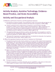 AOTA’s NBCOT® Exam Prep Activity Analysis, Assistive Technology, EvidenceBased Practice, and Home Accessibility Activity and Occupational Analysis I. Definition and Goals of Activity and Occupational Analysis A. Occupational analysis includes contexualization of the activity from the perspective of the client’s situation and desires (needs and wants) for occupation. (AOTA, 2020). B. Activity analysis involves analyzing an occupation or activity from a broader perspective within a given culture without contextualization. “Many professions use activity analysis, whereas occupational analysis requires the understanding of occupation as distinct from activity and brings an occupational therapy perspective to the analysis process” (Schell et al., 2019, in AOTA, 2020, p. 19). C. “Occupational therapy practitioners analyze the demands of an occupation or activity to understand the performance patterns, performance skills, and client factors that are required to perform it” (AOTA, 2020, pp. 19–20). D. “The goal of occupational or activity analysis is to identify the demands of occupations and activities on the client” (AOTA, 2020, p. 22). II. When Occupational Analysis and Activity Analysis Are Performed A. Occupational analysis and activity analysis are one part of the analysis of occupational performance. On reviewing a client’s evaluation and goals, occupational therapists may begin to design a client-centered and occupation-based treatment plan that targets specific performance skills they have selected. On the basis of the client’s health condition and ability, preferences, and needs, occupational therapists select an appropriate therapeutic occupation or activity on the basis of their thorough knowledge of activities. B. Quick analyses of occupations and activities are ongoing as occupational therapists deliver a treatment session; occupational therapists must, of course, be flexible in their treatment plan. For instance, suppose an occupational therapist had intended to review fall prevention strategies with the client during a breakfast preparation task but learns at the start of the session that the client has already eaten and is not hungry. A new plan must be proposed; the occupational therapist chooses to review the fall prevention techniques by having the client perform a similar task of gathering and folding clothes (Crepeau et al., 2014, pp. 244–247). III. Format of Activity Analysis A. Identify occupation or activity demands, person capabilities, and context to determine which aspects to target in intervention (Grabanski & Janssen, 2020). Copyright © 2022 by the American Occupational Therapy Association. All rights reserved. For permissions, contact www.copyright.com. Rev. 9/2022 1 AOTA’s NBCOT® Exam Prep 1. Activity demands are the “aspects of an activity needed to carry it out, including relevance and importance to the client, objects used and their properties, space demands, social demands, sequencing and timing, required actions and performance skills, and required underlying body functions and body structures” (AOTA, 2020, p. 74; see Table 11, p. 57). 2. Person capabilities include performance patterns, performance skills, and client factors. a. Performance patterns are used in the process of engaging in occupations and may support or hinder performance (AOTA, 2020, p. 12). Performance patterns consist of i. Habits ii. Routines iii. Roles iv. Rituals (AOTA, 2020, Table 6). b. Performance skills are “observable, goal-directed actions that result in a client’s quality of performing desired occupations” (AOTA, 2020, p. 80). Performance skills are typically categorized as follows: i. Motor skills ii. Process skills iii. Social interaction skills (AOTA, 2020, Table 7). c. Client factors relate to specific person capabilities that are within the person and impact occupational performance (AOTA, 2020, p. 14). Client factors consist broadly of three categories: i. Values, beliefs, spirituality ii. Body functions iii. Body structures (AOTA, 2020, Table 9). 3. “Context is the broad construct that encompasses environmental factors and personal factors” (AOTA, 2020, pp. 9, 36–40). Context can affect occupational performance. a. Personal factors relate to a person’s background of demographic factors, customs, and beliefs. These are not considered positive or negative; rather, they are considered internal to the individual. Some examples of personal factors include age, gender, sexual orientation, cultural identification, and social background (AOTA, 2020, Table 5). b. Environmental factors are physical, social, and attitudinal elements that surround the individual. Environmental factors generally facilitate or hinder a person’s functioning and are external to the individual (AOTA, 2020). Examples include natural and human-made elements, products and technology, relationships, and services and policies (AOTA, 2020, Table 4) and include environmental demands such as space demands, equipment height, work space surface area, visual contrast, social demands, and temperature (Grabanski & Janssen, 2020, Table 3-1). B. Match the activity with the chosen theoretical lens. 1. When working with people whose injuries warrant a biomechanical approach, analyze activities in terms of the typical strength, ROM, and endurance needed to perform them (Crepeau et al., 2014, p. 236). 2. For people who have mental illness, analyze activities by their use of social skills, communication, and emotion regulation capabilities (Crepeau et al., 2014, p. 244). C. Adjust the difficulty level of the occupation or activity using a variety of approaches to promote client performance. Copyright © 2022 by the American Occupational Therapy Association. All rights reserved. For permissions, contact www.copyright.com. Rev. 9/2022 2 AOTA’s NBCOT® Exam Prep 1. Grading a. Based on a client’s performance, grading involves increasing (“upgrading”) or decreasing (“downgr