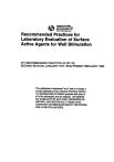 RP 42 Pruebas de Laboratorio de Agentes Activos Superficiales para Estimulación de Pozos Prácticas recomendadas para el análisis en laboratorio de Agentes Activos de Superficie para la Estimulación de Pozos. Prólogo a. Estas prácticas recomendadas fueron elaboradas por el subcomité API en Evaluación de los Fluidos de Estimulación. Representan los procedimientos utilizados por un gran número de industrias de la operación y compañías de servicio. Estas prácticas han sido revisadas tanto en su contenido como en su precisión por las compañías representadas en el Subcomité de Evaluación de Fluidos de Estimulación de Pozos y por el Comité Ejecutivo de Práctica de Perforación y Producción. Esta publicación esta bajo la jurisdicción del Comité Ejecutivo del Departamento de Producción del American Petroleum Institute para la Práctica de la Perforación y Producción. b. Esta Segunda Edición sustituye y reemplaza a la API RP 42, primera edición, de Noviembre de 1962. c. Esta edición no presenta recomendaciones que no pueden ser tomadas como pruebas absolutas para la determinación de procedimientos de estimulación de pozos. Por otro lado, estas pruebas principalmente son una comparación cualitativa del desempeño y una proyección general de los agentes activos de superficie bajo las condiciones aquí descritas. d. Esta publicación API puede ser utilizada por cualquier persona que desee hacerlo, el Instituto ha realizado mucho esfuerzo para asegurar la precisión y confiabilidad de los datos contenidos. No obstante, el Instituto no representa, garantiza ni otorga garantía en conexión con la publicación de cualquier especificación API o práctica recomendada y tampoco otorga cualquier exigencia o responsabilidad en la pérdida o daño resultante derivado de su uso, por cualquier violación de cualquier regulación Federal, Estatal, o local con la cual tales publicaciones puedan crear conflicto, o por infringir cualquier patente resultante del uso de una especificación o práctica recomendada de API. e. Consideraciones de salud y seguridad. Los efectos potenciales en salud y seguridad de cualquier exposición química son dependientes de la concentración y del lapso de exposición. Cada uno deberá minimizar su exposición a los químicos. Se sugiere las siguientes precauciones generales: 1. Minimizar el contacto con la piel y con los ojos y la respiración de los vapores. 2. Mantenerlos alejados de la boca; puede ser dañino o fatal si se traga o aspira. 3. Mantener los contenedores cerrados cando no se utilicen. 4. Mantener las áreas de trabajo tan limpias como sea posible y bien ventiladas. 5. Limpiar los derrames inmediatamente de acuerdo a las regulaciones de seguridad, salud y medio ambiente. 6. observar los límites establecidos de exposición* y hacer uso apropiado de equipo y ropa protectora. Los empleados deben consultar y cumplir con las regulaciones vigentes de seguridad ocupacional y administración de la salud, 29 CFR Sec. 1910.1450 Occupational Exposure to Hazardous Chemicals in the Laboratory** en su forma mas actual promulgada. PARA INFORMACIÓN ADICIONAL CONSULTAR CON EL EMPLEADOR Y BUSCAR LAS HOJAS DE DATOS DE SEGURIDAD DEL MATERIAL. RP 42 Pruebas de Laboratorio de Agentes Activos Superficiales para Estimulación de Pozos RP 42 Pruebas de Laboratorio de Agentes Activos Superficiales para Estimulación de Pozos Prácticas recomendadas para el análisis en laboratorio de Agentes Activos Superficiales para la Estimulación de Pozos. Alcance A. Los agentes activos superficiales frecuentemente son adicionados a los fluidos de tratamientos para la estimulación de pozos de aceite, gas y de inyección para mejorar uno o mas de las siguientes funciones: a. Prevenir o minimizar la emulsificación de los fluidos de tratamiento con los fluidos de la formación b. Reducir la saturación de agua c. Alterar la mojabilidad d. Suspender las partículas finas desplazadas por el tratamientos por remoción o redistribución, y e. Estabilizar la espuma o emulsión en el fluido de tratamiento. B. Esta diversidad de funciones da como resultado la disponibilidad de un gran número de productos para el uso en las operaciones de producción de petróleo. Las pruebas de los agentes activos superficiales como se describe aquí es principalmente una comparación cualitativa del rendimiento y una proyección general relacionada al Párrafo A precedente, punto 1-4. Los procedimientos serán dados para lo siguiente: a. Pruebas de emulsión y lodo asfáltico, b. Medición del flujo de fluido a través de un núcleo, c. Medición de la tensión interfacial, y d. Medición de la mojabilidad. C. Debido a que la actividad química de un agente activo superficial (surfactante) depende de su naturaleza química, presión, temperatura y tiempo, se aconseja al usuario probar el surfactante en presencia de todos los aditivos a ser utilizados en el tratamiento de campo en la concentración apropiada. Los lotes de producción y la vida de almacenamiento puede efectuar variaciones en las propiedades de los agentes surfactantes, por lo que en muchos casos incluso estos puntos deben ser considerados en la evaluación de los agentes surfactantes. Sección 1 Pruebas de Emulsión para la caracterización de Agentes Activos Superficiales en Ácido, Salmuera o Aceite. USO Y PROPÓSITO DE LA PRUEBA DE EMULSION 1. El propósito de la prueba de emulsión es para indicar la tendencia de un agente activo superficial a incrementar o decrementar la emulsificación de un sistema aceite-salmuera o ácido-aceite particular. Estas pruebas están diseñadas para indicar la tendencia de un sistema a emulsificar pero no determina si la emulsificación realmente ocurre o se persisten durante las operaciones de estimulación. Debido a que la estabilidad de las emulsiones pueden ser incrementadas por la presencia de sólidos finamente divididos frecuentemente creados durante los procesos de la estimulació