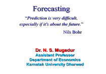 Forecasting “Prediction is very difficult, especially if it's about the future.” Nils Bohr Dr. N. S. Mugadur Assistant Professor Department of Economics Karnatak University Dharwad Objectives • Give the fundamental rules of forecasting • Calculate a forecast using a moving average, weighted moving average, and exponential smoothing • Calculate the accuracy of a forecast What is forecasting? Forecasting is a tool used for predicting future demand based on past demand information. Why is forecasting important? Demand for products and services is usually uncertain. Forecasting can be used for… • Strategic planning (long range planning) • Finance and accounting (budgets and cost controls) • Marketing (future sales, new products) • Production and operations What is forecasting all about? We try to predict the future by looking back at the past Demand for Mercedes E Class Jan Feb Mar Apr May Jun Jul Aug Actual demand (past sales) Predicted demand Time Predicted demand looking back six months Some general characteristics of forecasts • Forecasts are always wrong • Forecasts are more accurate for groups or families of items • Forecasts are more accurate for shorter time periods • Every forecast should include an error estimate • Forecasts are no substitute for calculated demand. What Makes a Good Forecast? • • • • • • It should be timely It should be as accurate as possible It should be reliable It should be in meaningful units It should be presented in writing The method should be easy to use and understand in most cases. Key issues in forecasting 1. A forecast is only as good as the information included in the forecast (past data) 2. History is not a perfect predictor of the future (i.e.: there is no such thing as a perfect forecast) REMEMBER: Forecasting is based on the assumption that the past predicts the future! When forecasting, think carefully whether or not the past is strongly related to what you expect to see in the future… What should we consider when looking at past demand data? • Trends • Seasonality • Cyclical elements • Autocorrelation • Random variation Some Important Questions • What is the purpose of the forecast? • Which systems will use the forecast? • How important is the past in estimating the future? Answers will help determine time horizons, techniques, and level of detail for the forecast. Types of forecasting methods Qualitative methods Quantitative methods Rely on subjective opinions from one or more experts. Rely on data and analytical techniques. Forecasting Models Forecasting Techniques Qualitative Models Time Series Methods Delphi Method Jury of Executive Opinion Sales Force Composite Consumer Market Survey Naive Moving Average Weighted Moving Average Exponential Smoothing Trend Analysis Causal Methods Simple Regression Analysis Multiple Regression Analysis Seasonality Analysis Multiplicative Decomposition Qualitative Forecasting Methods • • • • Delphi method Iterative group process allows experts to make forecasts Participants: decision makers: 5 -10 experts who make the forecast staff personnel: assist by preparing, distributing, collecting, and summarizing a series of questionnaires and survey results respondents: group with valued judgments who provide input to decision makers Jury of executive opinion – Opinions of a small group of high level managers, often in combination with statistical models. – Result is a group estimate. Sales force composite – Each salesperson estimates sales in his region. – Forecasts are reviewed to ensure realistic. – Combined at higher levels to reach an overall forecast. Consumer market survey. – Solicits input from customers and potential customers regarding future purchases. – Used for forecasts and product design & planning Qualitative forecasting methods Grass Roots: deriving future demand by asking the person closest to the customer. Market Research: trying to identify customer habits; new product ideas. Panel Consensus: deriving future estimations from the synergy of a panel of experts in the area. Historical Analogy: identifying another similar market. Delphi Method: similar to the panel consensus but with concealed identities. Advantages of Qualitative forecast: The mass of information (both quantifiable & unquantifiable) to come up with a prediction. Disadvantages : 1. There is no systematic way to measure or improve the accuracy of the forecast 2. There is a chance that the forecast may contain built in biases of the experts. Quantitative forecasting methods Time Series: models that predict future demand based on past history trends Causal Relationship: models that use statistical techniques to establish relationships between various items and demand Simulation: models that can incorporate some randomness and nonlinear effects Advantages of Quantitative Forecast: 1. 2. 3. 4. One of the choice of independent variable is made, forecast are based only on their predetermined values. There are ways to measure the accuracy of the forecast. Once the models are constructed, it is less time-consuming to generate forecasts. They have a means of forecasting point estimates/interval estimates. How should we pick our forecasting model? 1. Data availability 2. Time horizon for the forecast 3. Required accuracy 4. Required Resources Time Series: Naïve – Naïve • Whatever happened recently will happen again this time (same time period) • The model is simple and flexible • Provides a baseline to measure other models • Attempts to capture seasonal factors at the expense of ignoring trend Ft Yt 1 Ft Yt 4 : Quarterly data Ft Yt 12 : Monthly data Time Series: Moving average • The moving average model uses the last t periods in order to predict demand in period t+1. • There can be two types of moving average models: simple moving average and weighted moving average • The moving average model assumption is that the most accurate prediction of fut