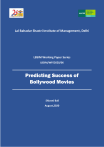 Lal Bahadur Shastri Institute of Management, Delhi LBSIM Working Paper Series LBSIM/WP/2020/06 Predicting Success of Bollywood Movies Shivani Bali August,2020 LBSIM Working Papers indicate research in progress by the author(s) and are brought out to elicit ideas, comments, insights and to encourage debate. The views expressed in LBSIM Working Papers are those of the author(s) and do not necessarily represent the views of the LBSIM nor its Board of Governors. WP/August2020/06 LBSIM Working Paper Research Cell Predicting Success of Bollywood Movies Shivani Bali Abstract India’s entertainment economy is growing rapidly and with half a billion people under the age of twenty-five, the Media and Entertainment (M&E) companies of the world are taking note of it. With favourable demographics and rise in disposable incomes the propensity to spend on leisure and entertainment is growing faster than the economy itself. Indian Hindi Movie industry popularly known as Bollywood has reached staggering proportions in terms of volume of business (220 billion), employment, movies produced (more than 100 in a year) and its reach (more than 100 countries worldwide). The Indian film industry is the most prolific in the world, with more than 1,000 films produced every year in more than 20 languages. Almost 90 percent of revenues are derived from local films leaving English and foreign films with a minority 10 percent market share. With 3.3 billion tickets sold annually, India also has the highest number of theater admissions. With so much at stake and highly uncertain nature of returns, it is of commercial interest to develop a model which can predict the success of a movie. Movies have been described as experience goods with very less shelf life therefore it is difficult to forecast the demand for a movie. There are number of parameters that may influence success of a movie like – time of its release, marketing, lead actors, director, producer, writer, music director – being some of the factors. The present study aims to develop a model based upon Multiple Linear Regression that may help in predicting the success of a movie in advance thereby reducing certain level of uncertainty. Keywords: Predictive modeling, regression, success Predicting Success of Bollywood Movies Introduction The Indian movie industry produces the maximum number of movies per year, higher than any other country’s movie industry. However, very few movies taste commercial success. Given the low success rate, models and mechanisms to predict reliably the ranking and / or box office collections of a movie can help de-risk the business significantly and increase average returns. Various stakeholders such as actors, financiers, directors etc. can use these predictors to make more informed decisions. The study is restricted to Bollywood movies as time and financial constraints were involved. Some of the questions that can be answered using prediction models are given below. 1. What are the major factors that determine the success or ranking of a Bollywood movie? 2. Is the Budget of the Indian movie a key determinant of rank or success? 3. Does social media ratings drive the success of movie? Further, a DVD rental agency or a distribution house could use these predictions to determine which titles to stock or promote respectively. Data from reliable sources from the Internet - Movie Database (IMDB), Bollywoodhumgama.com ratings, critic’s ratings, social media (twitter, face-book etc.) were taken and various data mining and prediction techniques like multi-linear regression, were used to devise a model that can predict an Bollywood movie’s key success factors. 1. Literature review In Hollywood researchers have conducted several studies on the box office or financial performance of movies by primarily adopting psychological or economic approaches (Litman & Ahn, 1998). The psychological approach focused on the individual moviegoer’s decision to choose a movie over other entertainment options and to select particular movies, whereas the economic approach was based on mainly the economic and industrial factors that are determined by the supply side (Litman & Ahn, 1998). Methodologically, psychological studies primarily used survey methods, whereas the economic approach used secondary data. In another study conducted by Chang and Ki (2005) considered the fact that little research had been done on inherent experience good property of movies as there is advantage in using experience good property in that it is closely related to a movie audience’s decision making process. Jack Valenti, president and CEO of the Motion Picture Association of America, once mentioned that “…No one can tell you how a movie is going to do in the marketplace …not until the film opens in darkened theatre and sparks fly up between the screen and the audience”(Valenti,1978). Movies then are something to be experienced and most trade journals and magazines of motion picture Industry concur with the experience that supports the claim of Valenti. The experience good property has two aspects. First, movies are an experience good because individuals choose and use movies solely for the experience and enjoyment (Hirschman & Holbrook,1982; Holbrook & Hirshman,1982). This means that in case of movie goers, consumption experience is an end in itself (Reddy et al, 1998). Also movies are an experience good because individuals do not know what the value of the movie will be to them until they experience it (Shapiro & Varian) Based on work by Litman (1983) and Sochay (1994), creative sphere, scheduling, release pattern and marketing effort were used as categories of independent variables. However an explicit criterion was not suggested for this categorization. Historically neither the creators nor distributors of “cultural products” have used analytics – data ,statistics, predictive modeling – to determine the likely success of their offerings. It’s easy to 