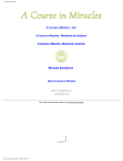 A Course in Miracles A Course in Miracles - Text A Course in Miracles - Workbook for Students A Course in Miracles - Manual for Teachers Miracles Bookstore About A Course in Miracles This is the public domain version of A Course in Miracles. http://acim.home.att.net/2/1/2007 02:51:31 A Course in Miracles - Text - Table of Contents Home Workbook for Students Manual for Teachers A Course in Miracles Text - Table of Contents Introduction Chapter 1 The Meaning of Miracles Chapter 11 God or the Ego Chapter 21 Reason and Perception Chapter 2 The Separation and the Atonement Chapter 12 The Holy Spirit's Curriculum Chapter 22 Salvation and the Holy Relationship Chapter 3 The Innocent Perception Chapter 13 The Guiltless World Chapter 23 The War Against Yourself Chapter 4 The Illusions of the Ego Chapter 14 Teaching for Truth Chapter 24 The Goal of Specialness Chapter 5 Healing and Wholeness Chapter 15 The Holy Instant Chapter 25 The Justice of God Chapter 6 The Lessons of Love Chapter 16 The Forgiveness of Illusions Chapter 26 The Transition Chapter 7 The Gifts of the Kingdom Chapter 17 Forgiveness and the Holy Relationship Chapter 27 The Healing of the Dream Chapter 8 The Journey Back Chapter 18 The Passing of the Dream Chapter 28 The Undoing of Fear Chapter 9 The Acceptance of the Atonement AChapter 19 The Attainment of Peace Chapter 29 The Awakening Chapter 10 The Idols of Sickness Chapter 20 The Vision of Holiness Chapter 30 The New Beginning Chapter 31 The Final Vision http://acim.home.att.net/ACIM-text-contents.html2/1/2007 02:51:34 A Course in Miracles - Workbook for Students - Table of Contents Home Text Manual for Teachers General Introduction Workbook Part One Workbook Part Two Lessons 1 - 50 Introduction 1 2 3 4 5 6 7 8 9 10 11 12 13 14 15 16 17 18 19 20 21 22 23 24 25 26 27 28 29 30 31 32 33 34 35 36 37 38 39 40 41 42 43 44 45 46 47 48 49 50 55 56 57 58 59 60 1. What Is Forgiveness? 221 226 222 227 223 228 224 229 225 230 233 238 234 239 235 240 243 248 244 249 245 250 253 258 254 259 255 260 2. What Is Salvation? 231 236 232 237 First Review - Introduction 51 52 53 54 241 246 Lessons 61 - 80 61 71 62 72 63 73 3. What Is the World? 64 74 65 75 Second Review - Introduction http://acim.home.att.net/workbook_contents.html (1 of 3)2/1/2007 02:51:38 66 76 67 77 68 78 69 79 70 80 242 247 4. What Is Sin? 251 256 252 257 5. What Is the Body? A Course in Miracles - Workbook for Students - Table of Contents 81 82 83 84 85 86 87 88 89 90 Lessons 91 - 110 91 101 92 102 93 103 112 113 94 104 95 105 96 106 97 107 98 108 99 109 100 110 122 132 123 133 263 268 264 269 265 270 114 271 276 272 277 273 278 274 279 275 280 284 289 285 290 294 299 295 300 7. What Is the Holy Spirit? 115 116 117 118 119 120 281 286 282 287 283 288 8. What Is the Real World? Lessons 121 - 140 121 131 262 267 6. What Is the Christ? Third Review - Introduction 111 261 266 124 134 125 135 126 136 127 137 128 138 129 139 130 140 291 296 292 297 293 298 9. What Is the Second Coming? Fourth Review - Introduction 141 142 143 144 145 146 147 148 149 150 301 306 302 307 303 308 304 309 305 310 10. What is the Last Judgment? Lessons 151 - 170 151 161 152 162 153 163 154 164 155 165 156 166 157 167 158 168 159 169 160 170 172 173 174 175 176 177 178 179 180 181 191 182 192 183 193 184 194 185 195 http://acim.home.att.net/workbook_contents.html (2 of 3)2/1/2007 02:51:38 186 196 187 197 188 198 189 199 190 200 313 318 314 319 315 320 322 327 323 328 324 329 325 330 333 338 334 339 335 340 343 348 344 349 345 350 12. What Is the Ego? 331 336 Introduction to Lessons 181 - 200 312 317 11. What Is Creation? 321 326 Fifth Review - Introduction 171 311 316 332 337 13. What Is a Miracle 341 346 342 347 A Course in Miracles - Workbook for Students - Table of Contents Sixth Review - Introduction 201 211 202 212 203 213 204 214 205 215 206 216 207 217 208 218 209 219 210 220 14. What Am I? 351 356 352 357 353 358 Final Lessons Introduction Lessons 361 - 365 Epilogue http://acim.home.att.net/workbook_contents.html (3 of 3)2/1/2007 02:51:38 354 359 355 360 A Course in Miracles A Course in Miracles - Text A Course in Miracles - Workbook for Students A Course in Miracles - Manual for Teachers Miracles Bookstore About A Course in Miracles This is the public domain version of A Course in Miracles. http://acim.home.att.net/index.html2/1/2007 02:51:40 A Course in Miracles - Manual for Teachers - Table of Contents Home Text Workbook for Students A Course in Miracles Manual for Teachers Table of Contents A Course in Miracles Manual for Teachers - Introduction A Course in Miracles Manual for Teachers - Section _1 - Who Are God's Teachers? A Course in Miracles Manual for Teachers - Section _2 - Who Are Their Pupils? A Course in Miracles Manual for Teachers - Section _3 - What Are The Levels of Teaching? A Course in Miracles Manual for Teachers - Section _4 - What Are The Characteristics of God's Teachers? A Course in Miracles Manual for Teachers - Section _5 - How Is Healing Accomplished? A Course in Miracles Manual for Teachers - Section _6 - Is Healing Certain? A Course in Miracles Manual for Teachers - Section _7 - Should Healing Be Repeated? A Course in Miracles Manual for Teachers - Section _8 - How Can Perception of Order of Difficulties Be Avoided? A Course in Miracles Manual for Teachers - Section _9 - Are Changes Required In The Life Situation of God's Teachers? A Course in Miracles Manual for Teachers - Section 10 - How Is Judgment Relinquished? A Course in Miracles Manual for Teachers - Section 11 - How Is Peace Possible in this World? A Course in Miracles Manual for Teachers - Section 12 - How Many Teachers of God Are Needed To Save the World? A Course in Miracles Manual for Teachers - Section 13 - What Is The Real Meaning of Sacrifice? A Course in Miracles Manual for Teachers - Section 14 - How Will the World End? A Course in Miracles Manual for Teachers - Section 15 - Is Each One To Be Judged in The End? A Course in Miracles Manual for Teachers