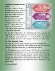 Theological Virtues and Cardinal Virtues A virtue is a habitual and firm disposition to do good. It allows a person not only to perform good acts but also to give the best of himself/herself. The term “virtue” comes from the Latin virtus, meaning “courage” or bravery” especially that of a soldier. Virtus is derived from vir which means “man”. Hence, literally speaking, virtue means “manliness” The Catechism of the Catholic Church (CCC) classifies virtues as either theological of human. The theological virtues are faith, hope and charity (love) while the human virtues (also called moral virtues) include, among others, the four cardinal virtues of prudence, justice, fortitude, and temperance. The Three Theological Virtues The theological virtues relate directly to God. Their immediate object is God. They dispose Christians to live in a relationship with the Holy Trinity. They have the on and triune God for their origin and motive. The Theological virtues are the foundation of all Christian moral activities; they animate these activities and give them their special characters. The theological virtues inform and give life to all the moral virtues. They are infused by God into the souls of the faithful to make the latter capable of acting as His children and of inheriting eternal life. These virtues are the pledge of the presence and action of the Holy Spirit in the faculties of the human being. The Virtue of Faith Faith is the theological virtue by which we believe in God and all that he said and revealed to us—and all that the Holy Church proposes for our belief—because he is the truth Himself. Vatican II’s document Dei Verbum states that by faith, one freely commits his /her entire self to God. (#5). For this reason, the believer seeks to know and do God’s will: “The righteous shall live by faith. Living works through charity” (Rom. 1:17; Gal. 5:6). The disciple of Christ must not only keep the faith and live it but also profess it, confidently bear witness to it and spread it: “All whoever must be prepared to confess Christ before men and to follow Him along the way amidst the persecutions which the cross never lacks” (LG, 42). Service and witness to the faith are necessary for salvation: So everyone who acknowledges me before men, I also will acknowledge before my father who is in ; but whoever denies Me before men, I will also deny before My Father in who is in heaven” Tim. 3:6-7). Faith is a personal encounter with Christ who invites a person into an intimate relationship with God. Since “belief seems to have grown outmoded in the life and language of our “modern” world because it sounds naïve, every Christian, therefore, should confront himself/herself with the question: What do I really mean when I confess that I believe.” Faith involves the whole person and occupies the center of one’s life. Sometimes an individual is so preoccupied with things that condition his/ her life. These are presented to him/her as absolute concerns that demand a total giving of himself/herself. Examples of these concerns are food, shelter, and health. Faith must be understood in this concept of ultimate concerns. Thus, a person needs to discern what constitutes his\her ultimate preoccupation. He/she needs to know what is absolute from what is merely relative, authentic faith from idolatrous faith. Faith does not mean that one should believe without a reason. We believe because there are signs of credibility. The first step to faith is to understand the credibility of God—the God revealed in history and in Jesus. The document Dei Verbum clarifies this point. It states: “In his goodness and wisdom, God chose to reveal Himself and to make known to us the hidden purpose of his will… Through this revelation, therefore, the invisible God, out of abundance of His love speaks t men as friends and lives among them, so that he may invite and take them into fellowship with Himself” (#2). In faith, God takes the initiative. He manifests himself through signs, words, and deeds. These signs are not imposed. These are invitations, or vocations. Grace calls and demands the answer of faith to be as such. The Virtue of Hope Hope is the theological virtue by which we desire the kingdom and eternal life as our happiness, placing our trust in Christ’s promises and relying not on our strength but on the help of the grace of the Holy Spirit. St. Paul exhorts us: “Let us hold fast the confession of our hope without wavering, for he who promise d is faithful” (Heb. 10:23). Meanwhile, in this letter to Titus, St. Paul states: “The Holy Spirit… He poured out upon us richly through Jesus Christ our savior, so that we might be justified by His grace and become heirs in hope of eternal life” (Tim. 3:6-7) The virtue of hope keeps a person from discouragement, sustains him/her during times of abandonment, and opens his/her heart in expectation of eternal beatitude. Buoyed up by hope, the person is preserved from selfishness and led to the happiness that flows from charity. The New Testament is so rich with teaching s about hope: “Hoping against hope, Abraham believed, and thus became the father of many nations.” (Rom. 8: 18) Through the merits of Jesus Christ and of his passion, God keeps us in the hope that does not disappoint.” (Rom. 5: 5) Hope is a weapon that protects us from struggle for salvation: “Let us… put on the breastplate of faith and charity, and the helmet of hope of salvation” (1Thes. 5: 8). We can, therefore, hope in the glory of heaven promised by God to those who love Him. And do his will. In every circumstance, each one of us should hope, with the grace of God, to persevere to the end and obtain the joy of heaven—God’s eternal reward for the good works ac- complished with the grace of Christ. Hope is the virtue, made possible by grace of God, by which man/woman expects the fullness of salvation and the means to attain it, confident of t