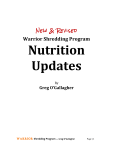 WARRIOR Shredding Program — Greg O’Gallagher Page | 1 Copyright Notice This information is for your personal use ONLY. You cannot distribute, copy, reproduce, or otherwise sell this product or information in any form whatsoever, including but not limited to: electronic, or mechanical, including photocopying, recording, or by any informational storage or retrieval system without expressed written, dated and signed permission from the author. All copyrights are reserved. Disclaimer and/or Legal Notices First of all, I’m not a doctor so the information contained in this product is by no means meant to be taken as medical advice. Furthermore, the information provided in this book is for educational purposes only. The information presented to you in this book is based off of the personal experiences of the authors, as well as from current research and data. The advice and tips given in this course are meant for healthy adults only. Before performing anything stated in this product, you should consult your physician to ensure the information provided is appropriate for your individual circumstances. If you have any health issues or pre-­‐existing conditions, please consult with your physician before implementing any of the information provided in this course. This product is for informational purposes only and the author does not accept any responsibilities for any liabilities or damages, real or perceived, resulting from the use of this information. WARRIOR Shredding Program — Greg O’Gallagher Page | 2 – New & Updated – The Warrior Shredding Program Nutrition Updates Since releasing the Warrior Shredding Program close to two years ago, I have seen hundreds upon hundreds of amazing transformations! I have received thousands of emails and comments from people thanking me for creating such an effective course. Since the program was working so well, part of me thought, “If it’s not broke, don’t fix it. Don’t change a thing.” Yet, I still feel compelled to update it. Why? …Well, because I want to do my absolute best to allow you to achieve the physique of your dreams. And if I can help improve that, I’m going to do it. Now granted, the new macros laid out in this guide are not necessary at all. You can stick to the original guide as is and get amazing results. And we’re not going to be making that many changes. The most significant difference is as follows: WARRIOR Shredding Program — Greg O’Gallagher Page | 3 New Calories If you have 15 pounds of fat or less to lose – set calories at 12 calories per pound of bodyweight. If you have more than 15 pounds of fat to lose – set calories at 12 calories per pound of GOAL bodyweight. The reason we’re using goal bodyweight for people that have more fat to lose is for two reasons: The first is that people that have more fat to lose can handle bigger calorie deficits. This comes down to more fat availability. The second: if you have more fat, the additional body fat does not contribute to your energy expenditure as much as lean body mass. So using goal bodyweight ensures that we don’t set calories too high. Since maintenance calories proportionate to ones bodyweight will be lower for people that have more body fat. Lean body mass is more metabolically active than body fat. New Macros Fat -­‐ 30% of total calories Protein -­‐ 30% of total calories Carbs -­‐ 40% of total calories So really the only change we’re making is bringing protein from 40% of calories down to 30%, and carbs from 30% of total calories up to 40%. WARRIOR Shredding Program — Greg O’Gallagher Page | 4 The reason is because research is clear that the maximum amount of protein needed is about 0.82g per pound of bodyweight. Some studies even point to a lower intake than this – and if you have a lot of fat to lose, this number should be even lower. So by using 30% of calories for protein, you meet your protein needs while allowing for more room for carbs. Carbs are important in promoting testosterone, mood and optimal sleep. As well, I know some people don’t like having to eat a ton of protein. So this strategy will be more balanced and better support training and hormonal functioning. New Macros for Refeed days (15 calories per pound of bodyweight) Fat -­‐ 25% of total calories Protein -­‐ 25% of total calories Carbs 50% of total calories New Meal Set up The advantage of eating a higher intake of protein was that you could fill up on big servings of meat to stay full. Since we’re going lower in protein, we can adjust the meal plan so you can still enjoy big servings of meat. If you want to get rid of the small meal, you can ! You can eat just two big meals per day and a couple servings of fruit when you get hungry. WARRIOR Shredding Program — Greg O’Gallagher Page | 5 Example #1: • Wake up 8am • Fruit at 1pm • Lunch at 2 or 3pm • Fruit at 6pm • Dinner at 8pm The two servings of fruit will make eating two meals per day a walk in the park! Another cool strategy you can use is to break up the protein and carbs from one of your meals. This will make it seem like you’re eating a lot more and you’ll be able to stay full and satisfied longer Example #2: • Wake up 8am • Fruit at 1pm • Lunch at 2 or 3pm • Dinner at 7pm (just meat and veggies) • Carbs at 9pm (potato wedges, pop chips or frozen yogurt ice cream with chocolate chips) The second example is actually my favorite diet approach. Since breaking up the protein and carbs from my dinner meal, I find it so easy to eat at a calorie deficit. New WSP Lesson #1 Don’t obsess about the macronutrients or hitting them exactly. Just try to be in the ballpark. Some people will be able to lean down without ever having to worry about tracking things exactly. WARRIOR Shredding Program — Greg O’Gallagher Page | 6 This is amazing! The best approach would be to track your macros for the first couple weeks, so you get the feel for it. Then just start eye ballin